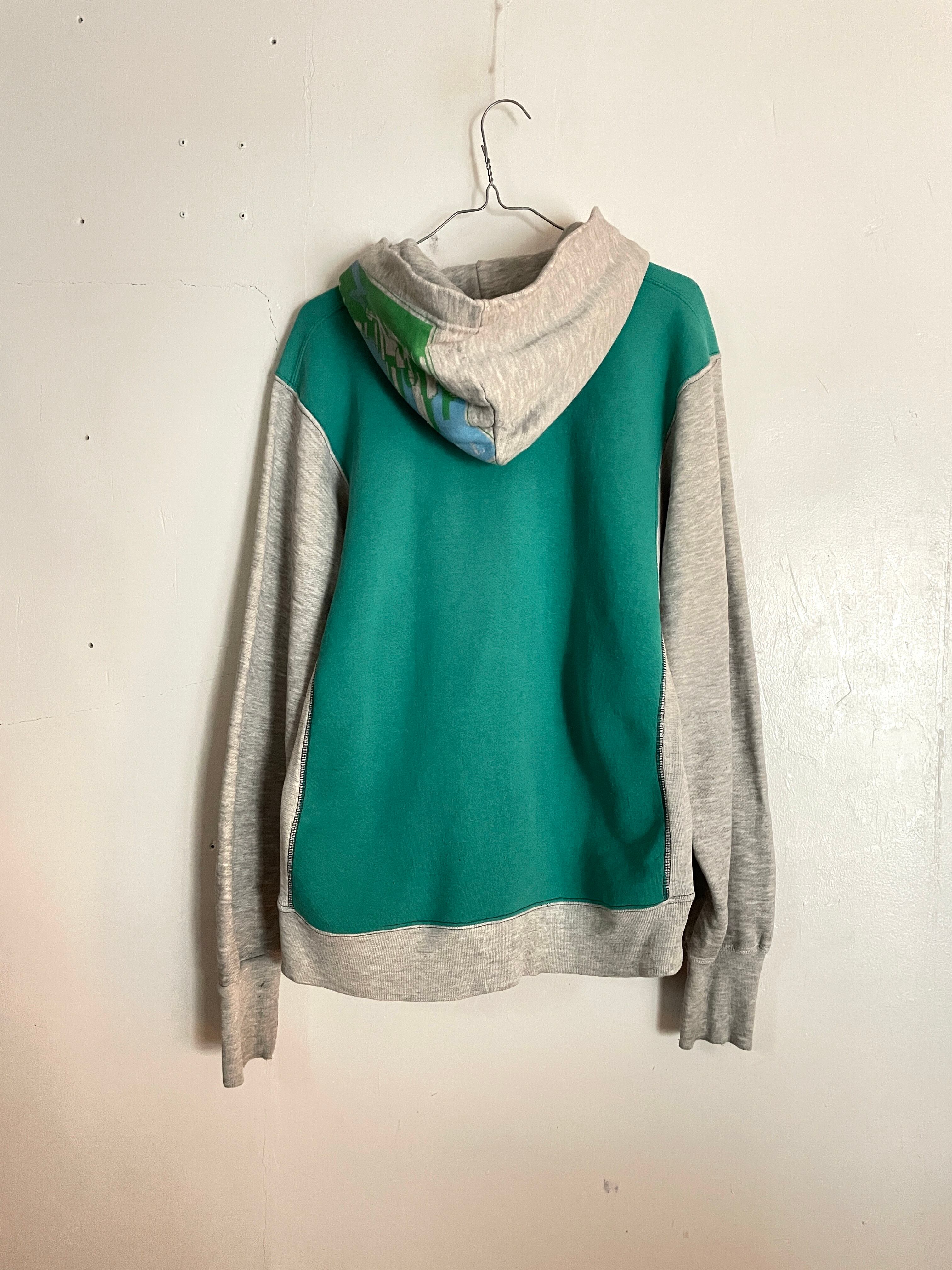 90年代のチャンピオンリバースウィーブをベースに、ジップや違う色のボディを組み合わせて作られた、リメイクフルジップパーカー。ボディ部分はグリーンで、その他の部分にグレーを使ったアイデアに富んだ一着です。フードのプリント部分も違うものから持ってきていることがわかります。縫い目部分の縫製に若干の甘さがあるのも、このアイテムならでは。まさに唯一無二のアイテムです。