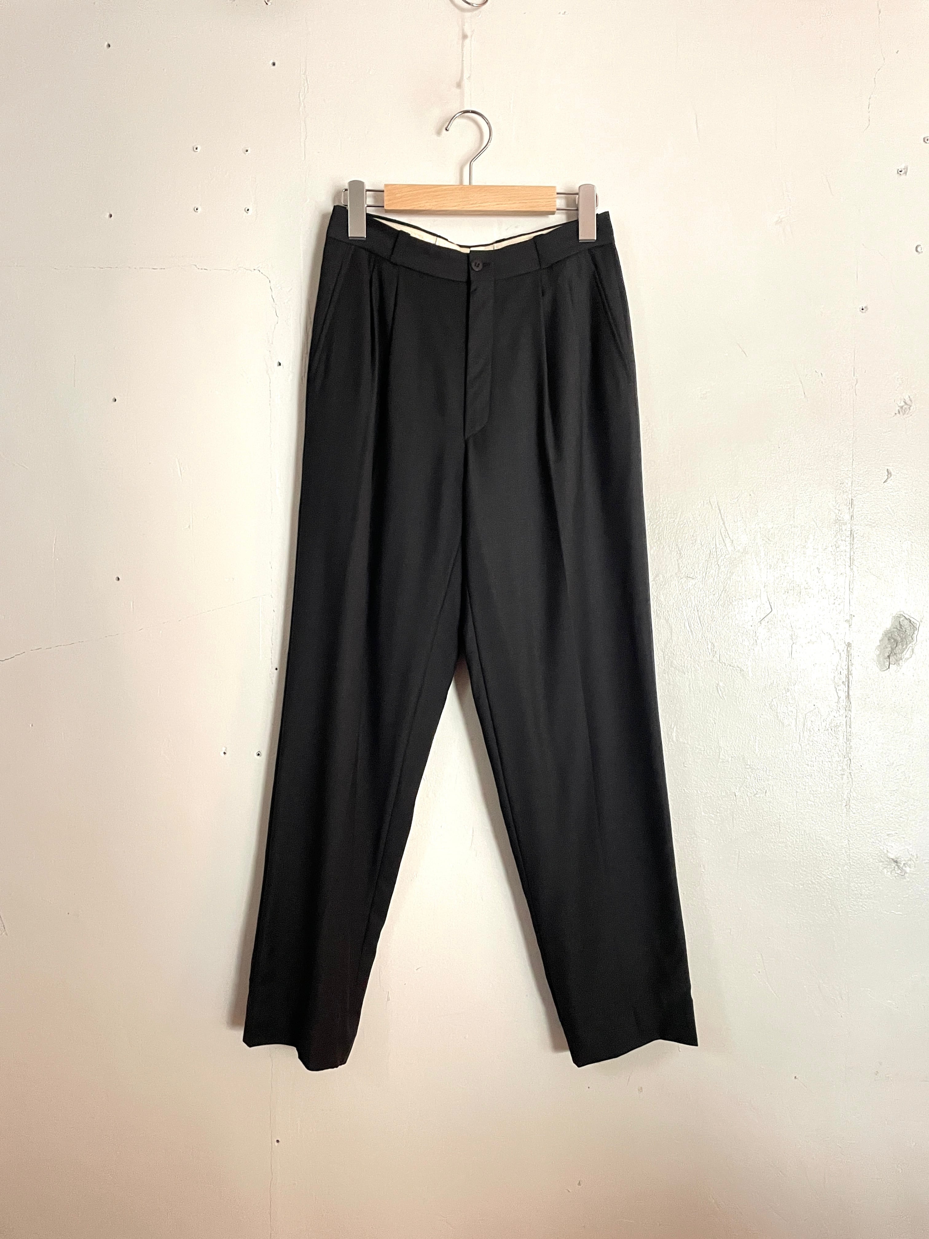 ウエストに2タック、センタープリーツが入った綺麗なテーパードシルエットのスラックス。柔らかい素材感で履き心地が良く、全体のバランスが非常に良いです。ウエストはややタイトめなため、どちらかといえばレディース仕様。4ポケットでシンプルなデザインは、派手さは無いもののどんなアイテムとも相性抜群です。コンディションもとても良く、持っていて損はない優等生アイテム。イタリア製。
