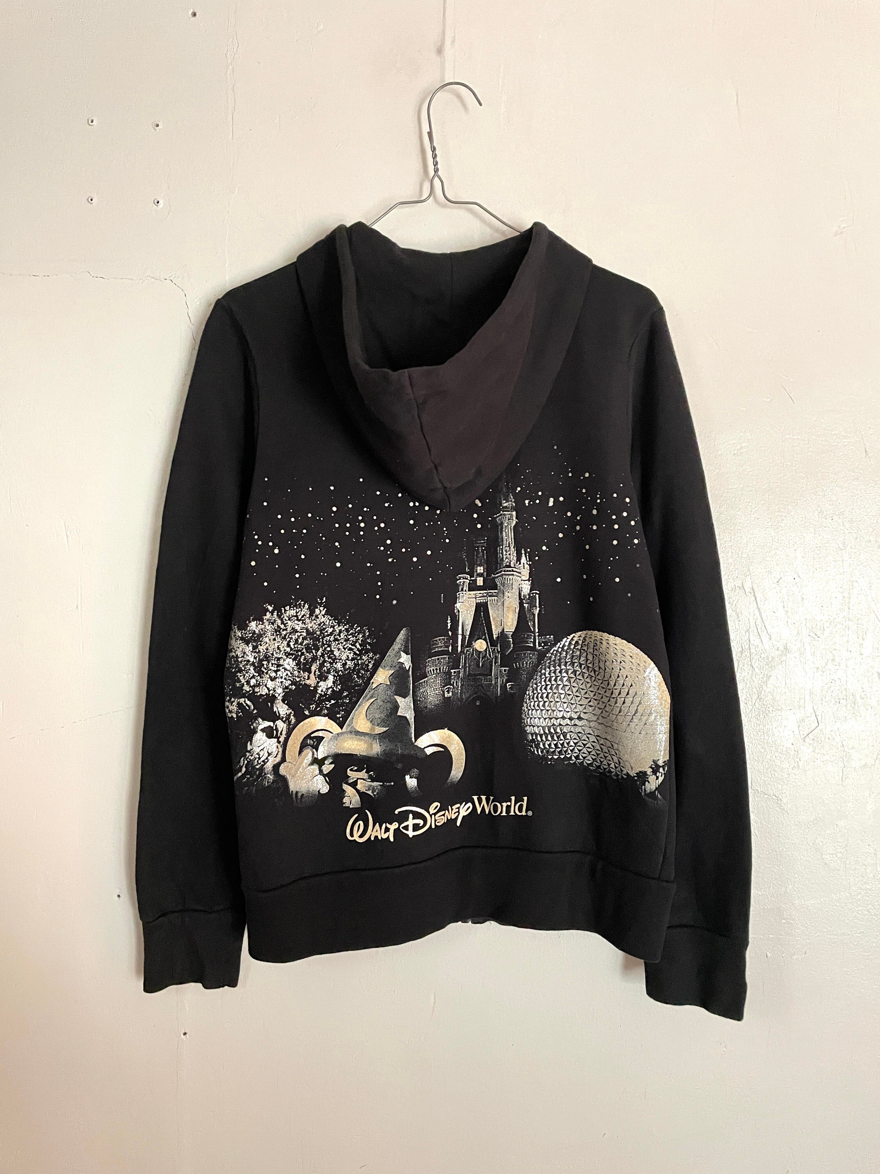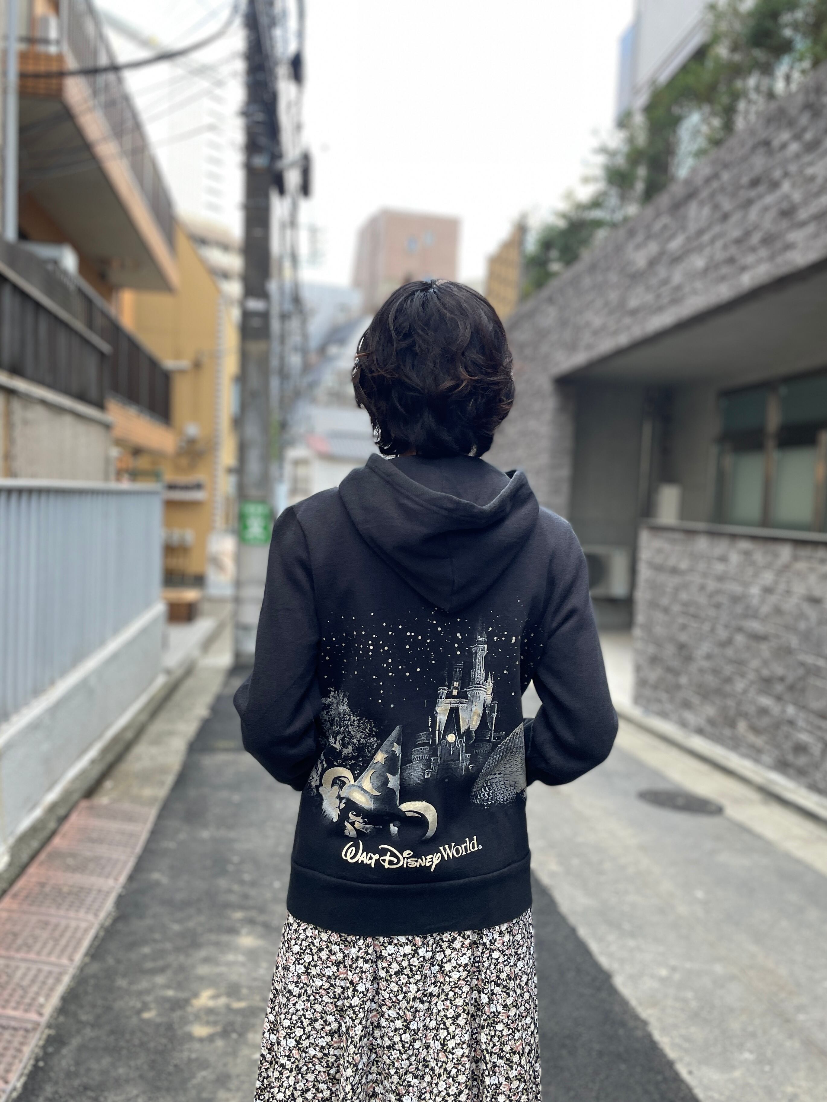 ディズニーワールドのフルジップパーカー。前はシンプルなワンポイントロゴ、背中にはシンデレラ城など園内の建物が大きくプリントされています。部分的にラメが使われ、キラキラしているのもポイント。モノトーンでシンプルにまとめたデザインにセンスを感じます。フルジップタイプのためいろんな着回しができて便利です。