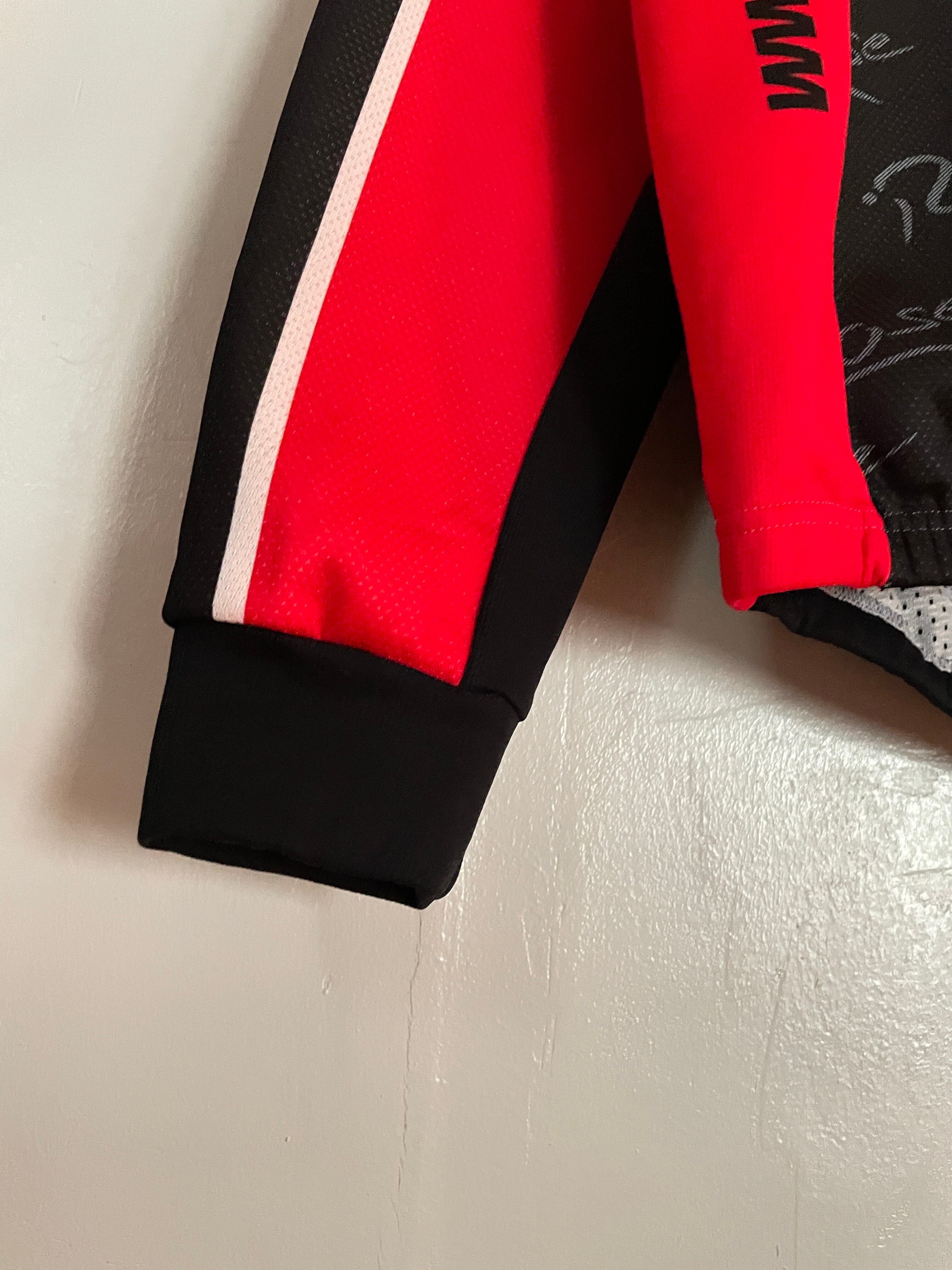 赤を基調に黒の差し色が効いたサイクリンジャージ。ネックがやや高めのフルジップタイプです。プリントされている「ROSE VERSAND」は、ドイツのボホルトという都市にあるロードバイクショップのようです。裾にはゴムが入ってやや絞りが効いています。後ろ裾部分にはジップポケット付き。一枚ではもちろん、これからの時期はジャケットのインナーとして使うことで、コーディネートにいいアクセントを与えてくれそうです。