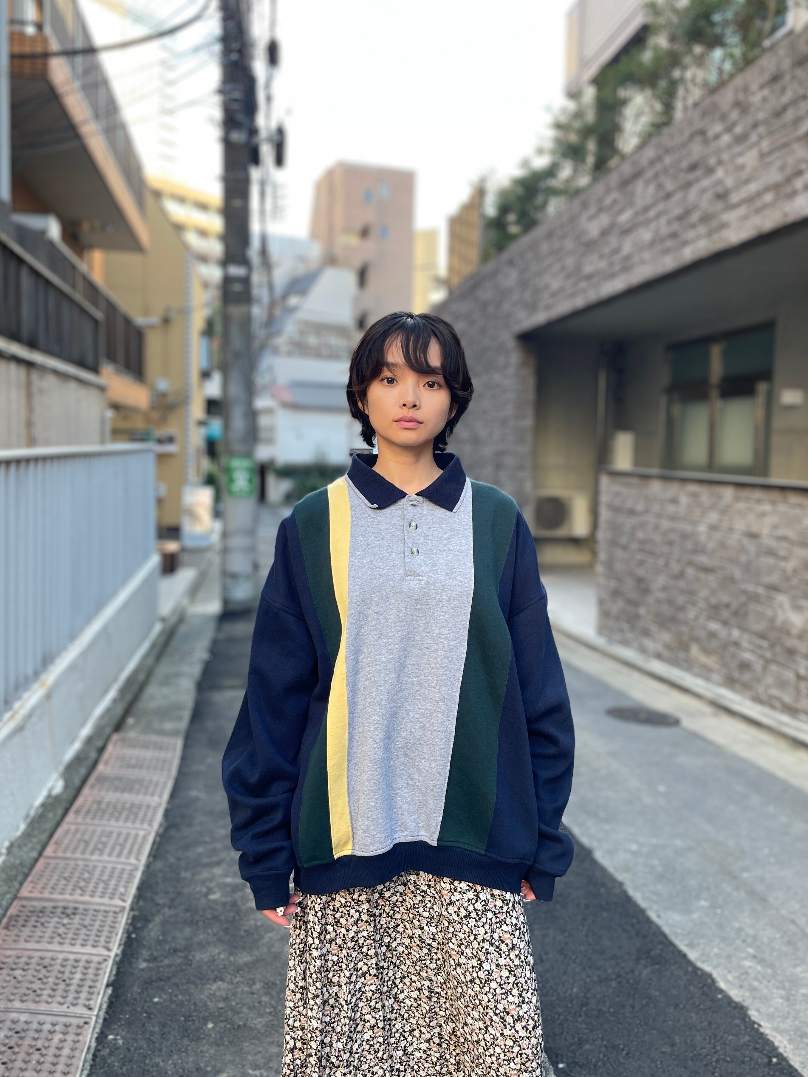 グレー、イエロー、グリーン、ネイビーが縦に並ぶ、切替えデザインがお洒落なピエール・カルダンのポロスウェット。背中はほとんどグレーを使っていて、控えめながらしっかり個性を出せるデザインになっています。ややゆったり目のシルエットで、男性、女性どちらにもオススメな一着です。