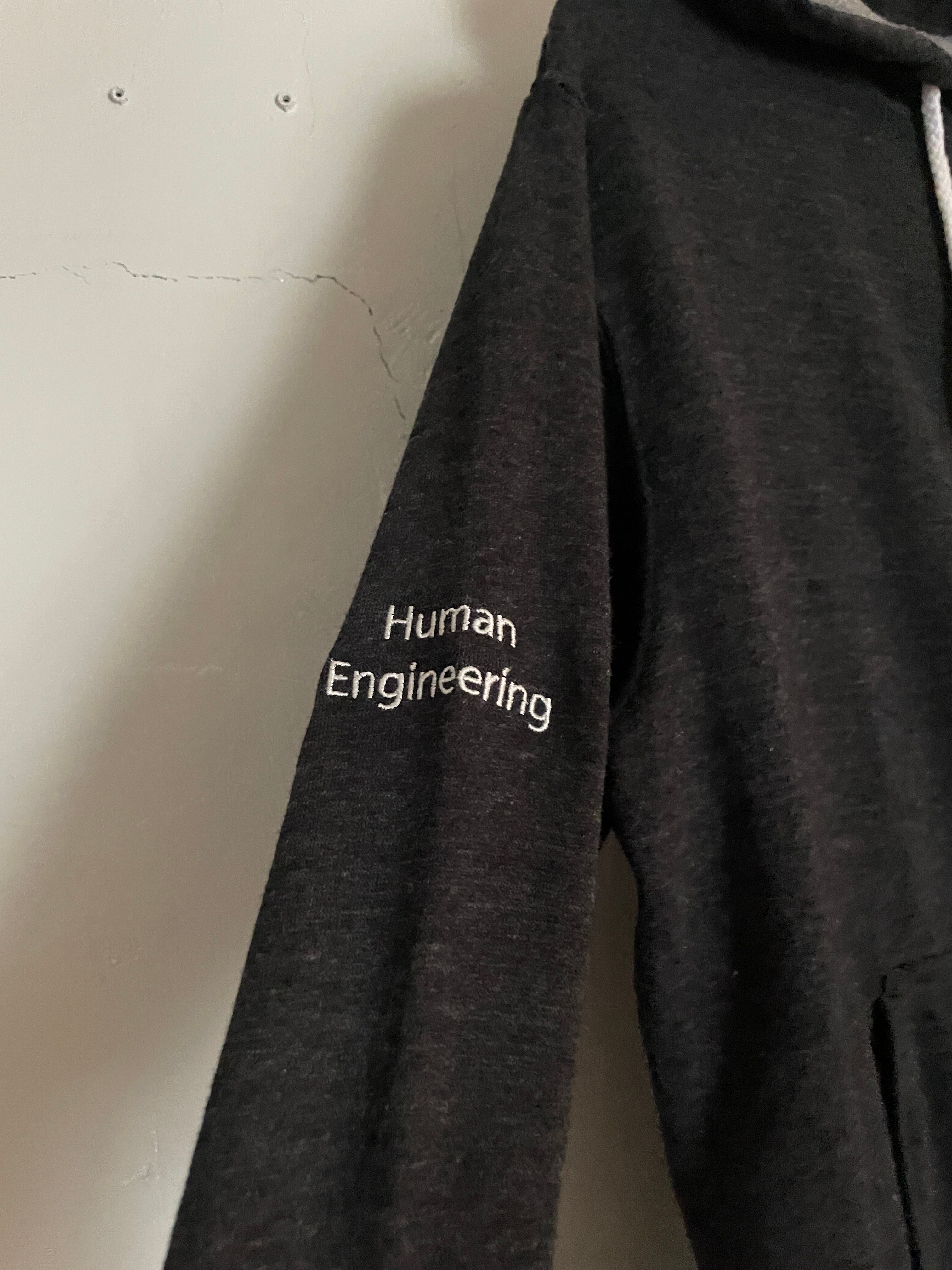 ダークグレーボディーに、ワンポイントでアップルの刺繍が施されたジップパーカー。かなりシンプルで使いやすいディテール。コットンポリの肌触りの良い素材感。紐だけ白なのも良いですよね。インナーとしても活躍してくれる1着です。