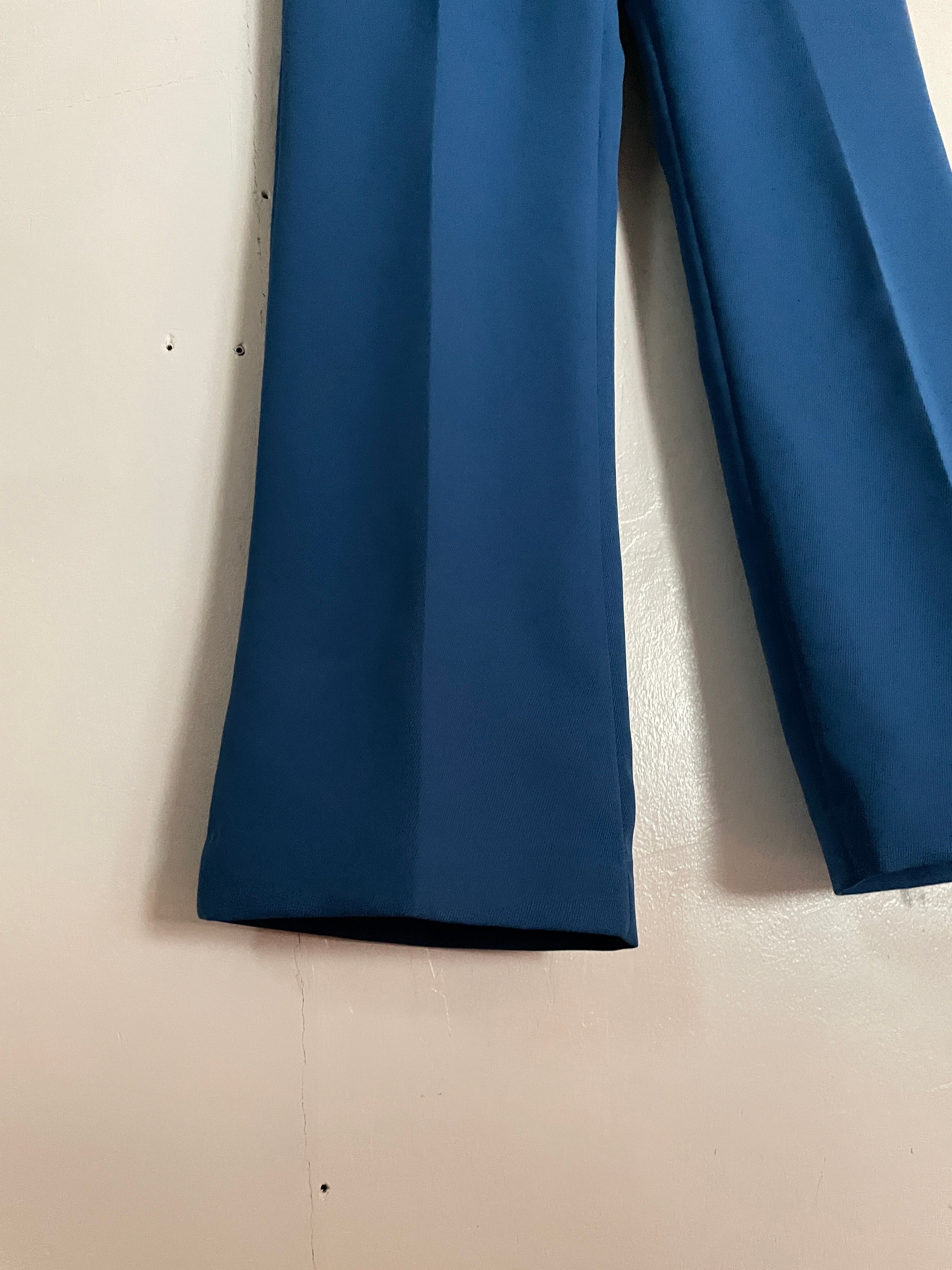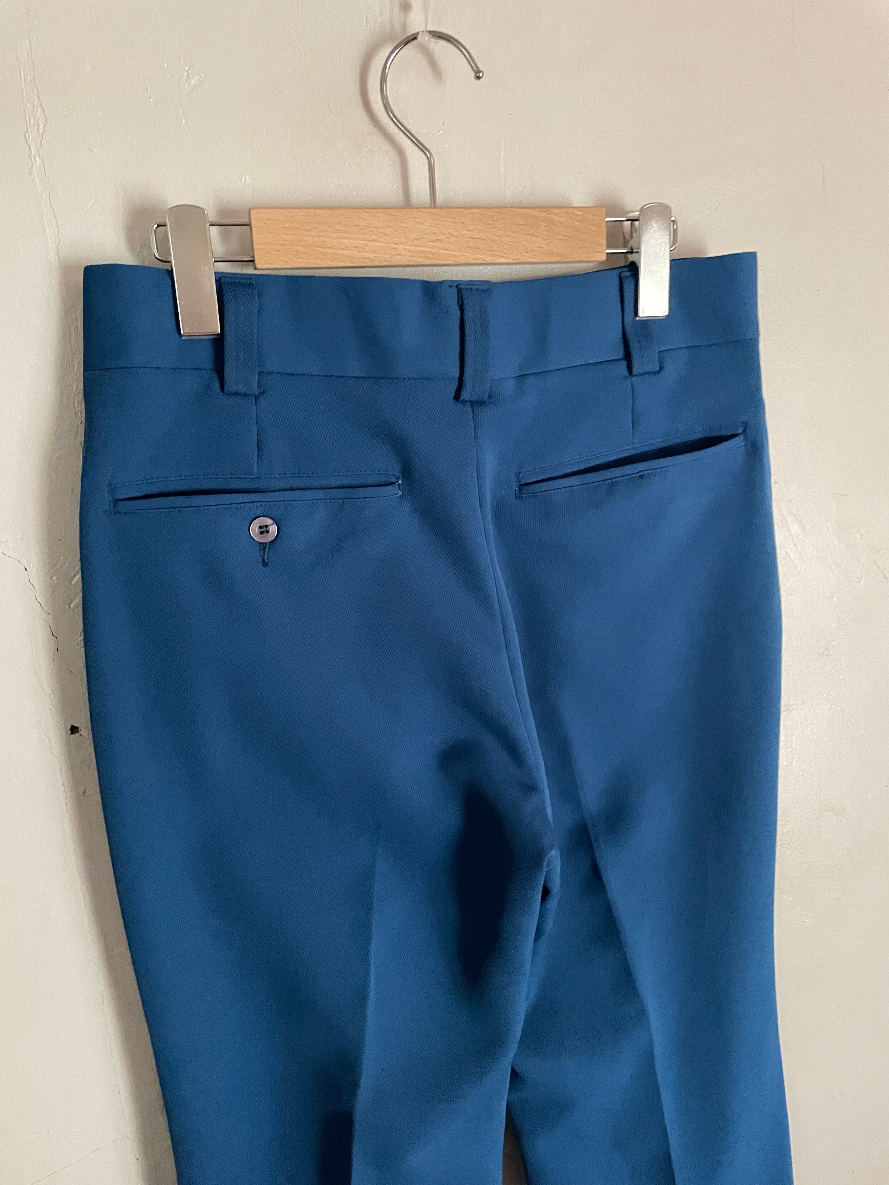 鮮やかなブルーカラーで、絶妙なフレアシルエットが魅力的なスラックス。70年代の雰囲気が感じられるシルエットです。綺麗なブルーカラーはファッションの主役を張ってくれます。伸びが良く履きやすいポリ素材。カラーパンツは一本持っておくとかなり活躍してくれます。