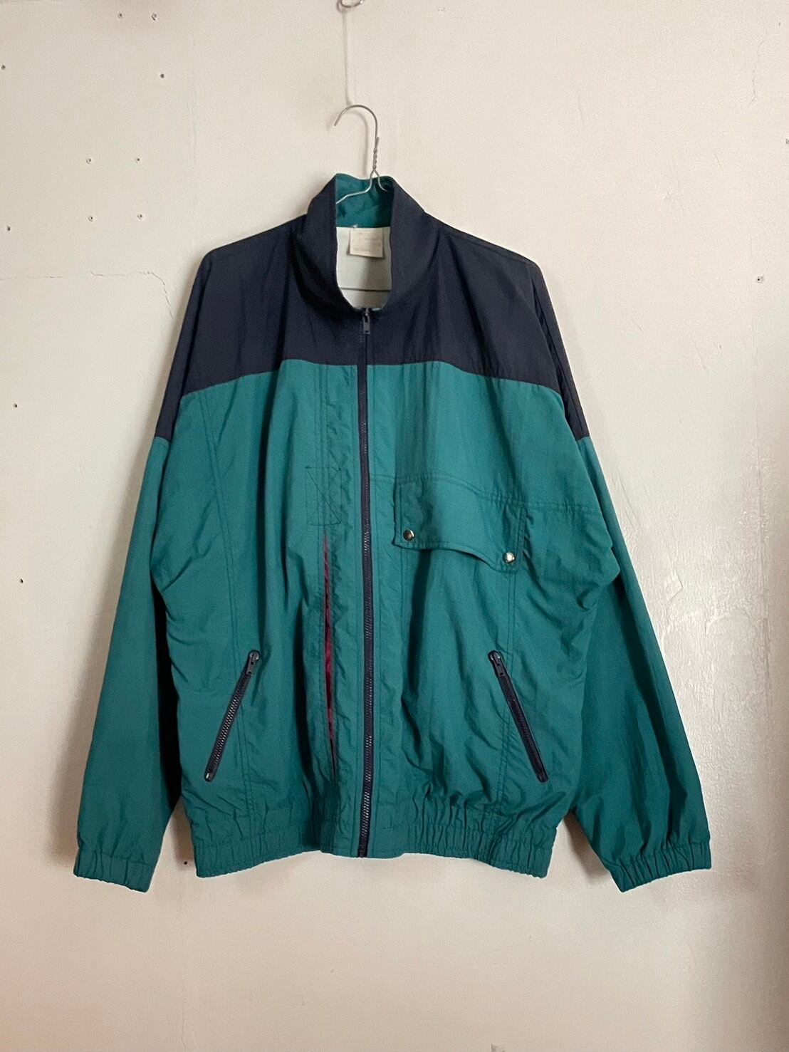 グリーンボディに肩周りと襟がネイビーで切替えられたデザインジャケット。フロントのアシンメトリーなデザインが特徴的で、右側切替え部分にマチが挟まっており、そこだけ赤が使われていてチラリと見える良いアクセントになっています。左ポケットのジップが部分的に欠けていますが、開閉可能です。