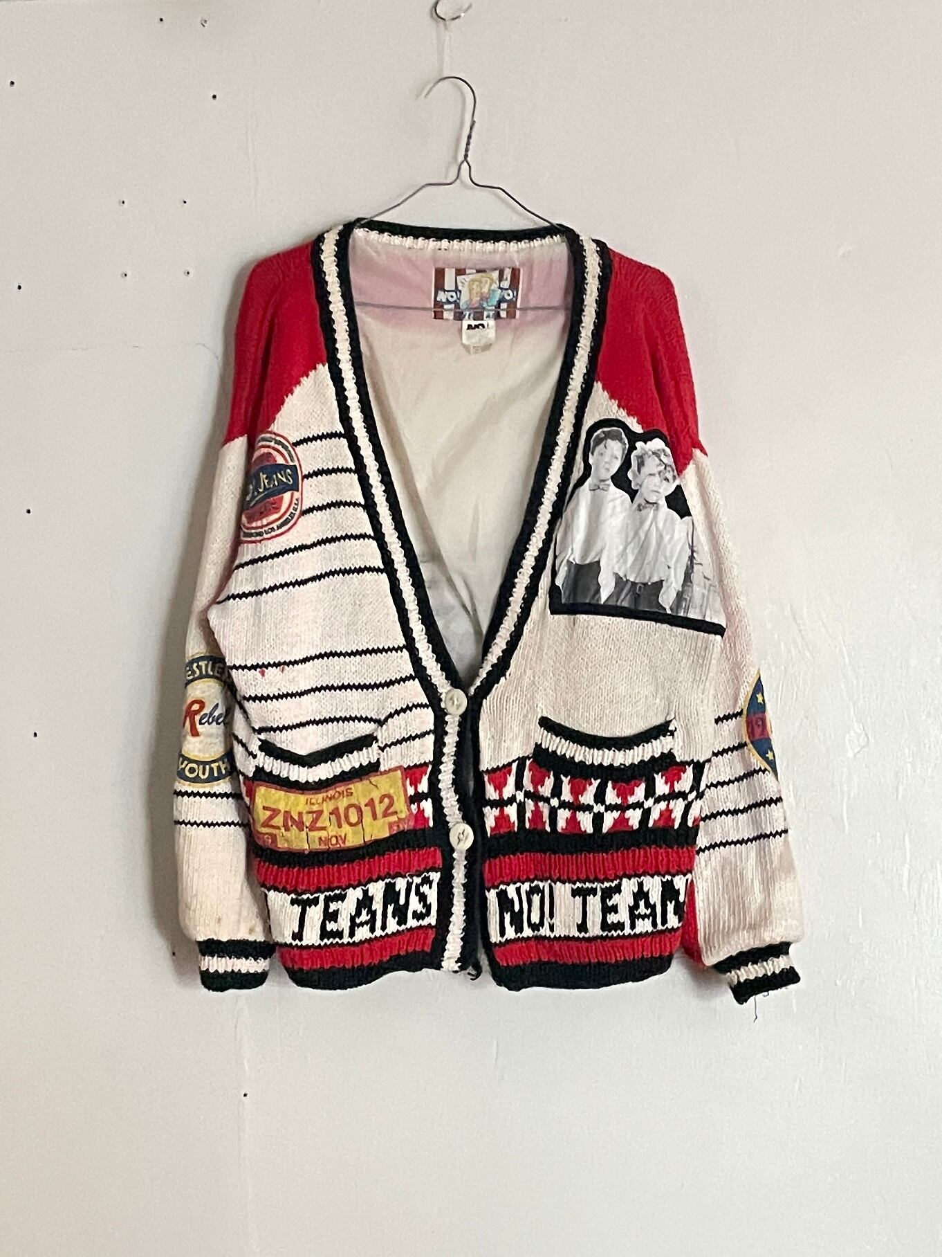 ホワイト、レッド、ブラックの3カラーをベースに、フォトやプリントワッペンなどが全体に施された、ニットカーディガン。文句無しで雰囲気抜群の一着です。フォトの位置、落書き感のあるプリントワッペンなどからセンスが感じられます。厚みのあるしっかりとした素材感。ゆったりと着られるサイズ感なので、インナーにも着込めてアウターとしても活躍してくれます。ファッションの主役になってくれるアイテムです。