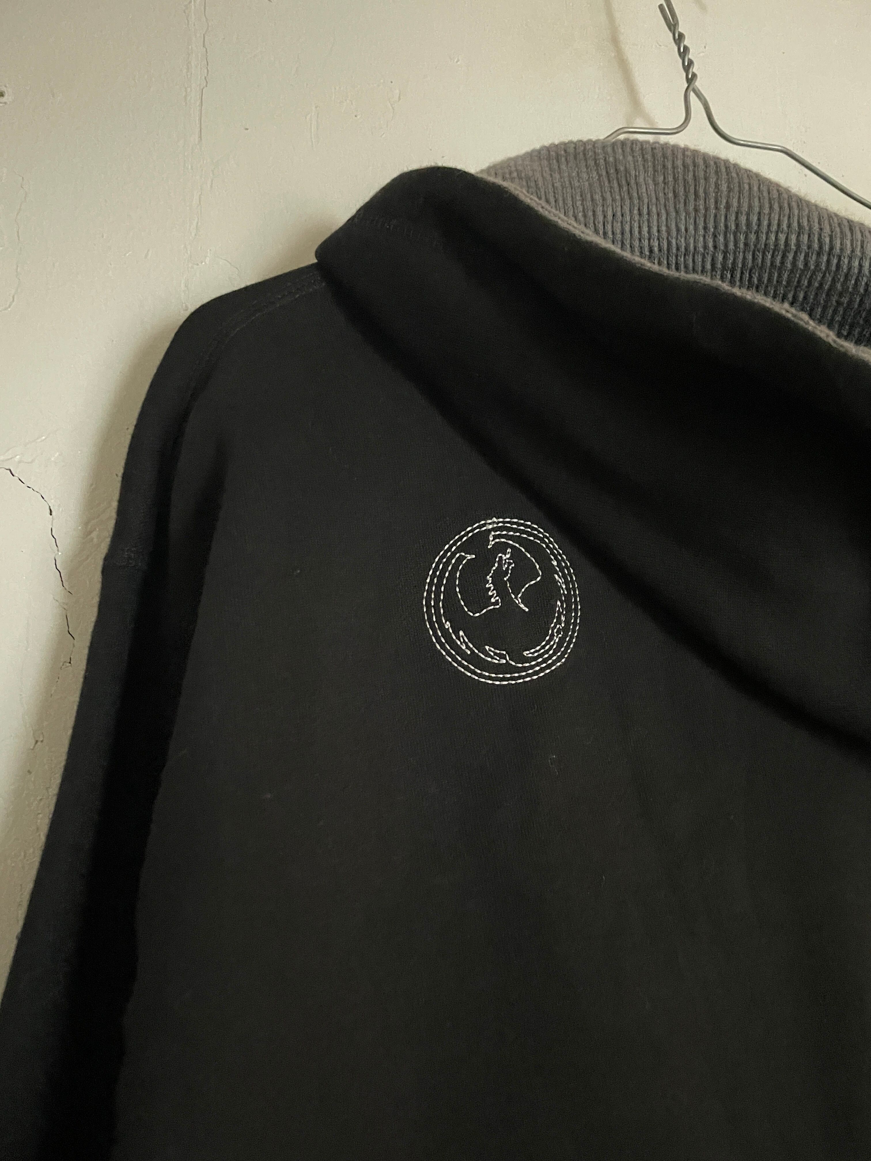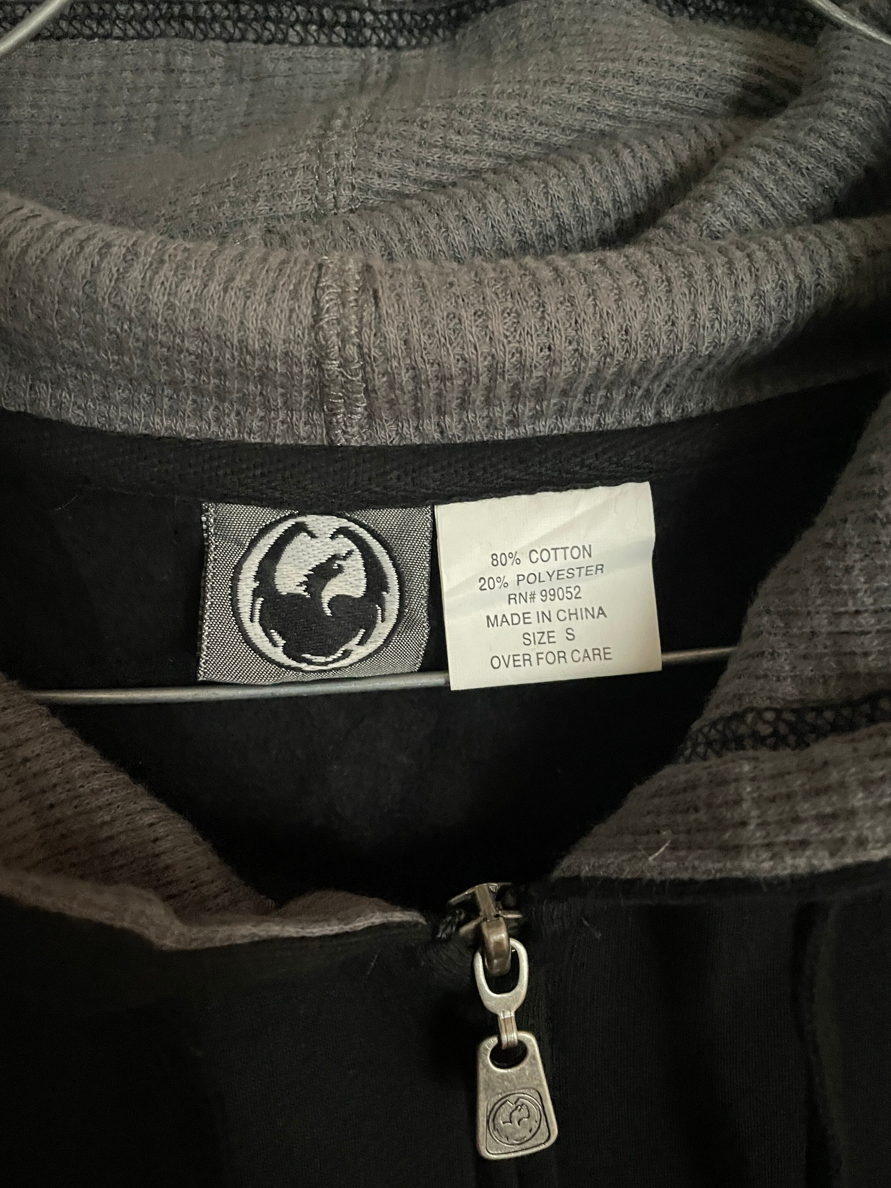 Y2Kノリなワッペン、プリントが施された、フルジップパーカー。左胸にインパクトのあるドラゴンワッペン。上からは「ドラゴン」とブルーネームプリントが施されています。バックの左肩部分にはさりげない刺繍。グレーの切り替えもグッドです。フード裏はサーマル仕様。表記はSですが、ゆったりとしたサイズ感です。男女問わずおすすめしたい一着です。バック部分に小さな穴が見られます。