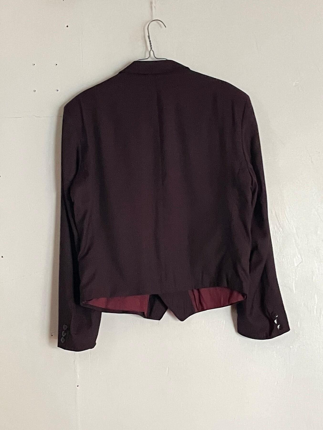 パープルとワインレッドが混ざったような、色気の感じられる色味のショートテーラードジャケット。よく見ると細かな柄デザインが全体に施されています。極端に短い丈に対して、ゆとりのある身幅。今っぽさのあるシルエットなのがグッドです。裏地はサラッとしたレーヨン素材で、光沢のあるワインレッド。インナーでレイヤードなどでも遊べそうなお洒落な一着です。