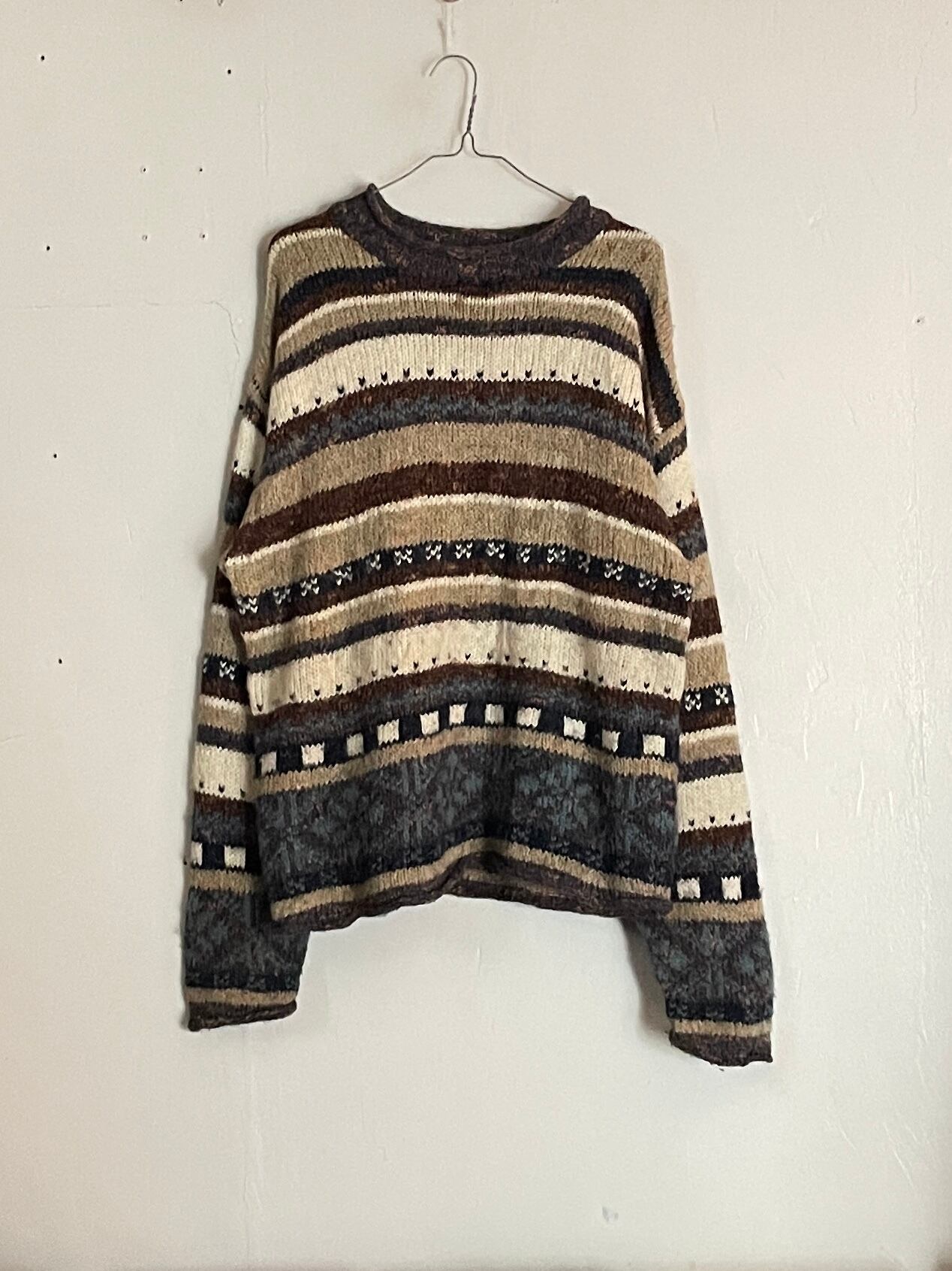 様々な色で柄が表現されている、ニットセーター。ネック、袖口、裾部分のくるっと丸まったデザインも可愛らしいです。細かな編み込みから、どこかハンドメイド感のあるディテールです。程良い着丈に対して、袖は長め。厚手過ぎず、薄過ぎない生地感なので、これからの季節インナーの差し色としても活躍してくれそうです。