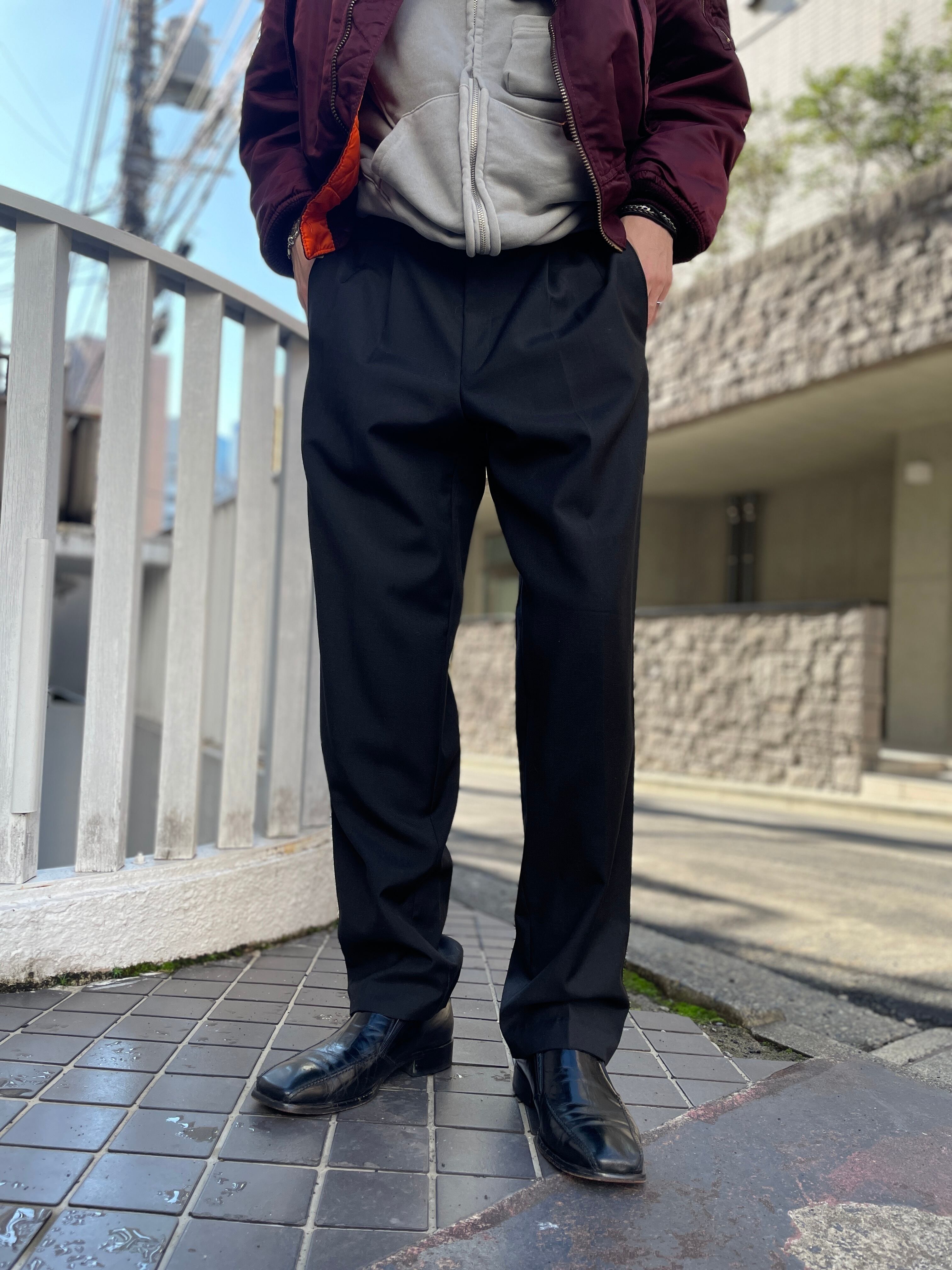光沢のあるブラックカラーのスラックス。2タックでややテーパードがかったワイドシルエット。シンプルで癖のない一番使えるパンツかと思います。サラッとした素材感で履きやすさも抜群です。一本持っておくとかなり重宝するかと思います。