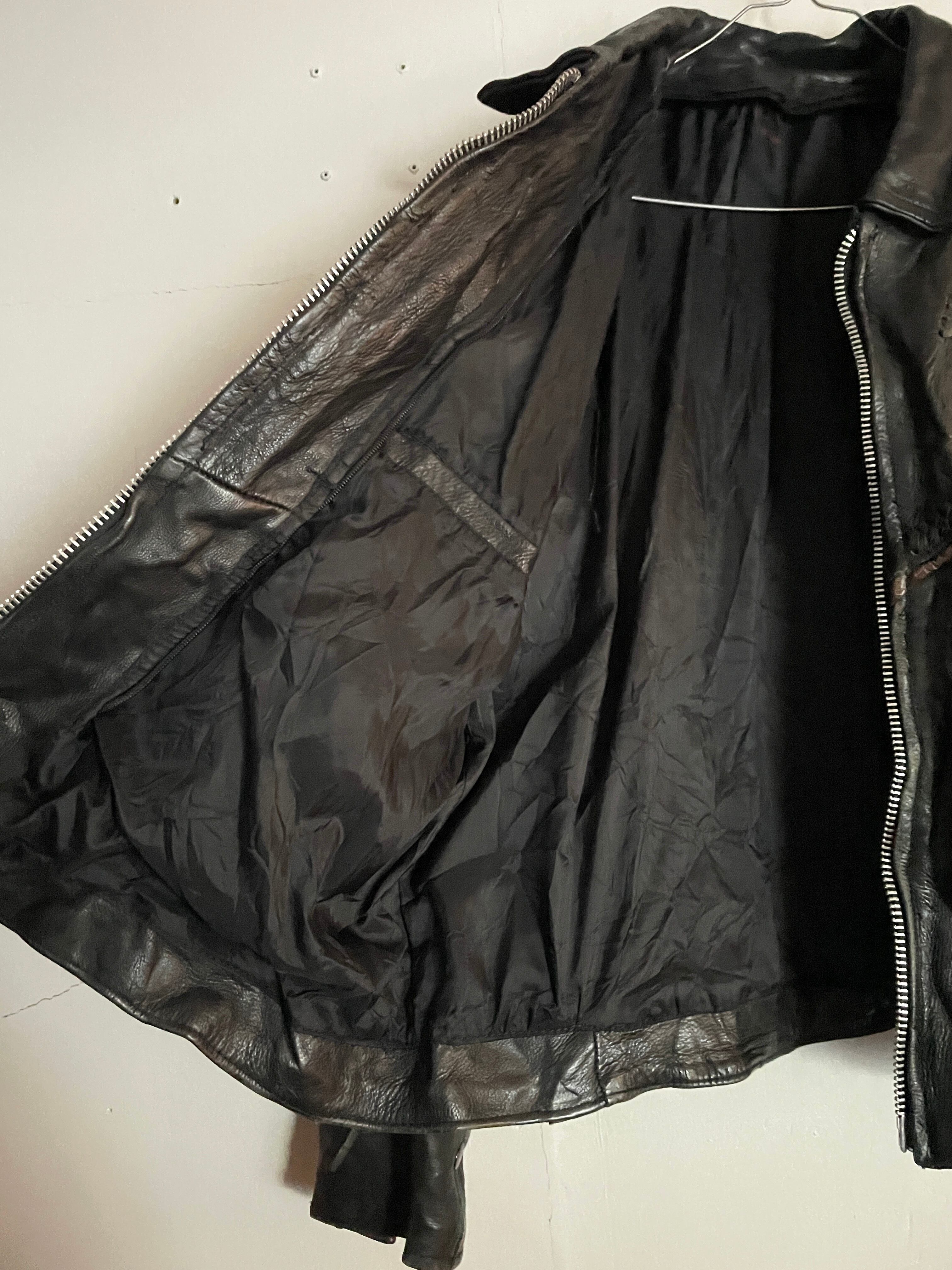 ヒラヒラ揺れるフリンジや、編み込みデザインがインパクトのあるレザージャケット。所々ビーズを使った矢印の柄があしらわれ、良いアクセントになっています。やや短丈気味で、程良い襟の大きさ、民族調のイメージも感じさせる、目を惹くインパクトのあるジャケットです。左袖口のジップが破損しています。