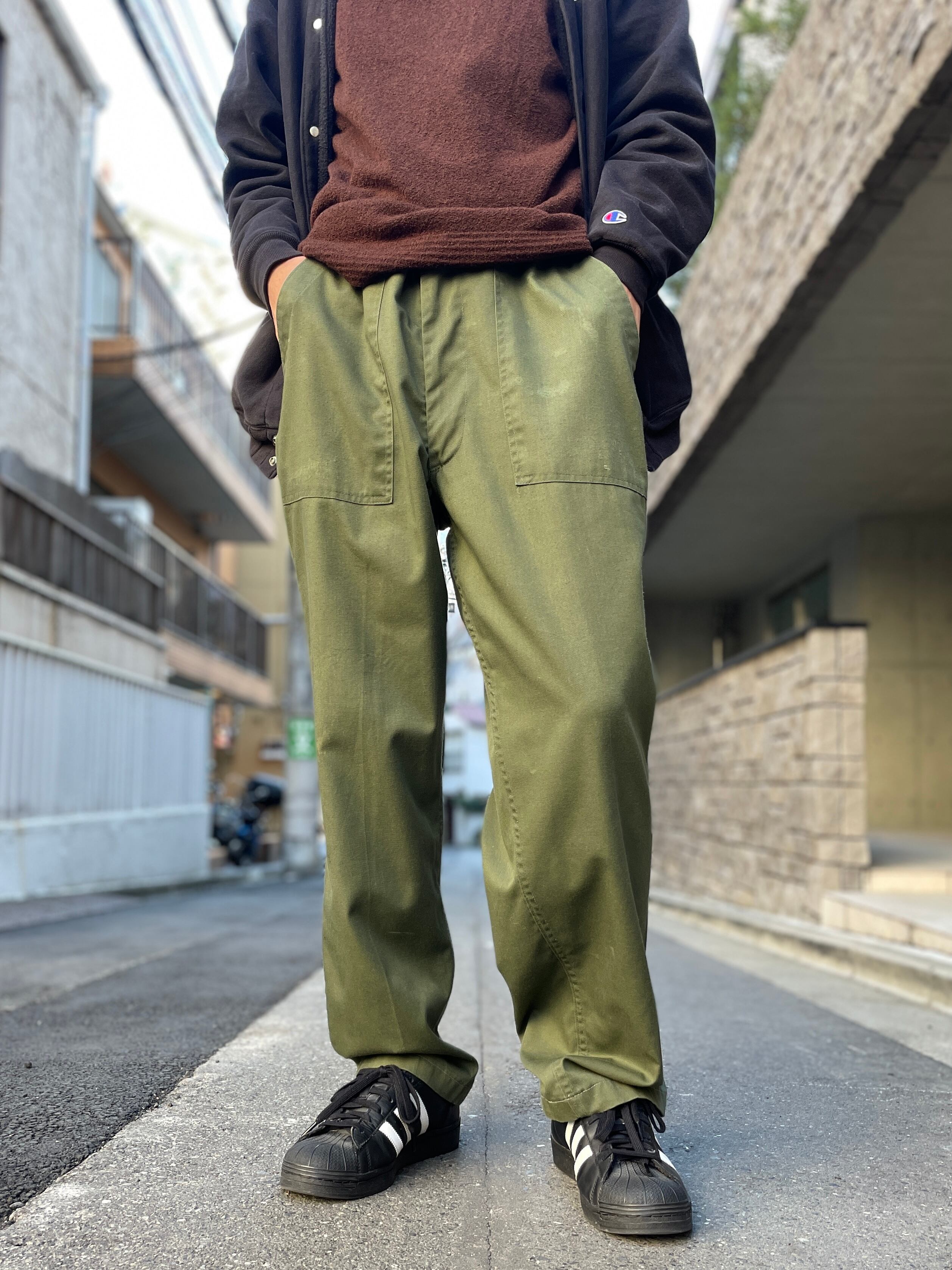 両脇のアウトポケットが特徴的な、USアーミーのユーティリティトラウザーパンツ。ベイカーパンツとも呼ばれていますね。ミルスペックから80年代のものであることがわかります。ゆったり目の腰回りから、ややテーパードした綺麗なシルエット。色は”軍モノ”って感じですが、すっきりとしたシンプルなデザインは、どんなコーディネートとも相性バツグンです。若干のシミが見られます。