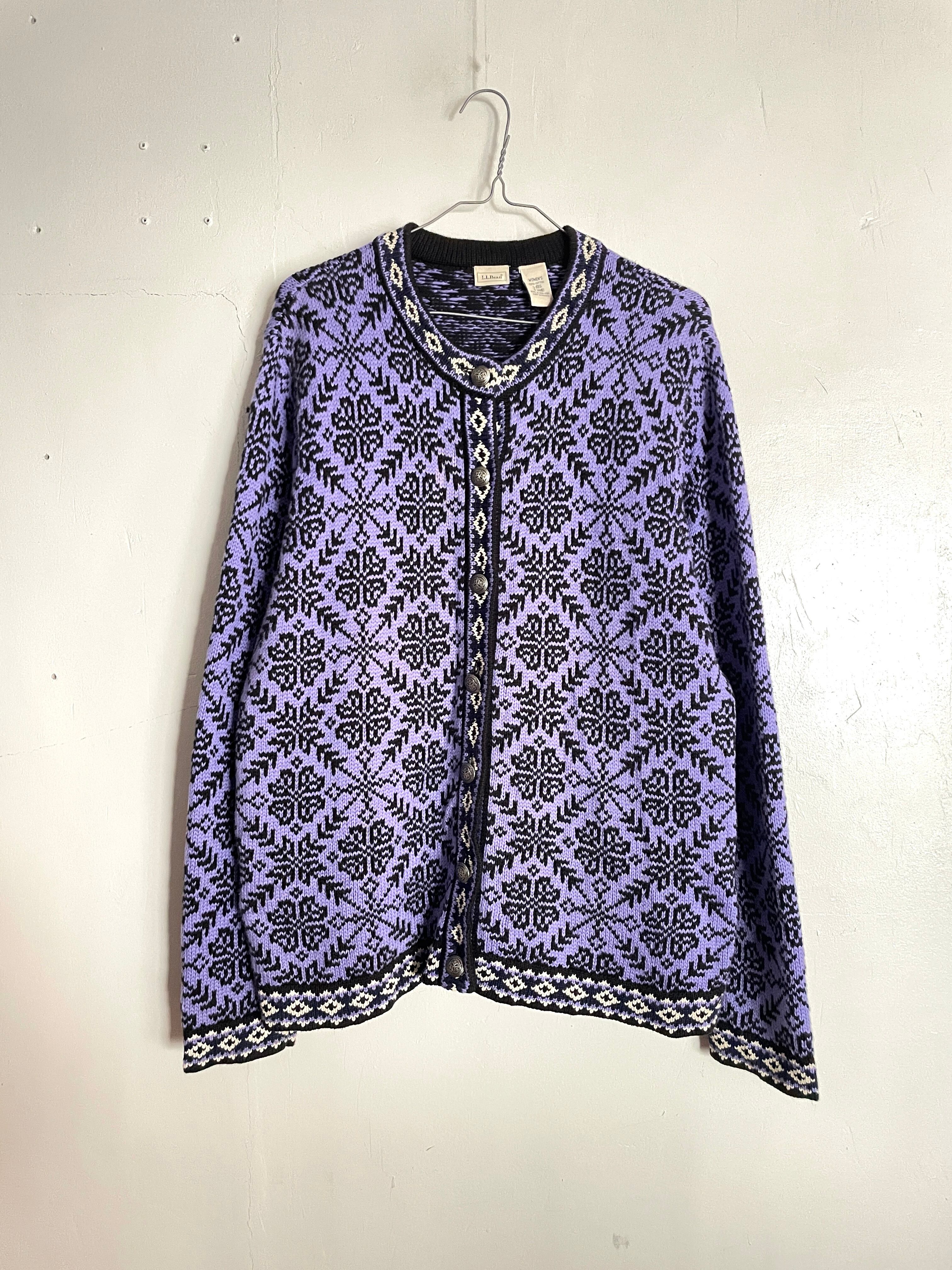 紫を基調としたボディに雪柄が散らばる、エルエルビーンのノルディックカーディガン。前開きのコンチョボタンも可愛らしく、カーディガンではありますがネック部分が上まで留まるデザインです。弾力のあるコットン100%は、ウールやアクリルに比べ使える時期も多そうです。一枚で絵になるお洒落な一着。