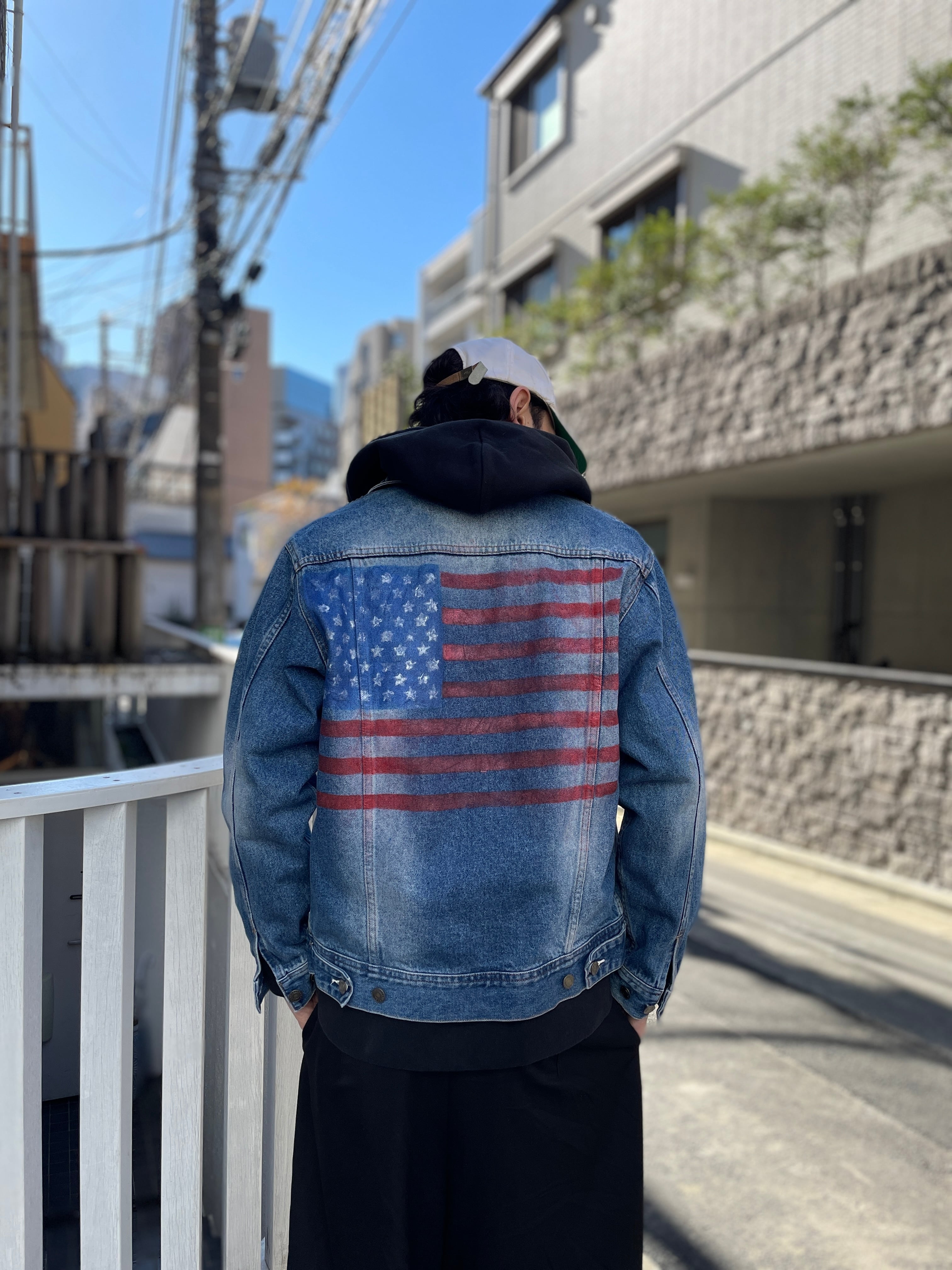 良い褪せ方をしたボディーに、アメリカの国旗がペイントによってデザインされた、デニムジャケット。ラメっぽくキラッと光るデザインがグッドです。フロントはシンプル、バックはインパクトありと、前後でしっかりとメリハリがあるのが魅力的です。大き過ぎず、小さ過ぎないサイズ感なので、男女共におすすめしたい一着です。