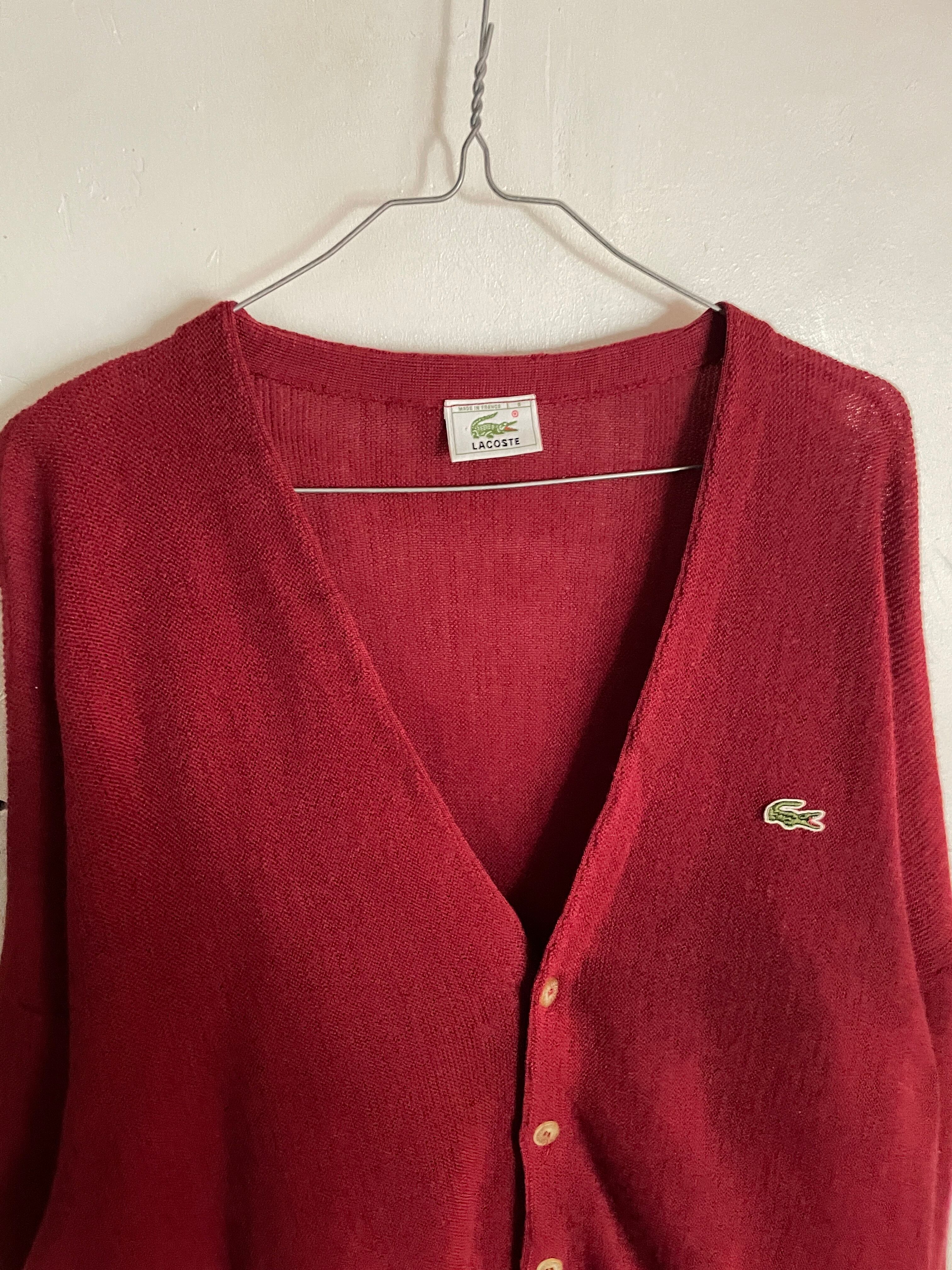 明るいレッドカラーで、軽いウール素材で着用感抜群の、ラコステのカーディガン。ワンポイントでラコステパッチとシンプルなディテール。サイズ感はかなりビッグサイズで、肩が落ちるようなお洒落なシルエットです。フランス製なのもポイント高めです。今の時期にはインナーとしても活躍してくれそうです。