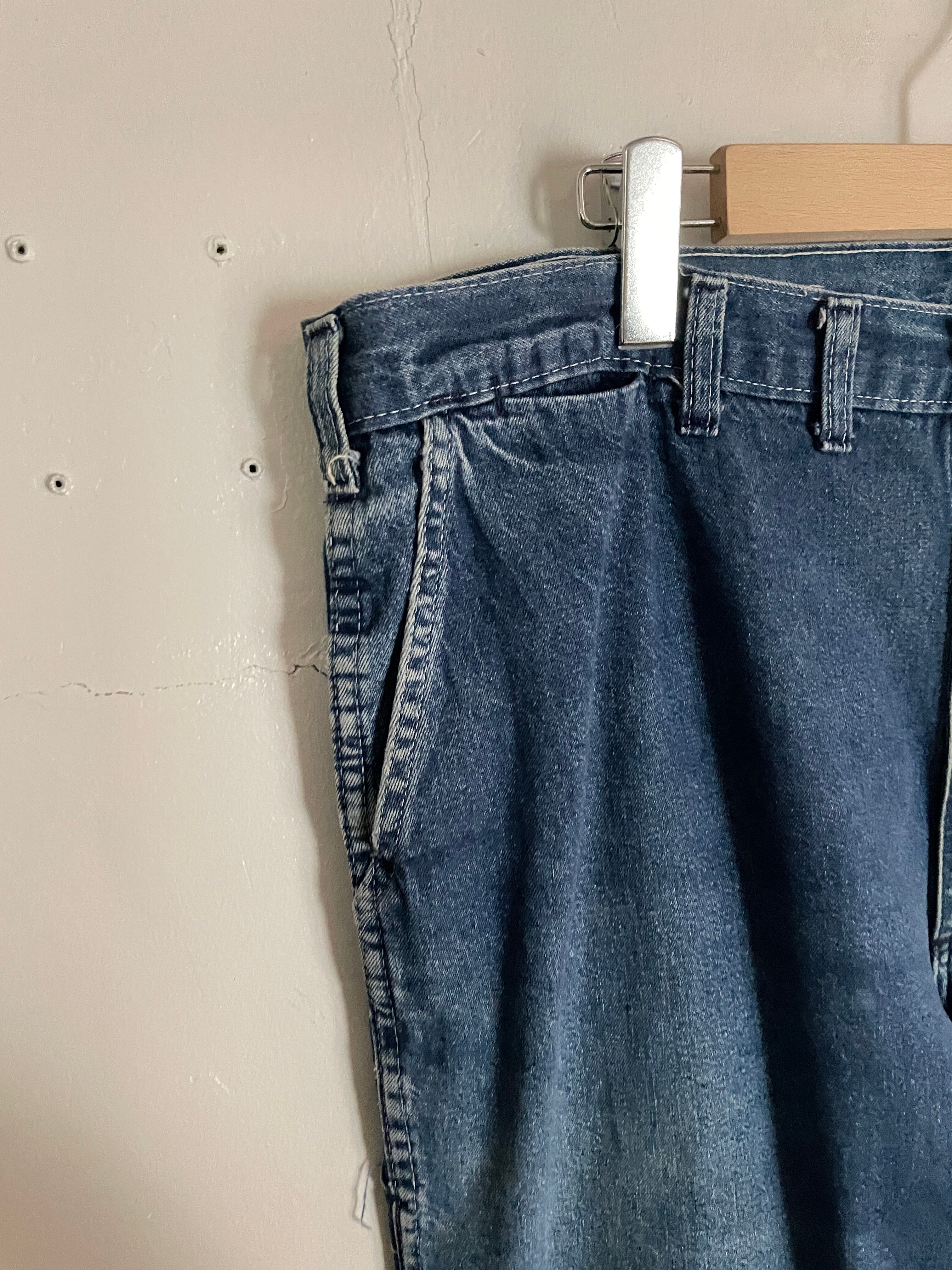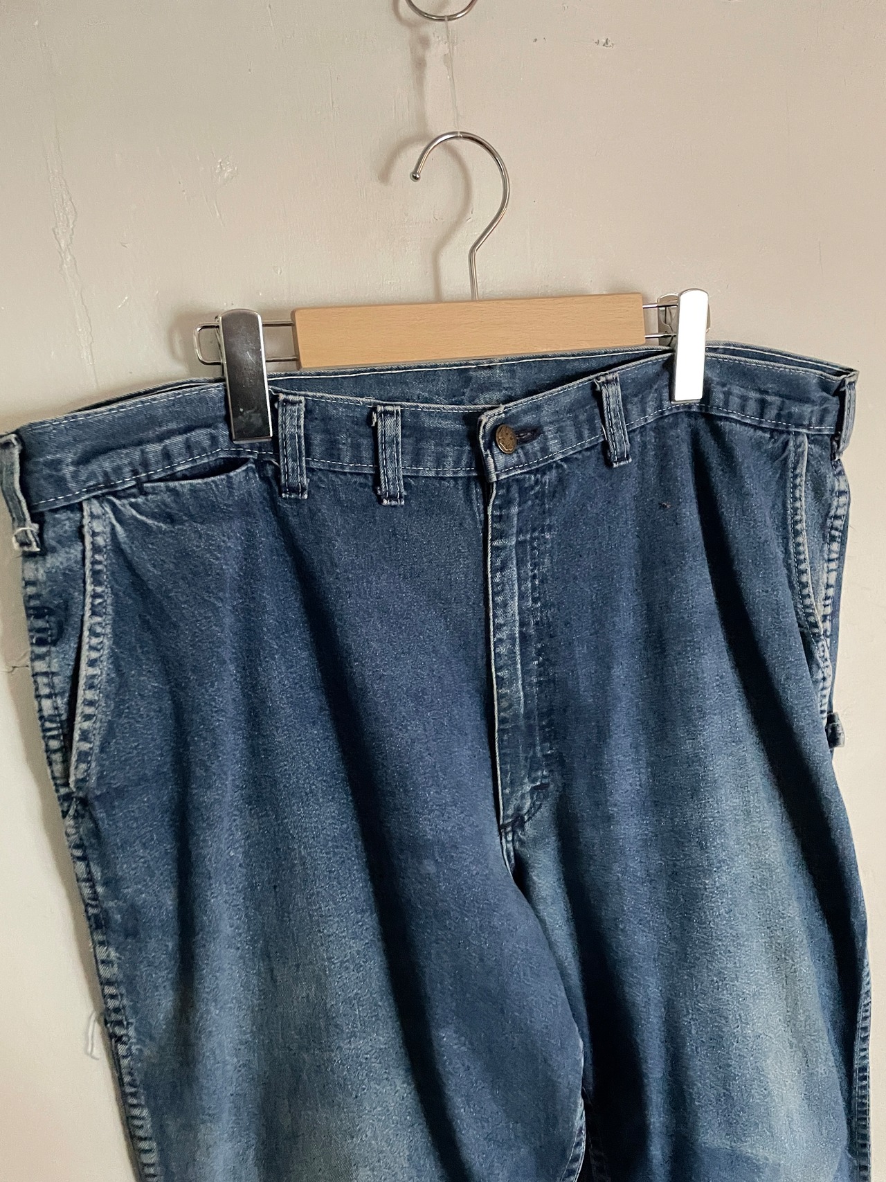 褪せた色味と、ワイドシルエットが魅力的な、オシュコシュのワークデニムパンツ。柔らかいコットン素材で履きやすい仕様です。ウエストがかなり太く、ベルトでしっかり縛ってデカ履きするのをおすすめします。程良い褪せ方、解れなどからヴィンテージ感を感じられるパンツです。