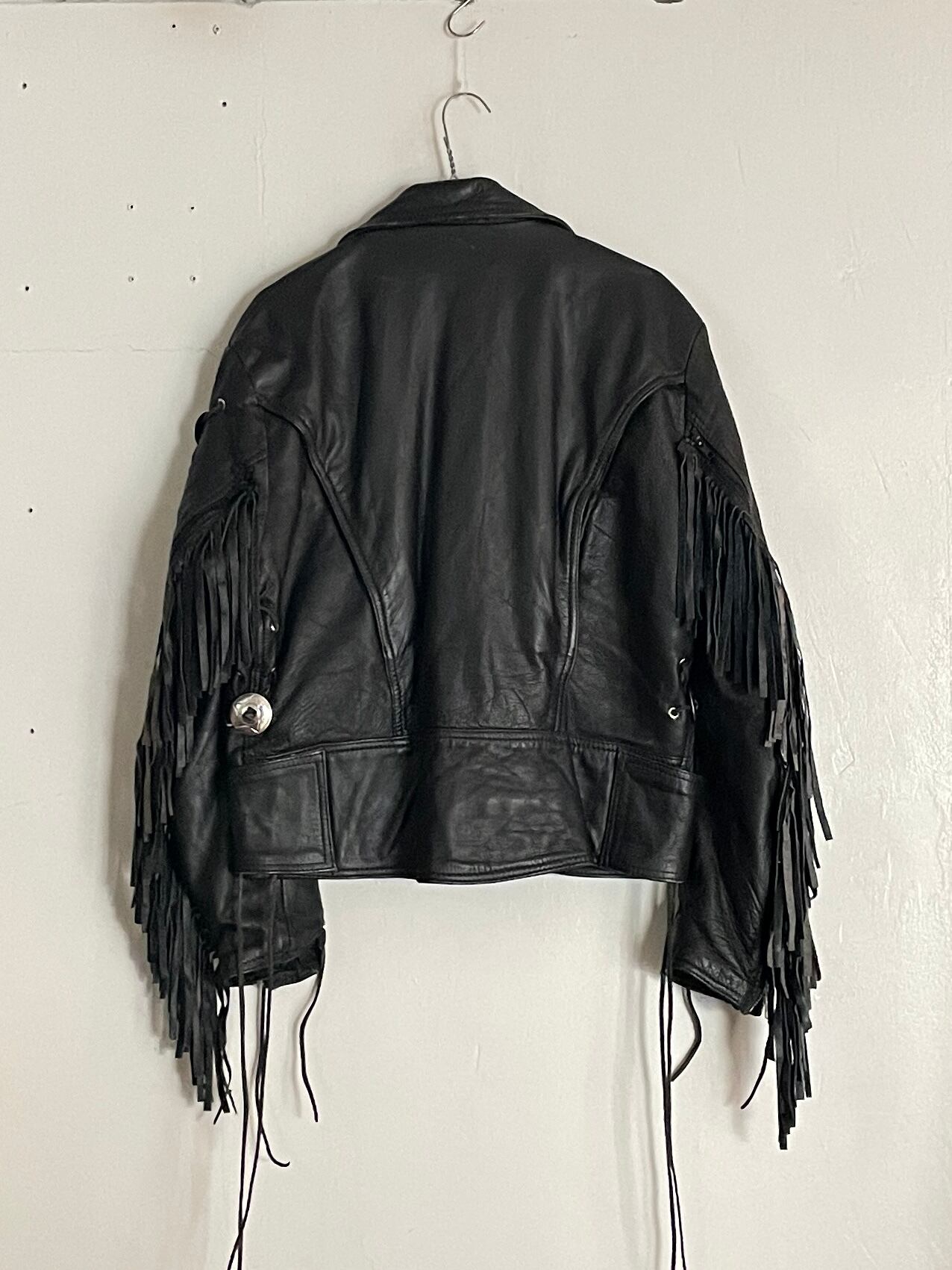 Old Black Fringe×Concho×Lace Up Design Riders Leather Jacket