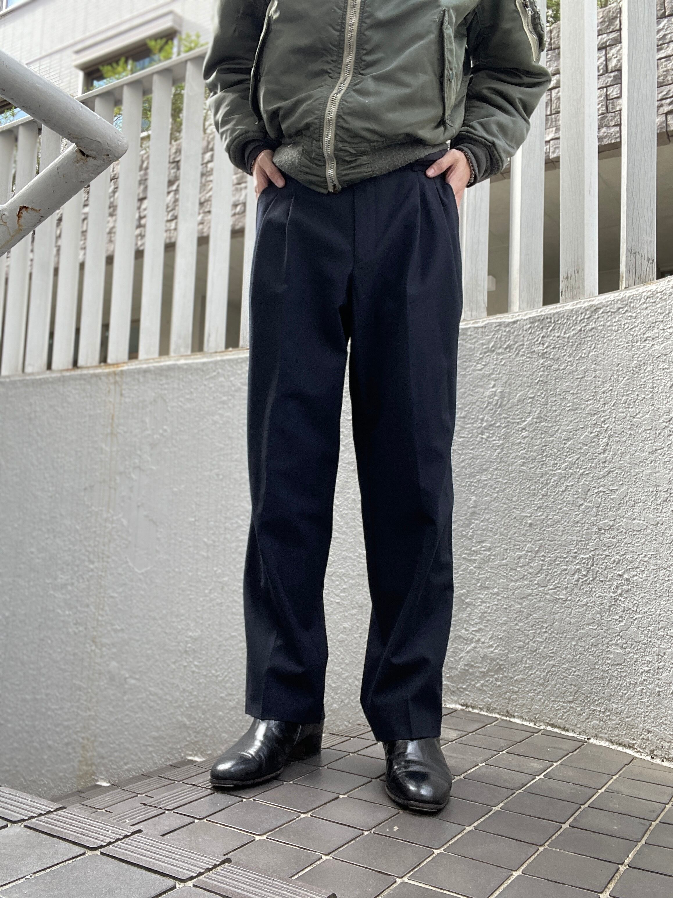 限りなくブラックに近いネイビーカラーの、スラックス。2タックのワイドストレートの綺麗で、使いやすいスラックスです。ポリとウールのサラッとした上品な質感。こういったシルエットの良いスラックスを探すのはなかなか難しいです。季節関係なく重宝する一本です。
