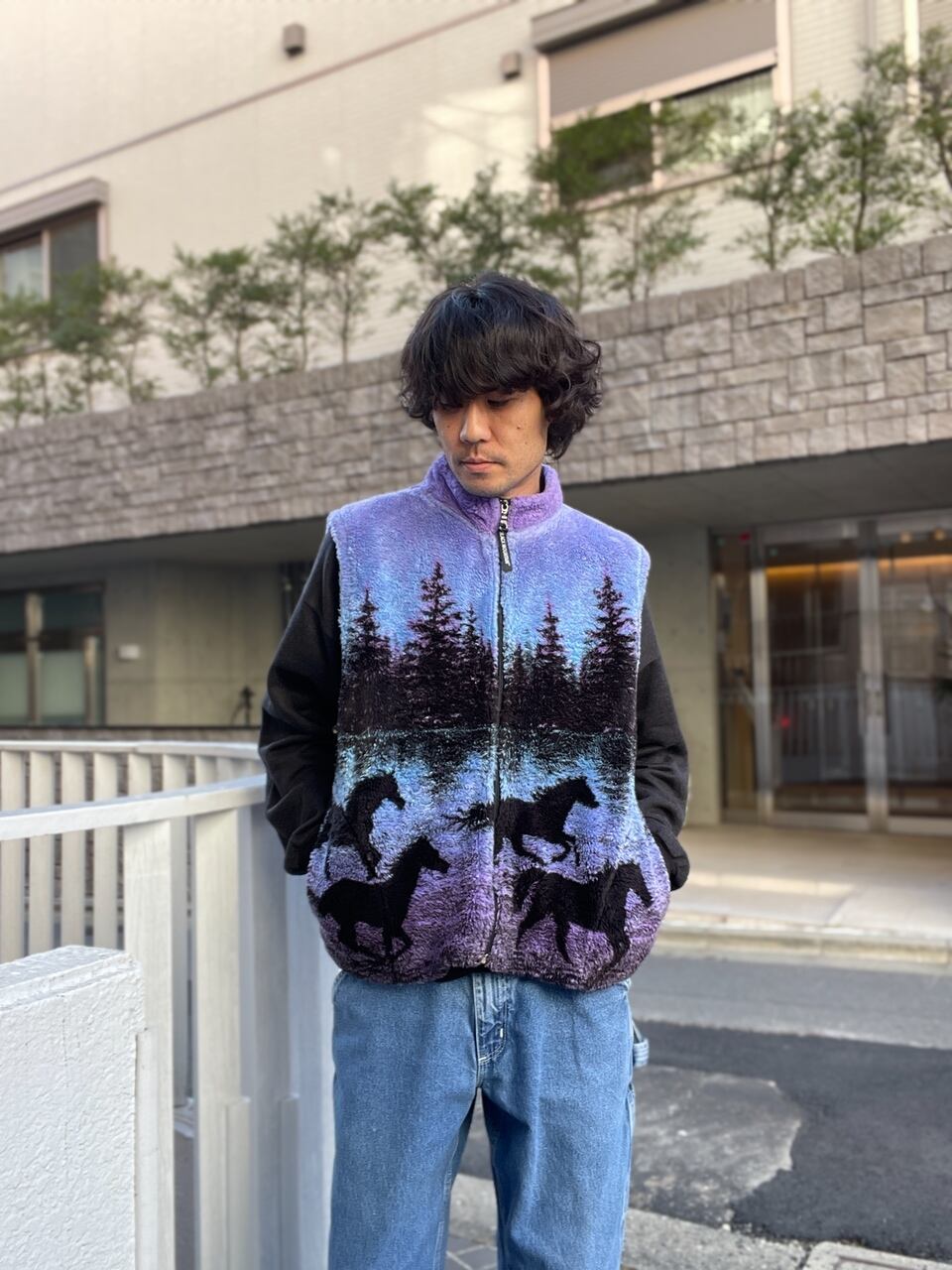 毛足の長いフリース素材に森と馬のシルエットがプリントされたベスト。朝日が登る前、もしくは日が落ちるタイミングでしょうか。紫がかった色味がその瞬間をうまく表現しています。両脇には便利なポケット付き。軽くて暖かい、おしゃれで便利なレイヤードアイテムです。