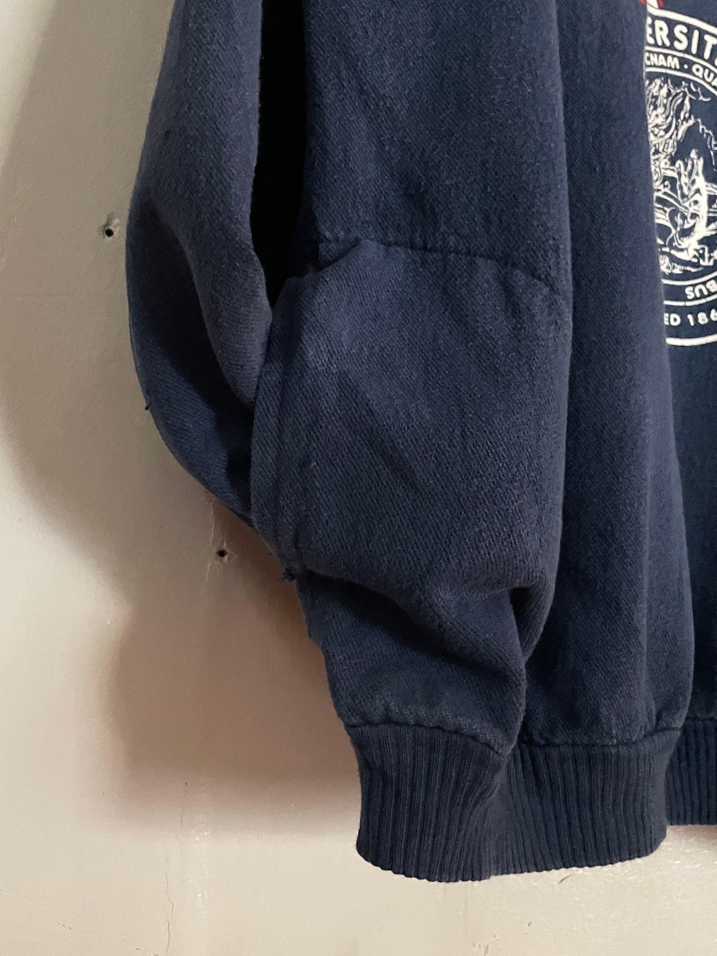Vネックのスキッパーカラーで、ドローコードが付いたお洒落なデザインのプリントスウェット。両脇にはポケットも付いています。大きめのカレッジプリントもお洒落。一般的なスウェット地とは少し違う、布帛に近いコットン素材が使われているのも特徴です。ネックを倒してもよし、コードを結んでリボンのようなアクセントを作るのもいいかもしれません。全体的にゆったりとしたサイズ感です。