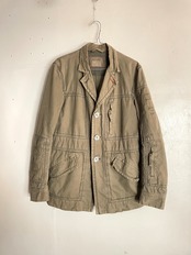 カーキグリーンに切替え・リペアデザインやジップポケットが付いたジャケットは、マリテ+フランソワ・ジルボーのもの。テーラードジャケットにミリタリーの要素をプラスしたような面白いデザインです。それに合わせてアームもタイト目、身幅もやや狭め。綺麗めなアイテムにカジュアルを落とし込んだ、個性的なジャケットです。