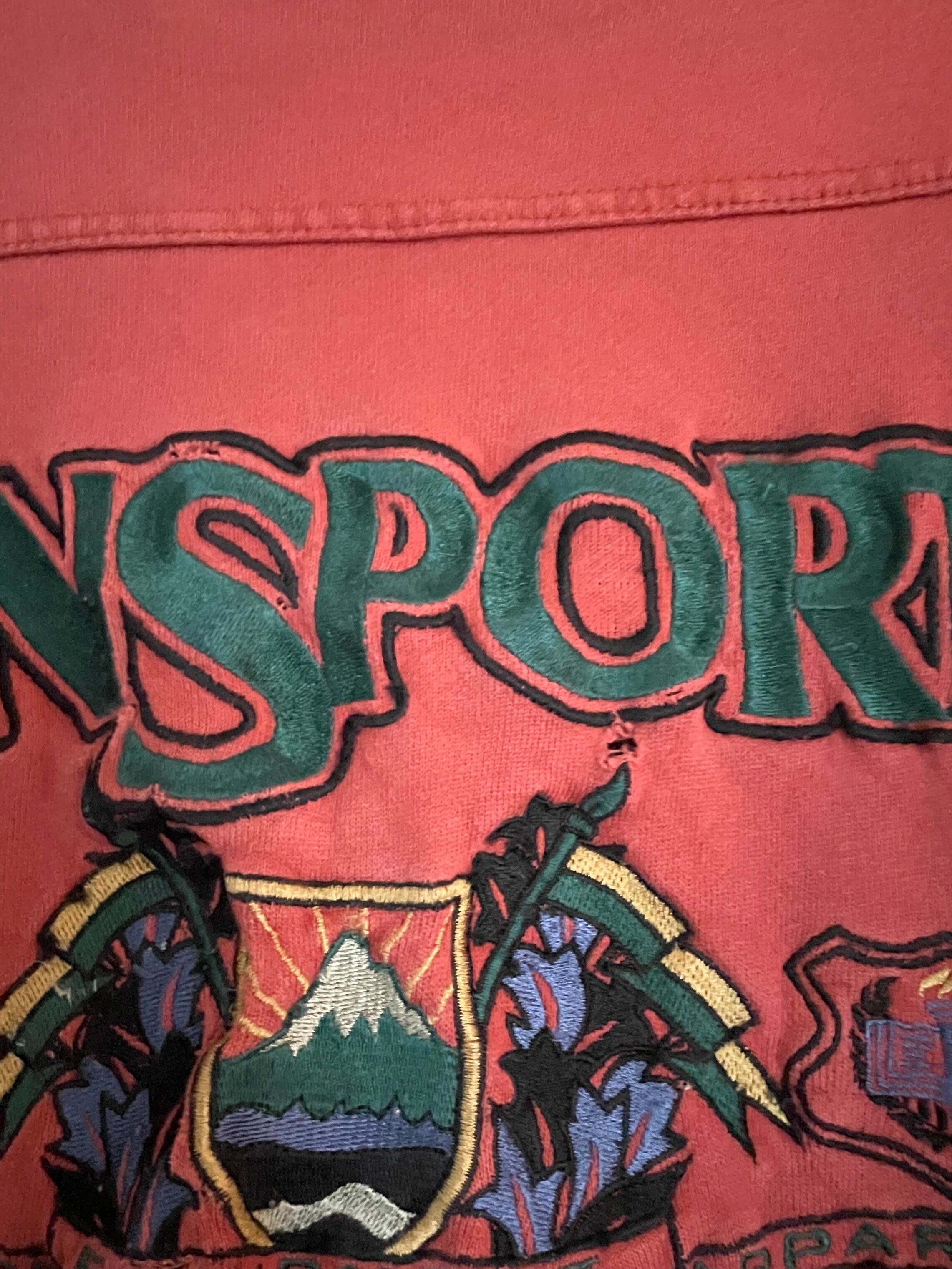 オレンジがかった赤のような独特の色味に、ブランドロゴが刺繍されたジャンスポーツのスウェット。褪せ感のあるボディに、細かく大きめな刺繍がお洒落です。リブが違う色で切り替えられているのもポイント。身幅広めですが丈が長過ぎないいいサイズバランスです。刺繍部分に小さなダメージが見られます。