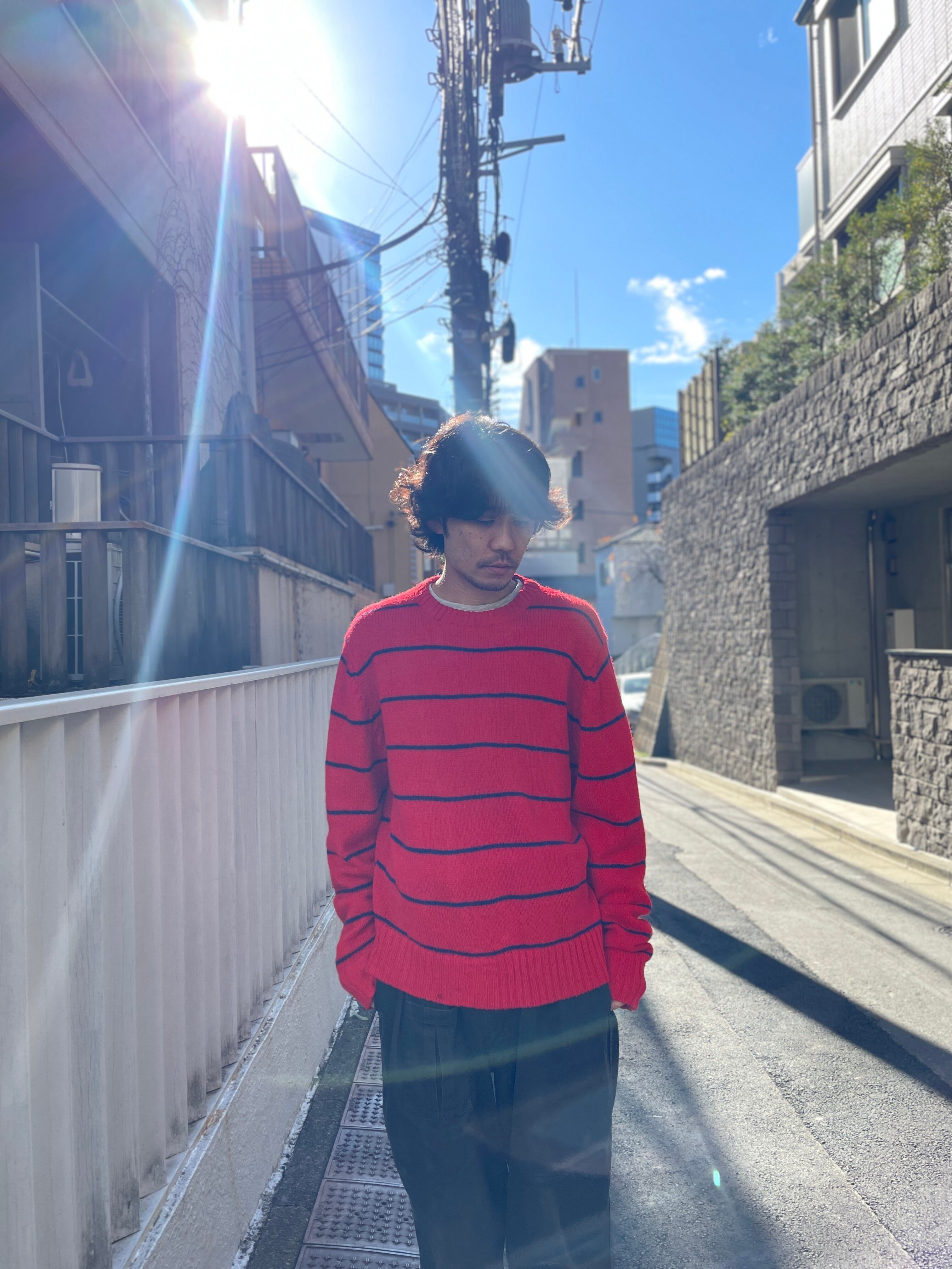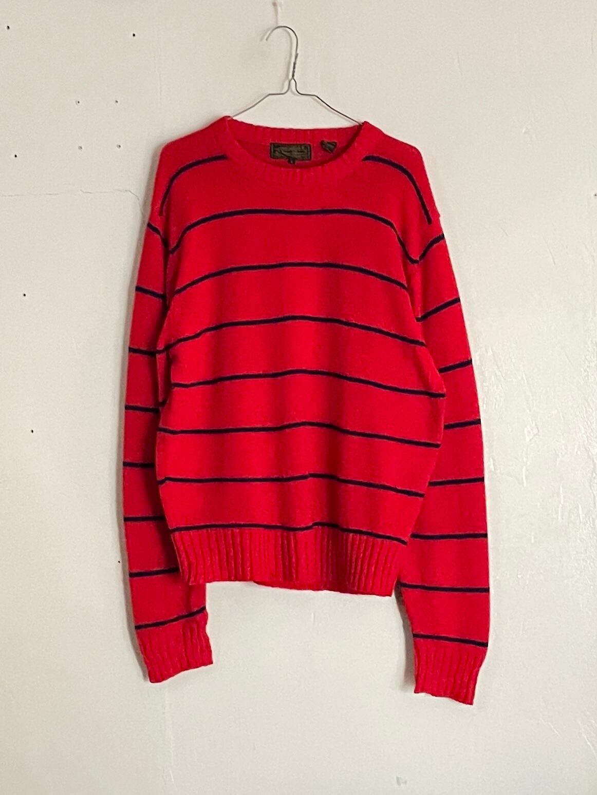 明るいレッドボディに、ブルーのラインデザインが施された、エディーバウアーのウールニットセーター。程良い丈感に対して袖が長め。ネック、袖口、裾はリブ仕様ですが、そこまで締まっていないので、良い緩さの出るお洒落なシルエットです。今の時期はインナーの差し色としても活躍してくれます。