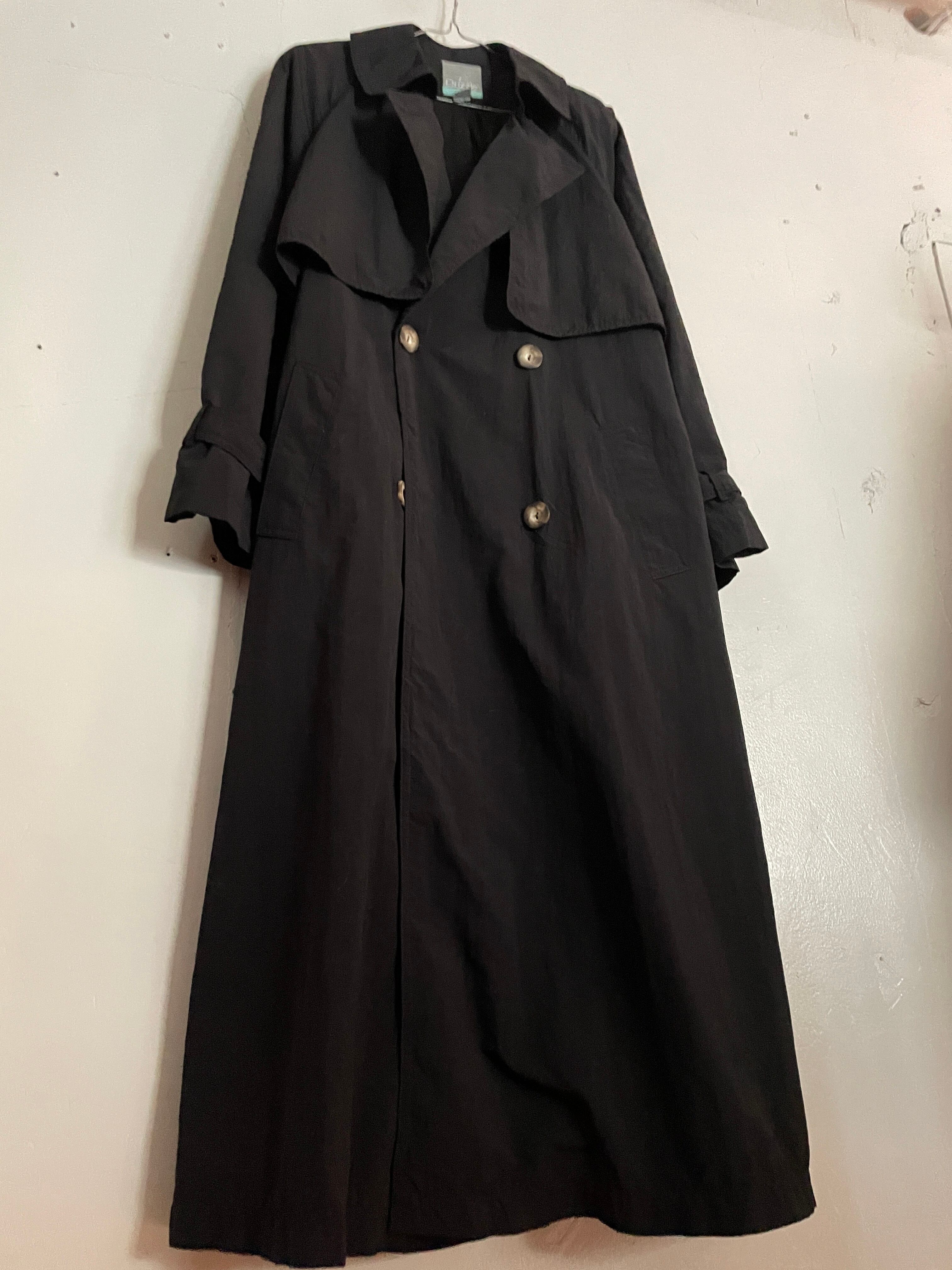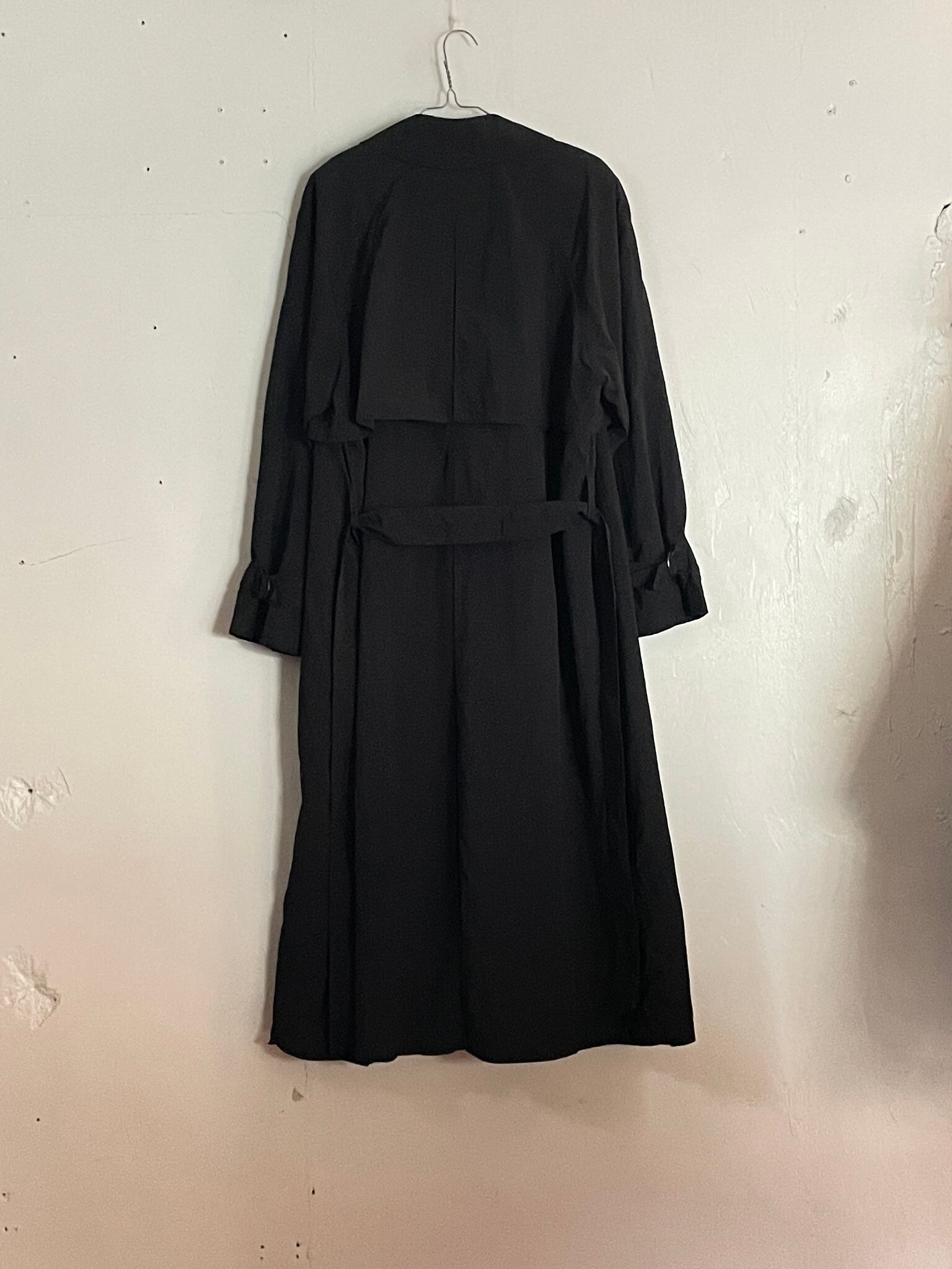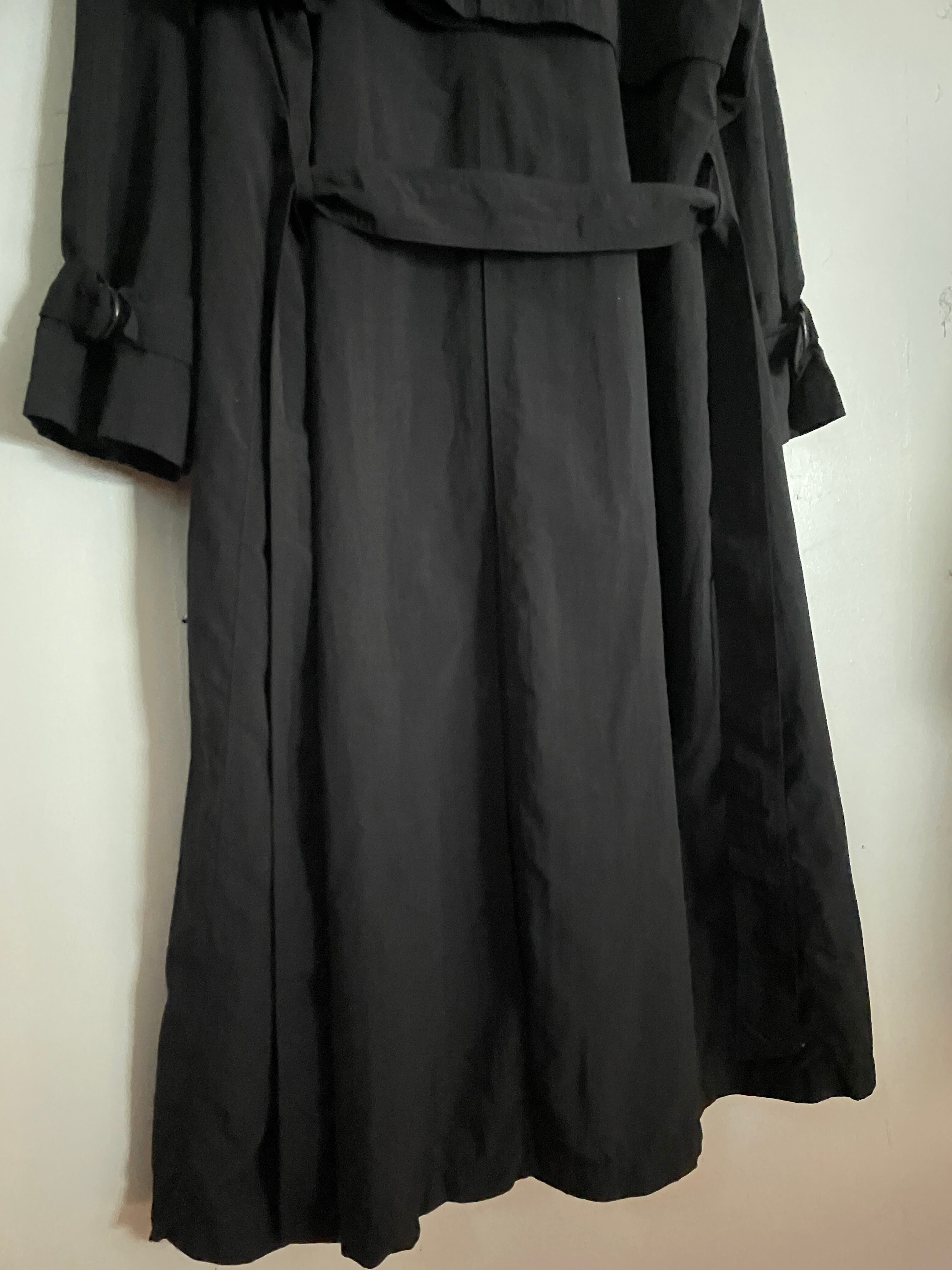 光沢のあるブラックボディで、上品なサラッとしたナイロン素材のトレンチコート。着丈はかなり長めで、タイトめな身幅。シルエットが絶妙に綺麗です。紐ベルト付きなので、気分で縛ってきてもグッドです。フロント部分はヨークデザインになっていて、雰囲気のある仕様です。このディテールで、USA製なのも魅力的です。