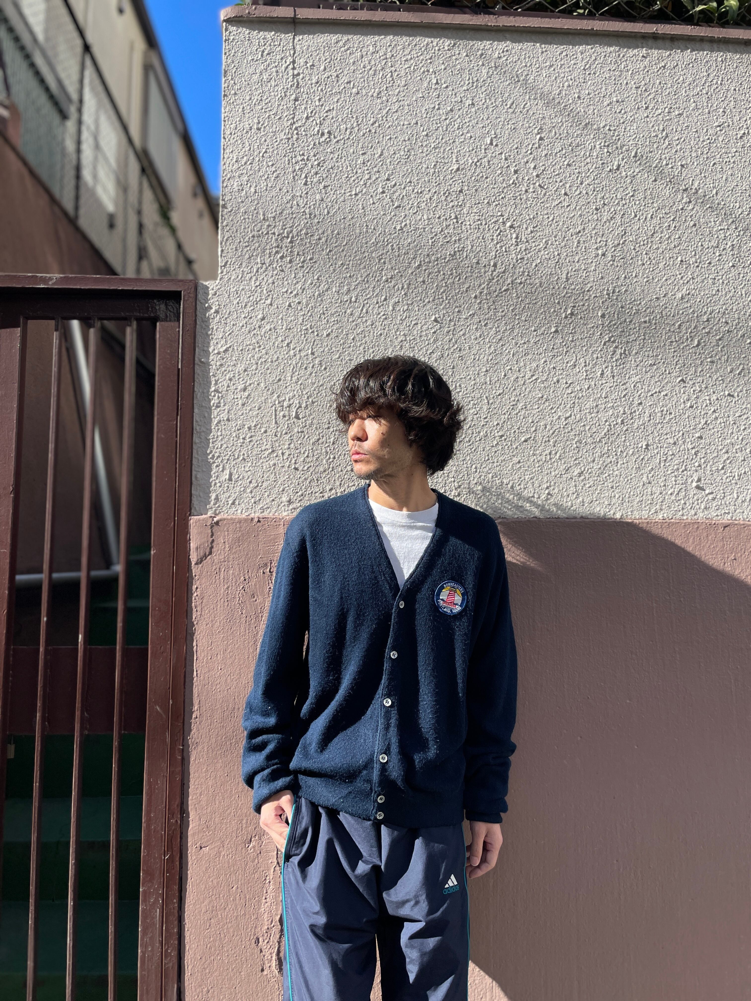 ダークネイビーボディに、ワンポイントでポートランドの灯台ワッペンが貼り付けられた、エルエルビーンのアクリルニットカーディガン。軽くてサラッと羽織りやすいです。袖が長めなので、今の時期にはアウターのインナーのとして着て、袖を出してレイヤードっぽくして着てもお洒落かと。USA製なのもポイントが高いです。いい意味でエルエルビーンっぽくない使いやすいアイテムです。