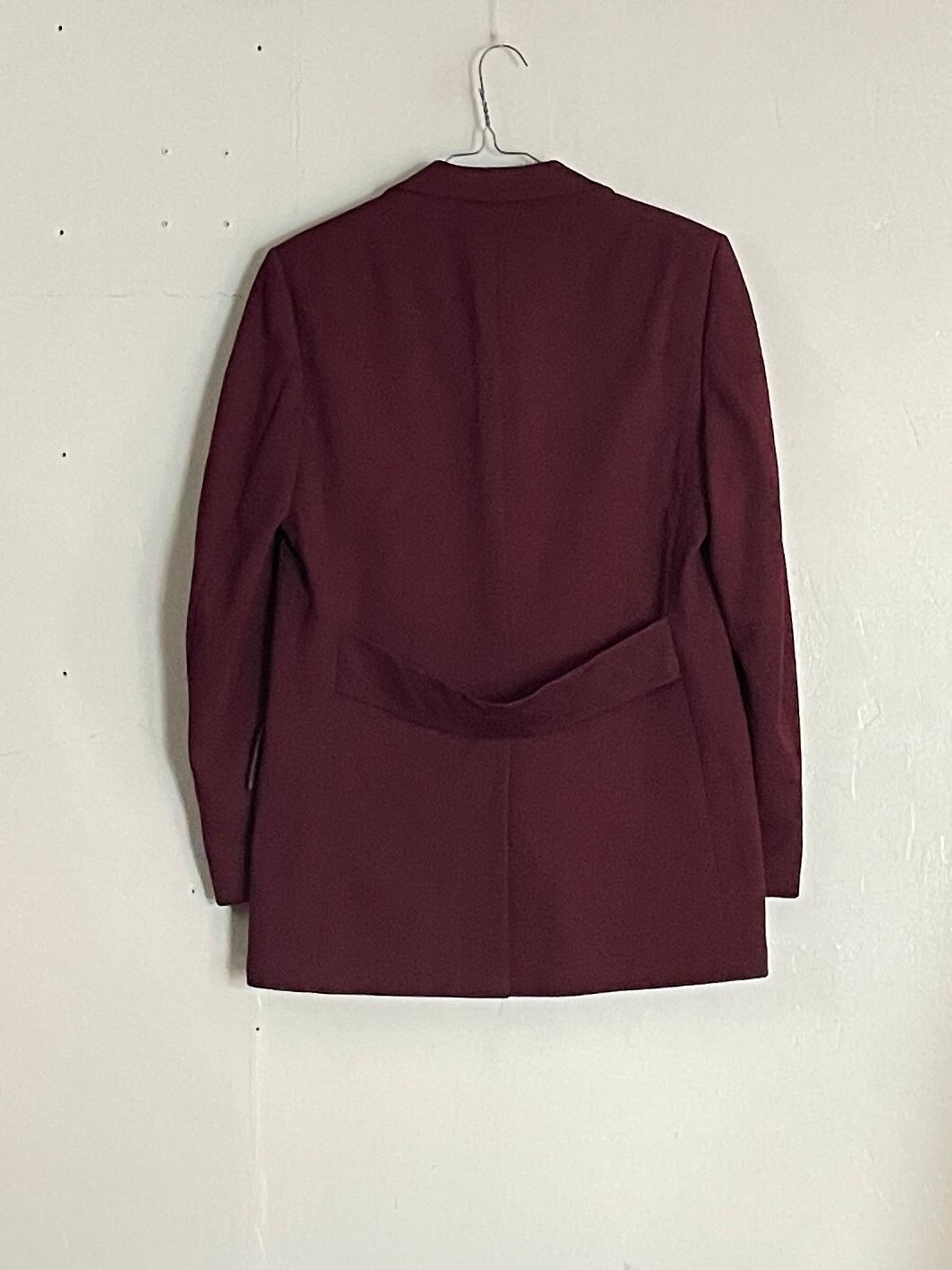 色気のあるワインレッドボディのテーラードジャケット。珍しいポリ素材で、普通のテーラードとは少し違った雰囲気の出る一着。ポケット口には、さりげない菱形状の刺繍デザイン。裏地はお洒落な総柄デザインになっています。表裏で印象の違ったデザインがグッドです、ボタンの刻印も高級感があって魅力的です。綺麗めにもカジュアルにも落とし込めそうな一着です。