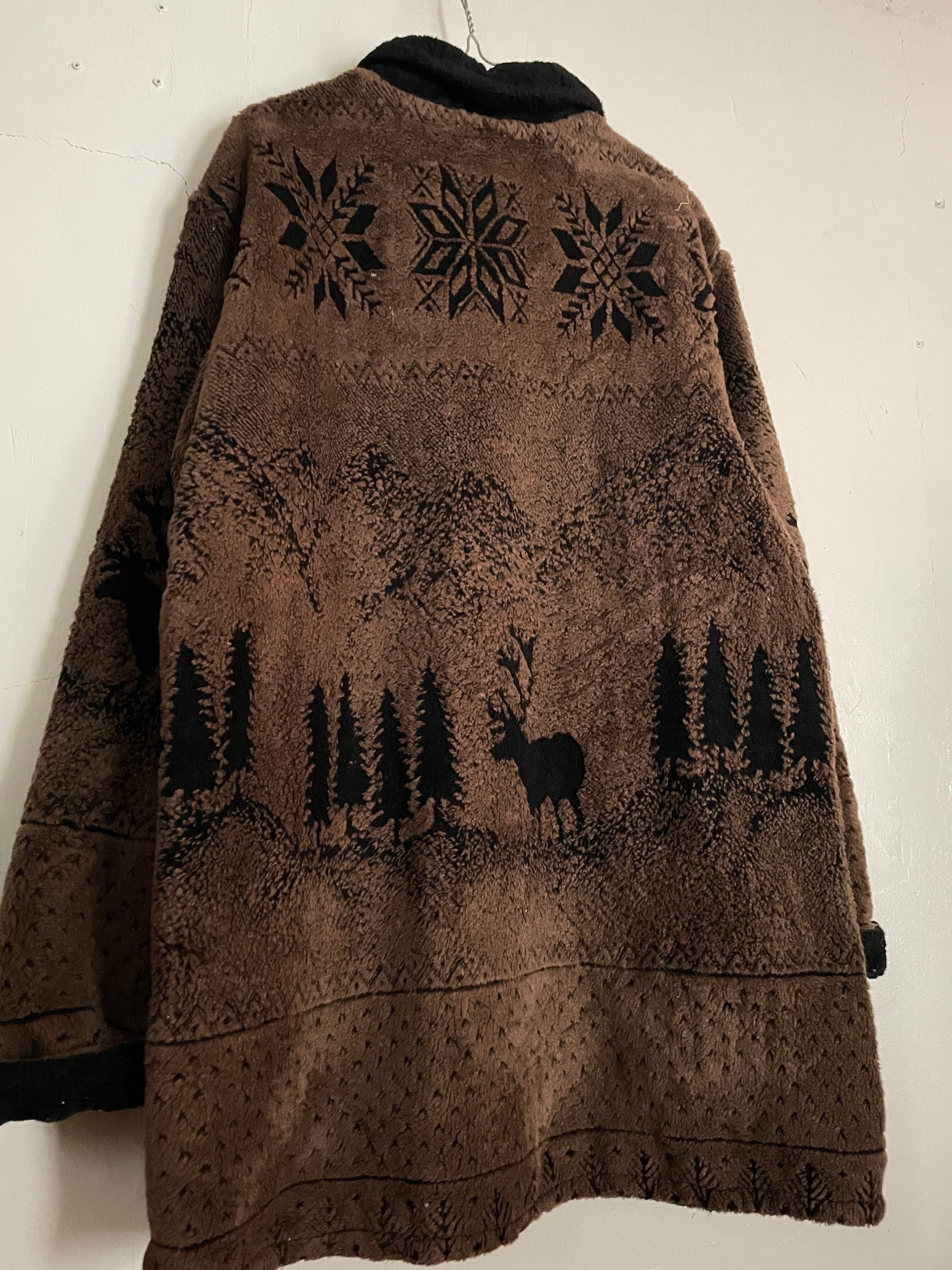 ブラウンボディをベースに、冬を感じられる柄デザインが施された、ボアフリースジャケット。フワッとした質の良いアクリルとポリ素材。雪結晶やトナカイなど、冬を連想させられるデザインがお洒落です。保温性も抜群で、まさに今の時期にファッションのメインになってくれるアイテムです。