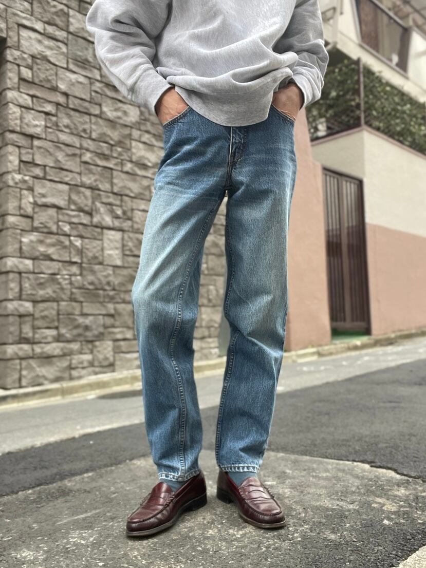 フィットする腰回りから、裾に向かってテーパードしたタイトシルエットのデニムパンツは、リーバイスの726。あまり見ない品番です。綺麗な色落ち具合、スキニーとまではいきませんが足にそうシルエットは、脚長効果もありスタイルをよく見せてくれます。王道とは違ったイレギュラーアイテムですが、タイトめなデニムパンツをお探しの方にはおすすめの一本です。