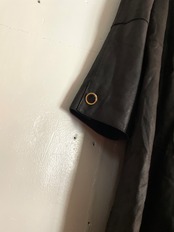 柔らかいブラックレザーで、ハイネック仕様のレザーコート。ボディが縦に切替えられていて、広めのアームホールから袖口に向かって細くなった、ドルマンスリーブのようなデザインも特徴的です。ワインレッドでブランドロゴ入りの裏地もポイント。あまり重さも無いため、サラッと羽織れる一着に仕上がっています。