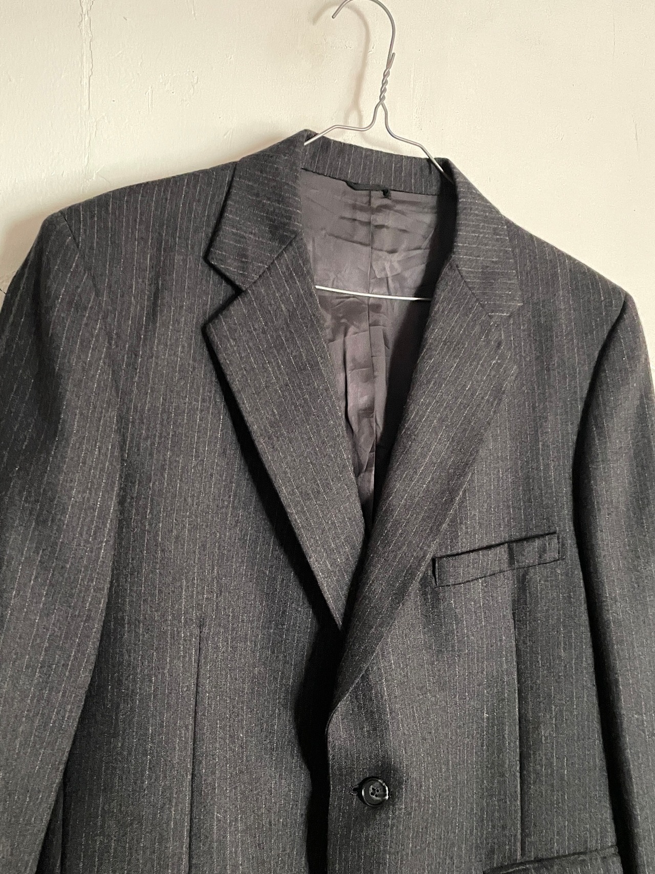 グレーベースにうっすらと白とブルーのストライプが並んだテーラードジャケット。胸ポケットに2つのフラップポケットと、シンプルでベーシックなデザインのシングルテーラードです。部分的に裏地が付いた背裏仕立て。後ろ裾には両サイドにベンツが付いています。フォーマルや綺麗めなコーディネートはもちろん、カジュアルなアイテムと合わせて楽しむのもテーラードジャケットの醍醐味です。