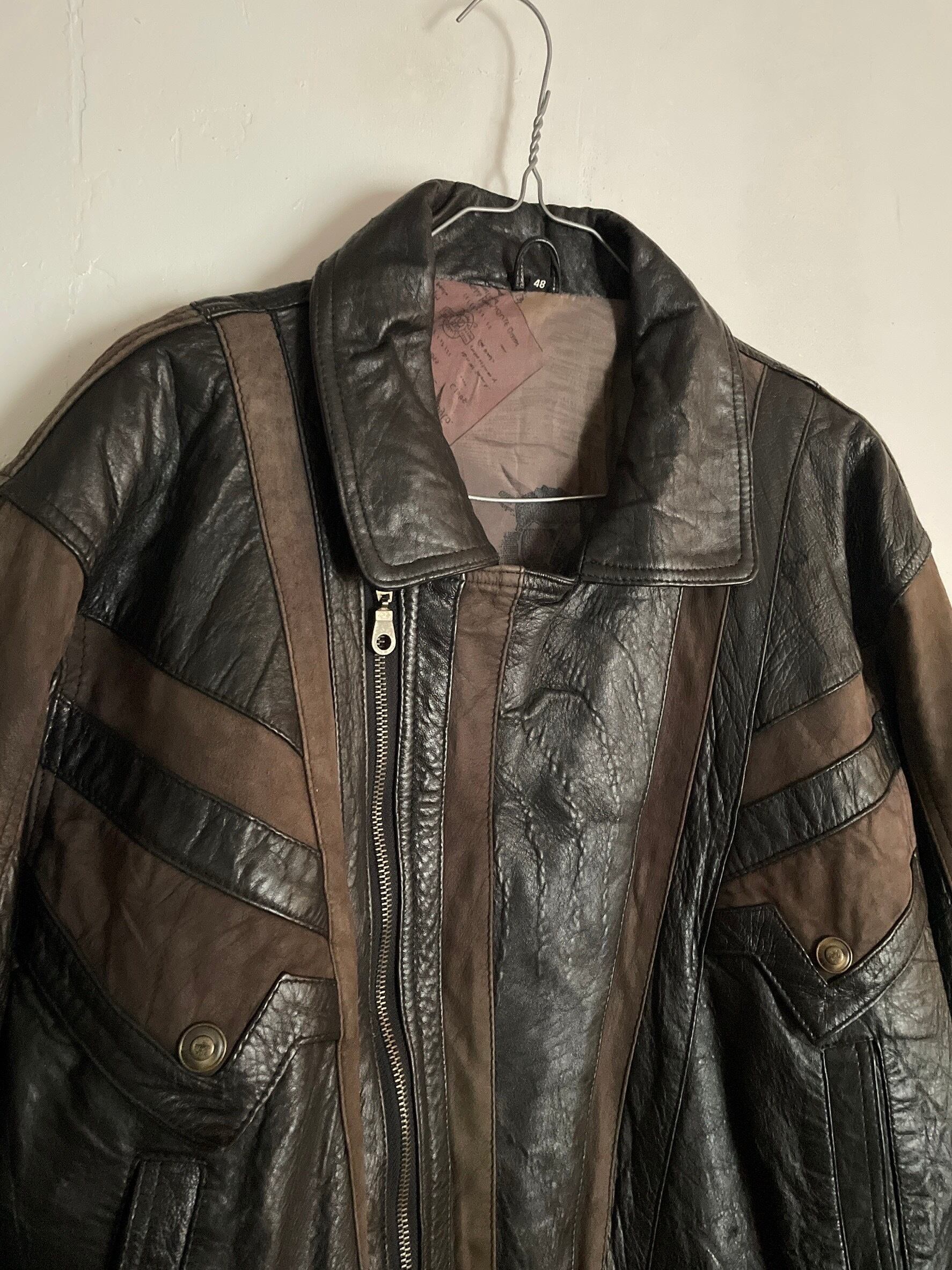 ブラックレザーとブラウンのスエードレザーで切替えられたレザージャケット。前開きが斜めに付いている仕様はダブルのライダースジャケットと同じデザインです。胸部分にフラップが付いていますがこれは飾りポケット。背中の切替えは普通のレザージャケットではあまり見られないデザインでお洒落。柄の裏地もポイントです。