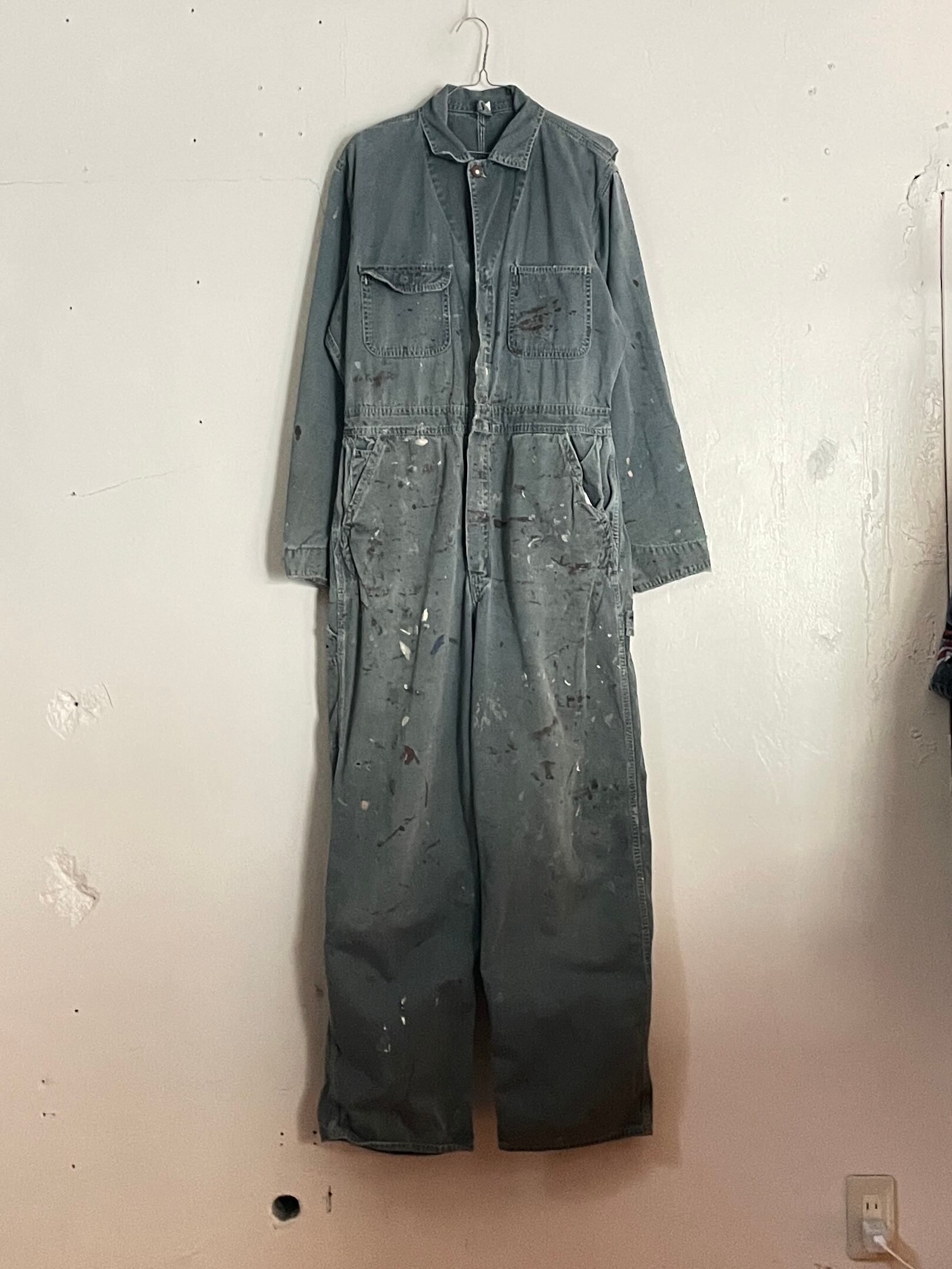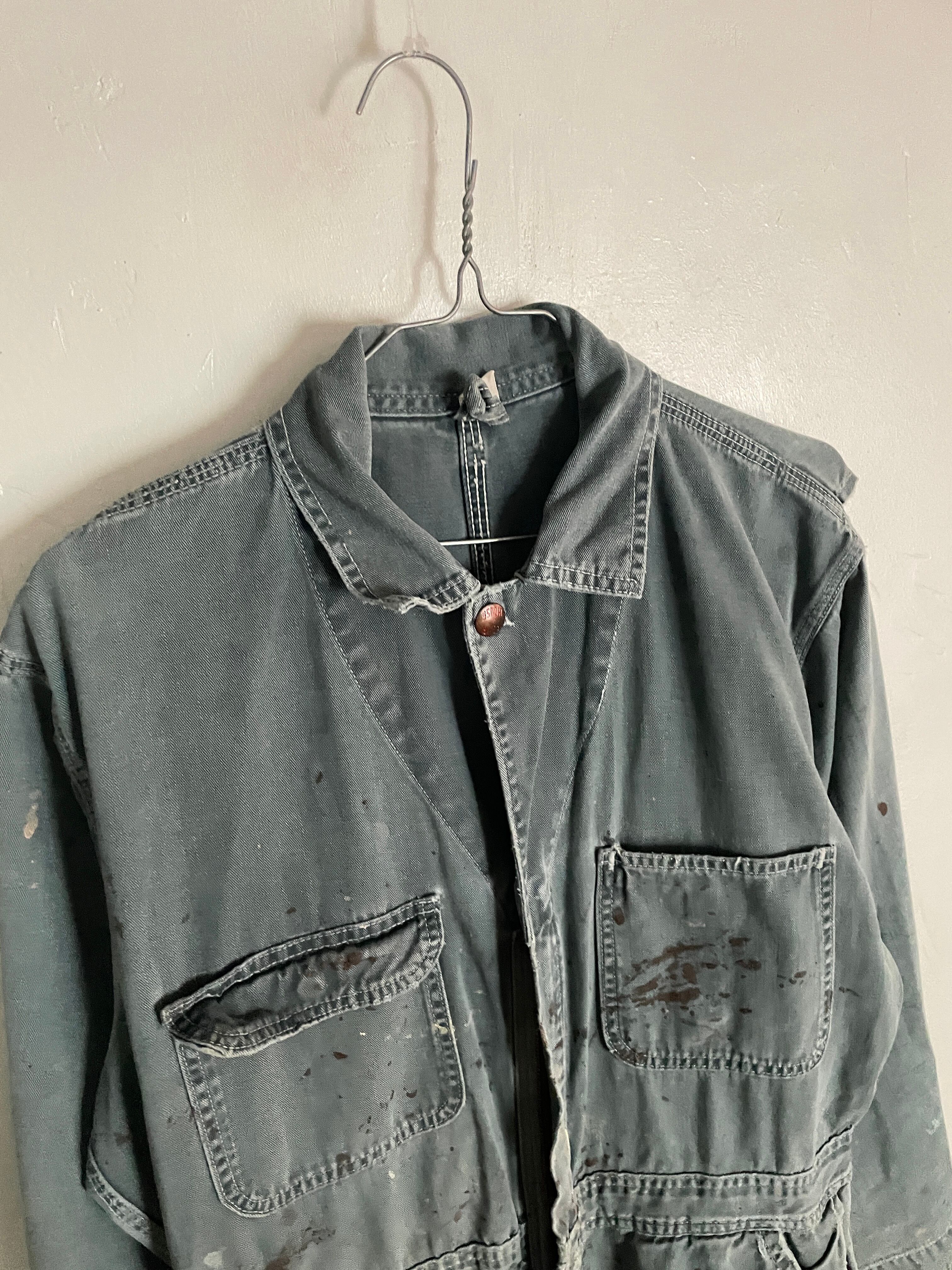 あえて雑にペイントデザインが全体に施された、ワークジャンプスーツ。ボロなディテールが雰囲気抜群です。ゆったりと着られるサイズ感で、今の時期には上なアウター羽織っても良し、涼しくなったら縛って着ても良し、使い方によっては一年通して使えるアイテムになってます。楽に着られて、良い抜け感を出してくれる一着です。