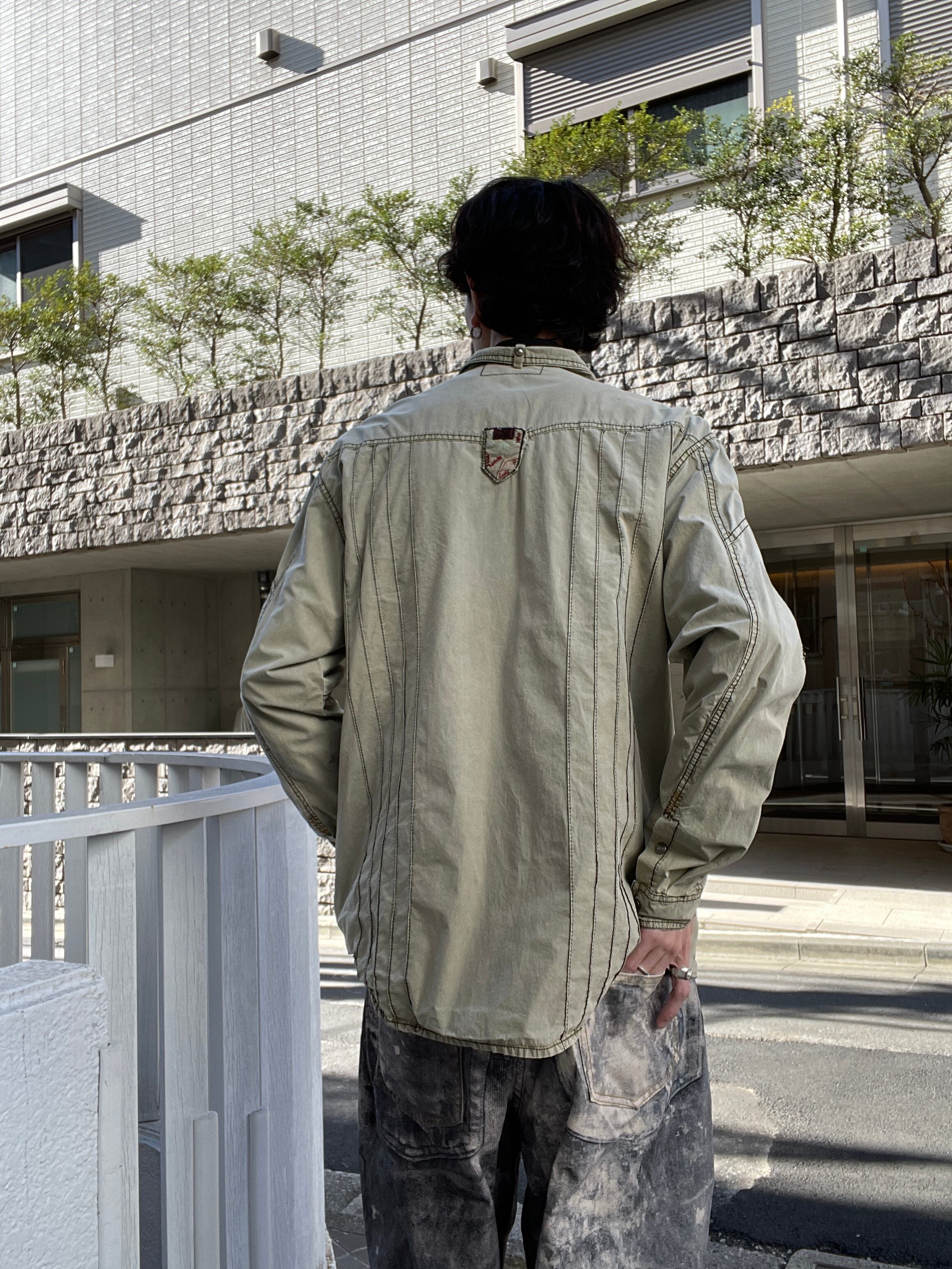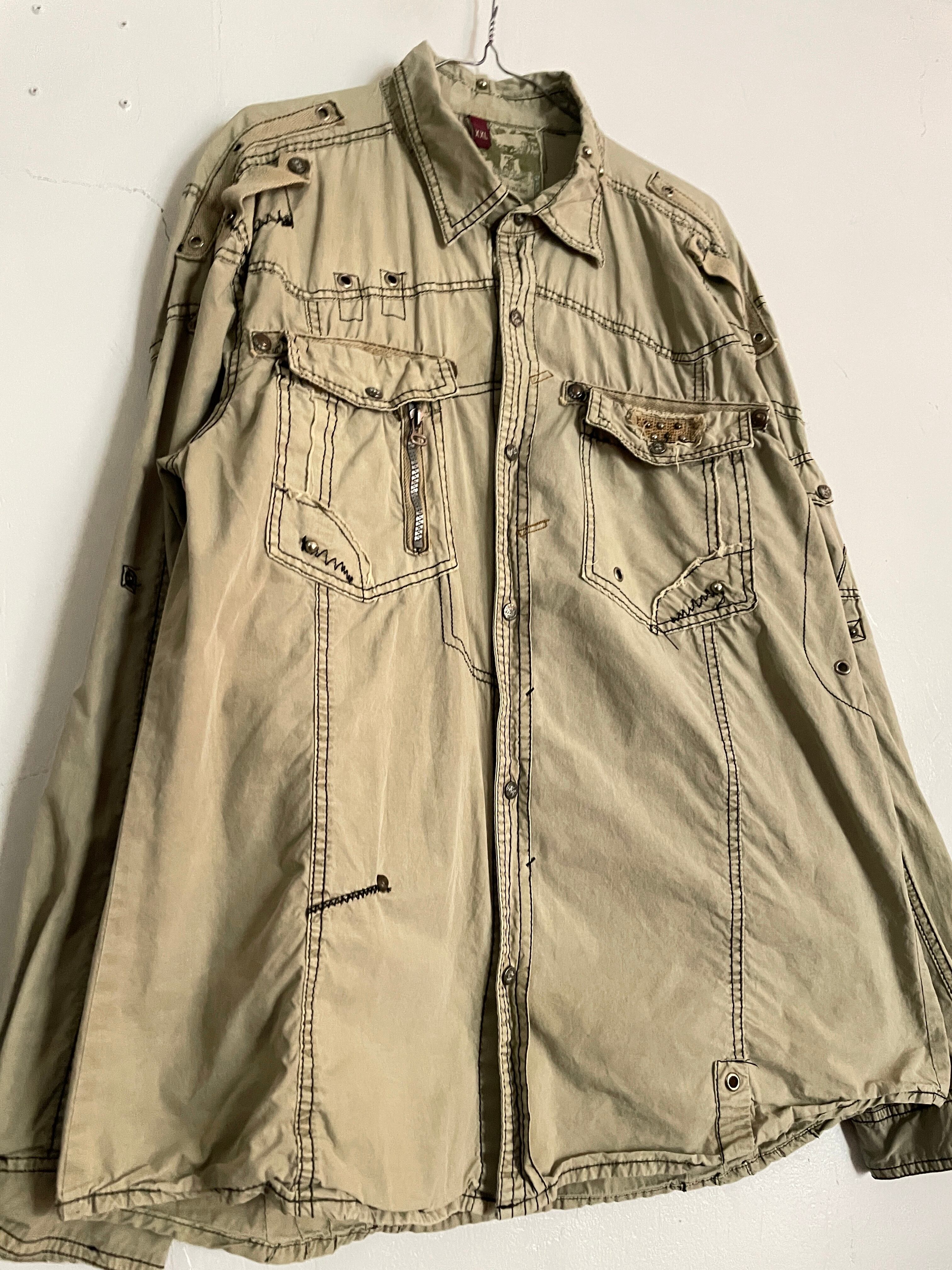 Y2Kノリの激しい、ギミックの効いたコットンワークシャツ。所々のステッチ、ジップ、スタッズなどデザイン性に長けたシャツになってます。軽いコットン素材でサラッと着やすいのも魅力的です。しかもXXLとビッグサイズ。今の時期にはインナーとして良いアクセントになってくれて、春先にはファッションのメインになってくれるお洒落なアイテムです。