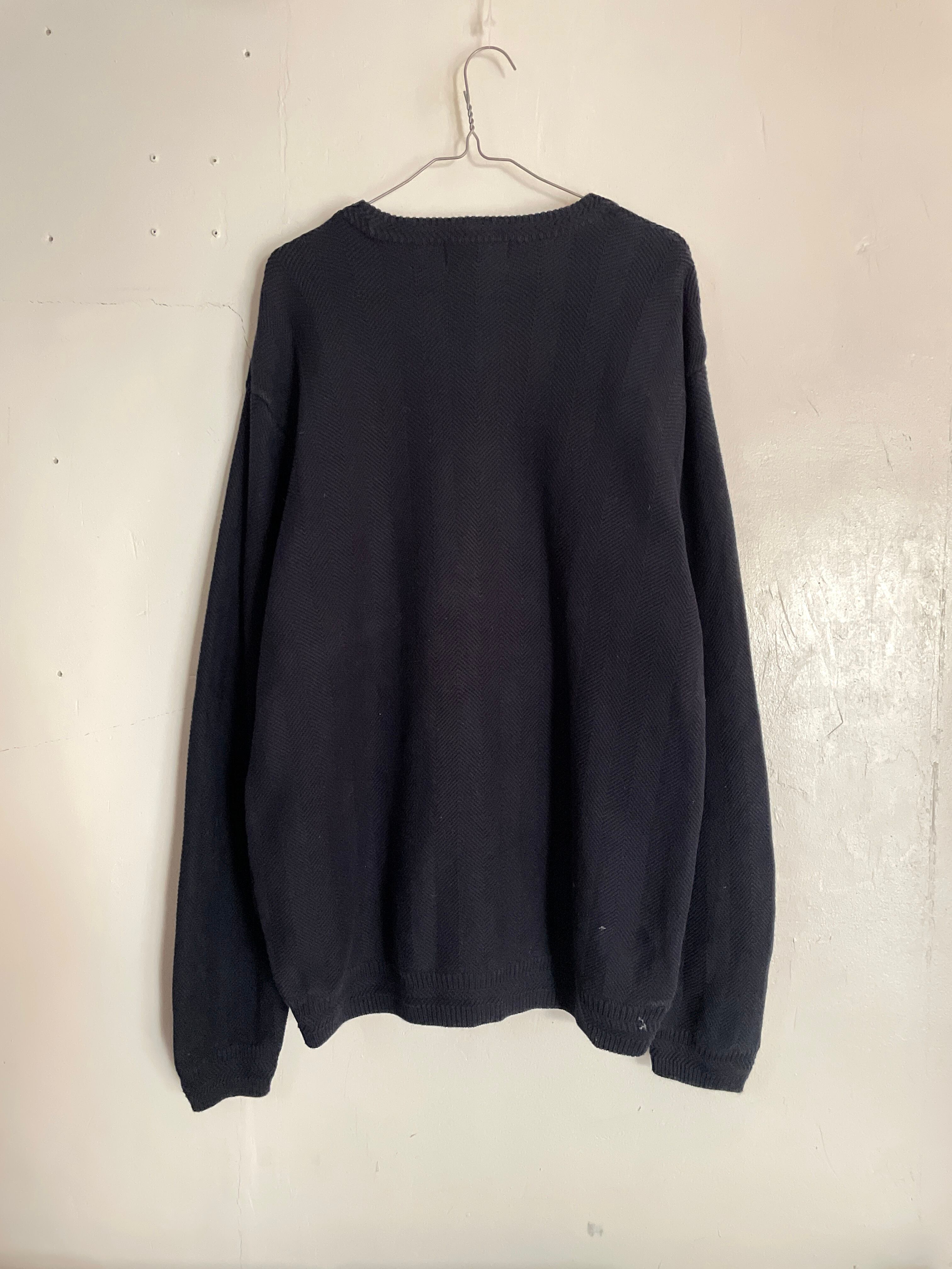 ネイビーカラーでシンプルなデザインの、チャップスコットンニット。左胸にはワンポイントロゴ刺繍、XLでややゆったり目のサイズ感です。ウールやアクリルではないため季節感が出にくく、幅広い時期に着ていただけるかと思います。派手さはありませんが使いやすさはピカイチ。一枚持っていて損はないアイテムかと思います。
