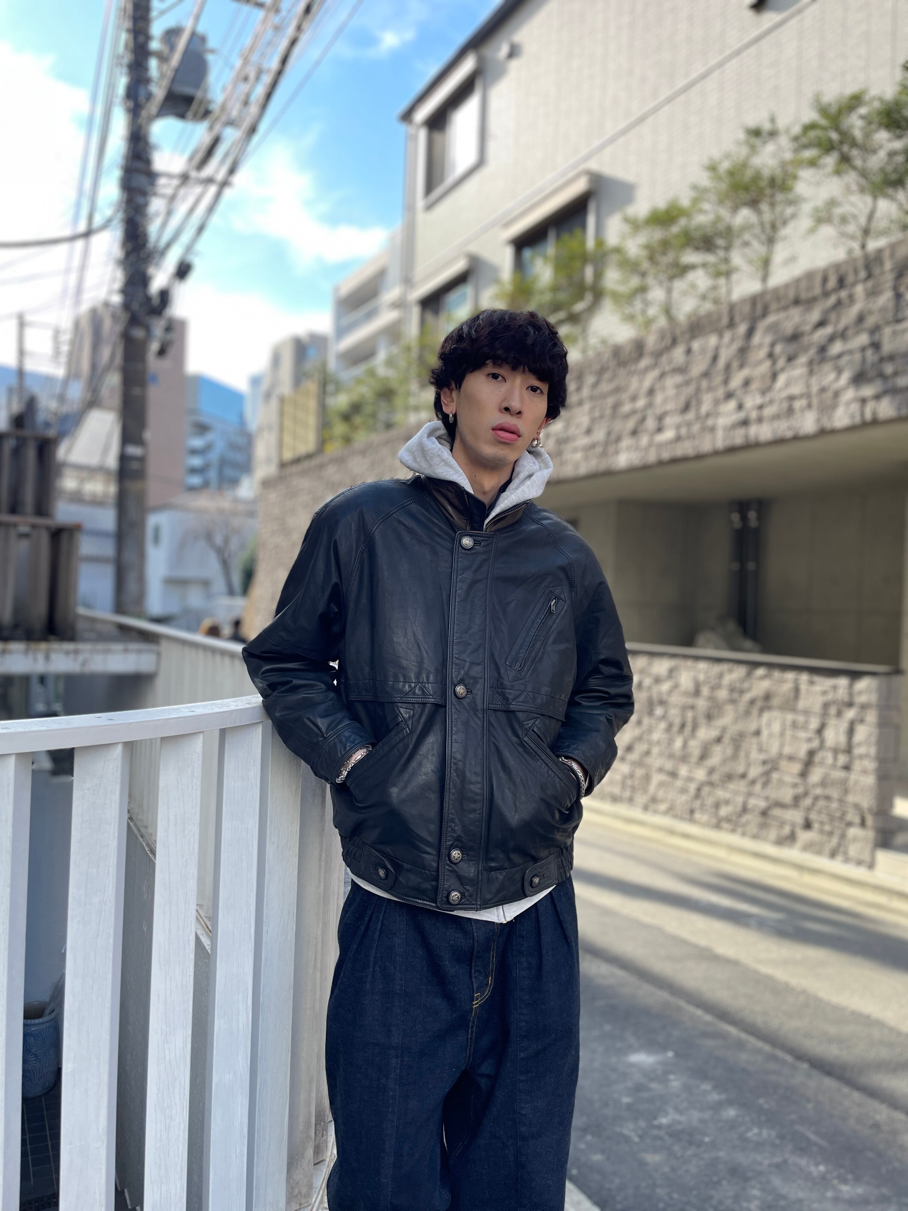 ポケット周りのステッチや、ドローコード入りのブラウンで切り替えられた高めのネックが特徴のレザージャケット。ラグランスリーブで前開きは比翼タイプ、胸部分の斜めのジップポケットもかっこいいです。レザー自体は比較的柔らかく着用しやすいです。丈が長過ぎないのもポイント。存在感のある、個性を出せる一着です。