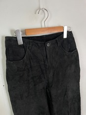 ややスレたブラックカラーで、上品なモチっとした質感の、スエードレザーパンツ。太過ぎず、細過ぎない綺麗なストレートシルエット。普通のレザーパンツと比べて、ストレッチが効いていて、軽く履きやすいかと思います。綺麗めなファッションにはもちろん、カジュアルに落とし込んでもお洒落に履ける一本です。