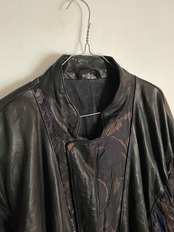 ブラックレザーと、それぞれ違った生地感、柄デザインがドッキングされたデザインジャケット。左右で柄が違っていたりと、アンバランス感のあるお洒落なデザインです。レザー自体はもっちりとした上品な質感です。脇下がかなり深めで、肩が落ちるような抜け感のあるシルエットです。ミステリアスな雰囲気のある、珍しいジャケットかと思います。遊び心があって、ファッションの主役になってくれるアイテムです。