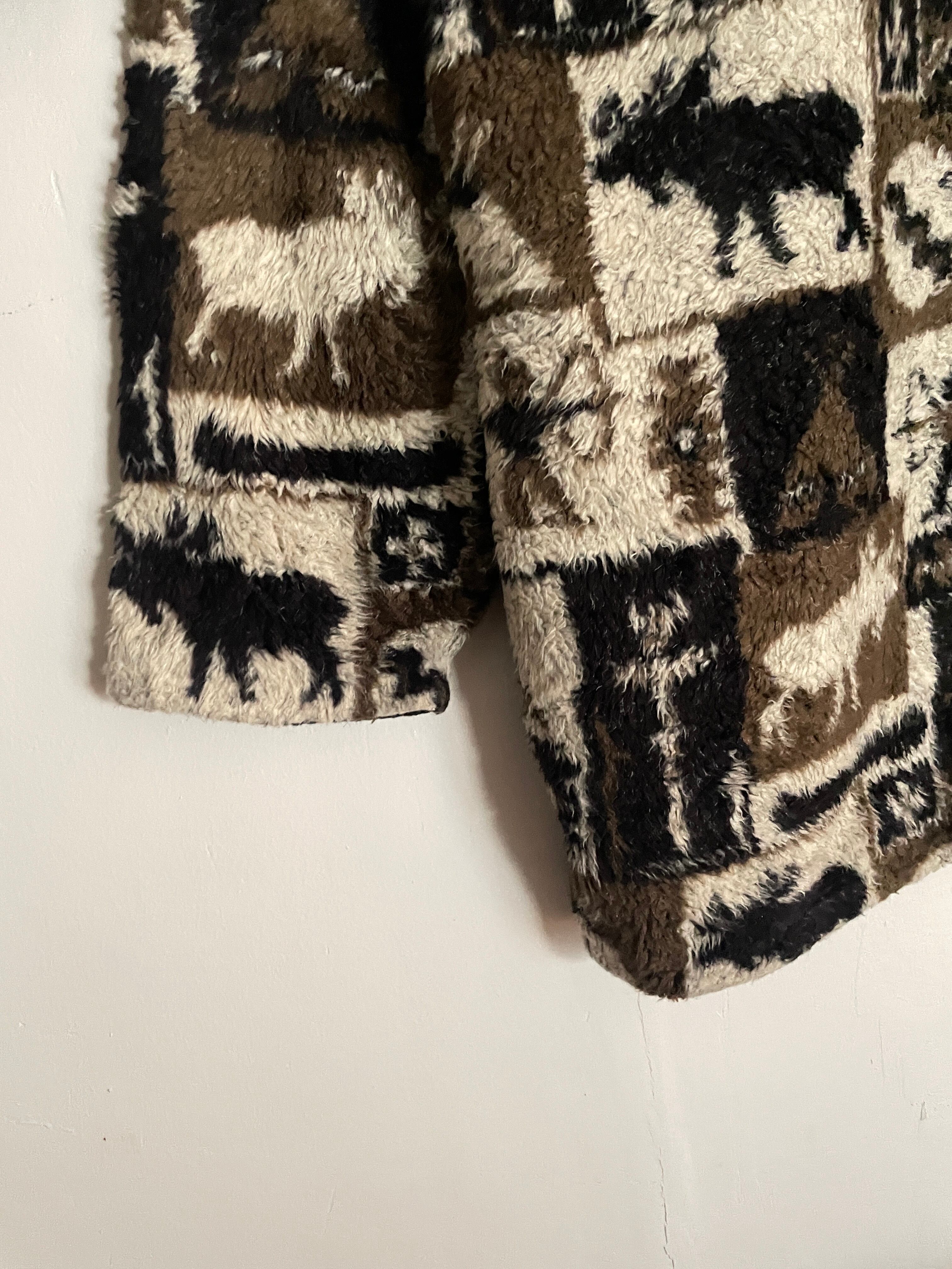ブラウン、ブラック、ホワイトの3カラーボディに、民族調の柄デザインが全体に施された、ボアフリースジップジャケット。毛足の長いアクリルとポリ素材。肌触り抜群な上品な質感です。まさに冬仕様。丈が長めなシルエットですが、裾にはドローコード付きで、気分で丈感を調節可能です。間違いなく今の時期に活躍してくれる冬ジャケットです。