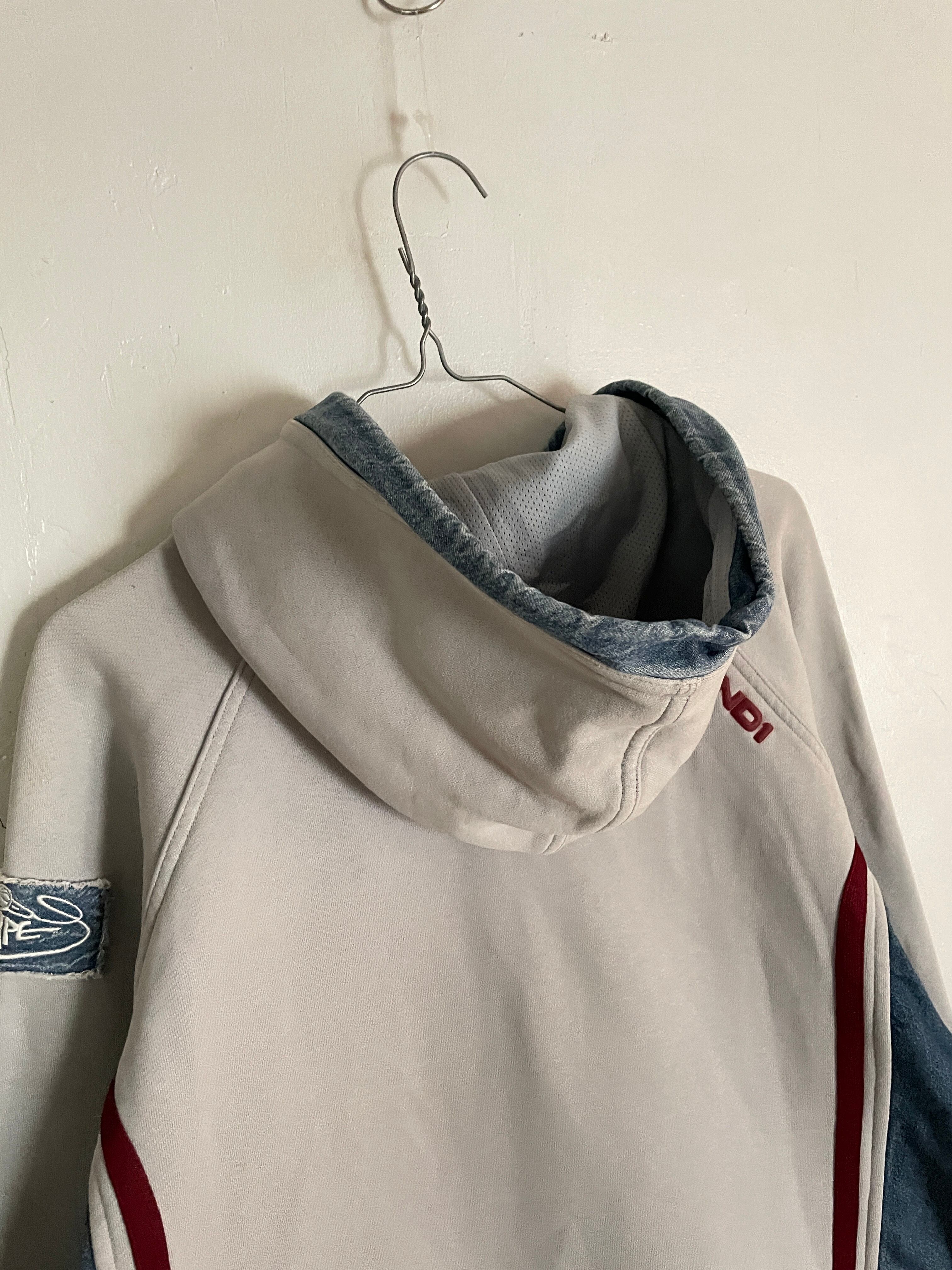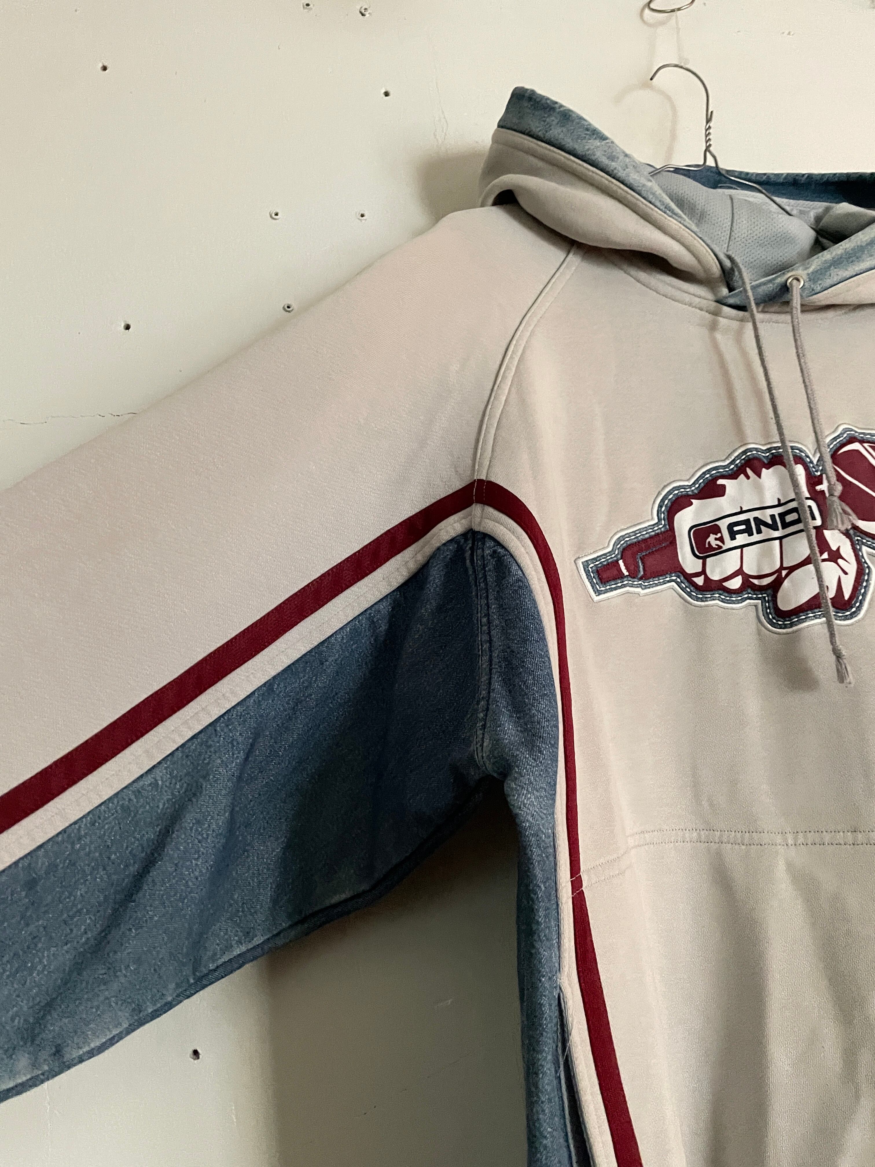 アメリカで93年に誕生した、バスケットボールウェアブランド”アンドワン”のパーカー。ヒップホップな雰囲気を感じられるディテール。フロント部分にはY2Kっぽさのあるインパクト大のワッペンデザイン。何と言ってもデニムとの切り返しがお洒落です。しっかりとした生地感で、風も通しにくく、ゆったりとしたビッグサイズ。男女共におすすめしたい一着です。デザイン性に長けたアイテムです。