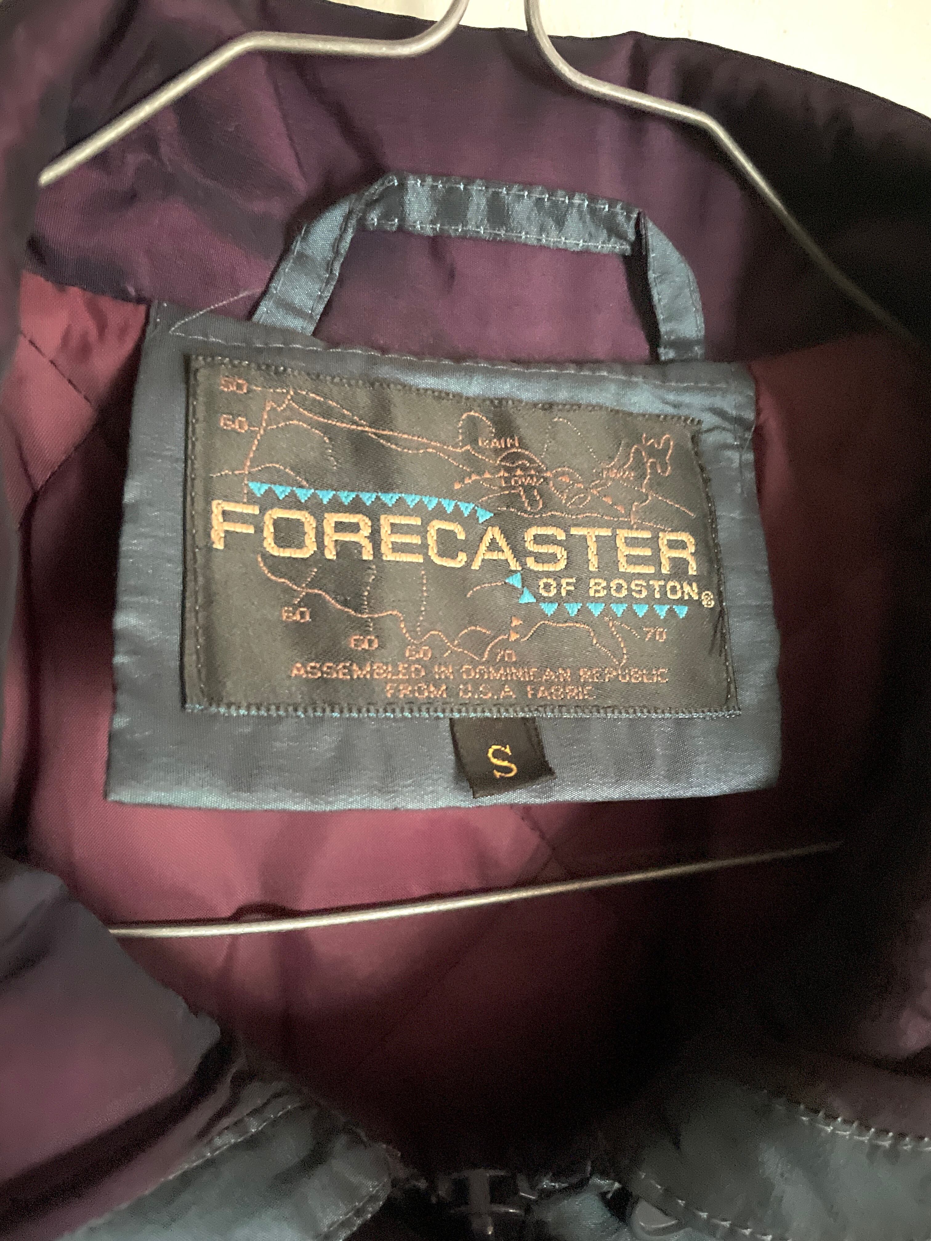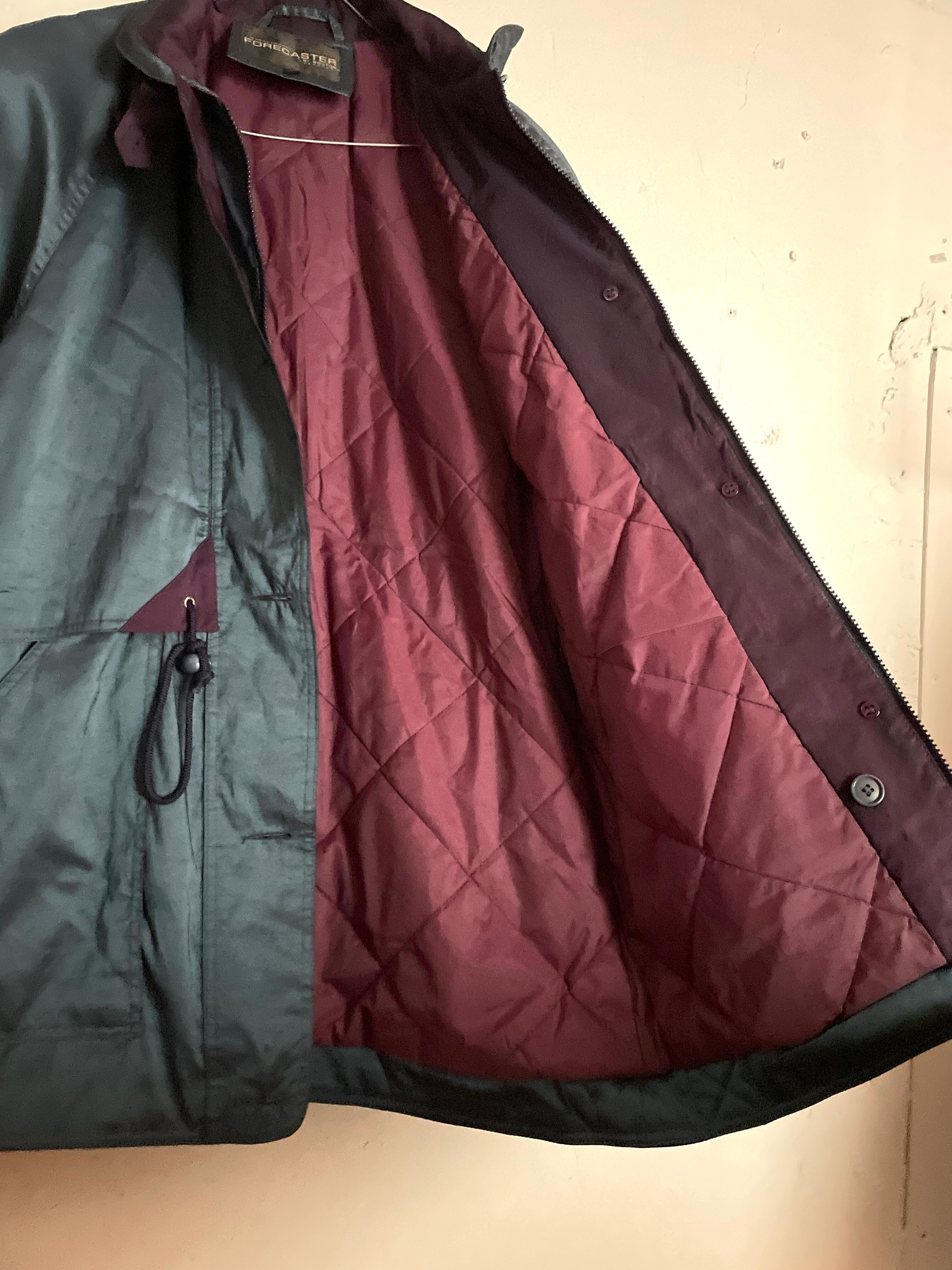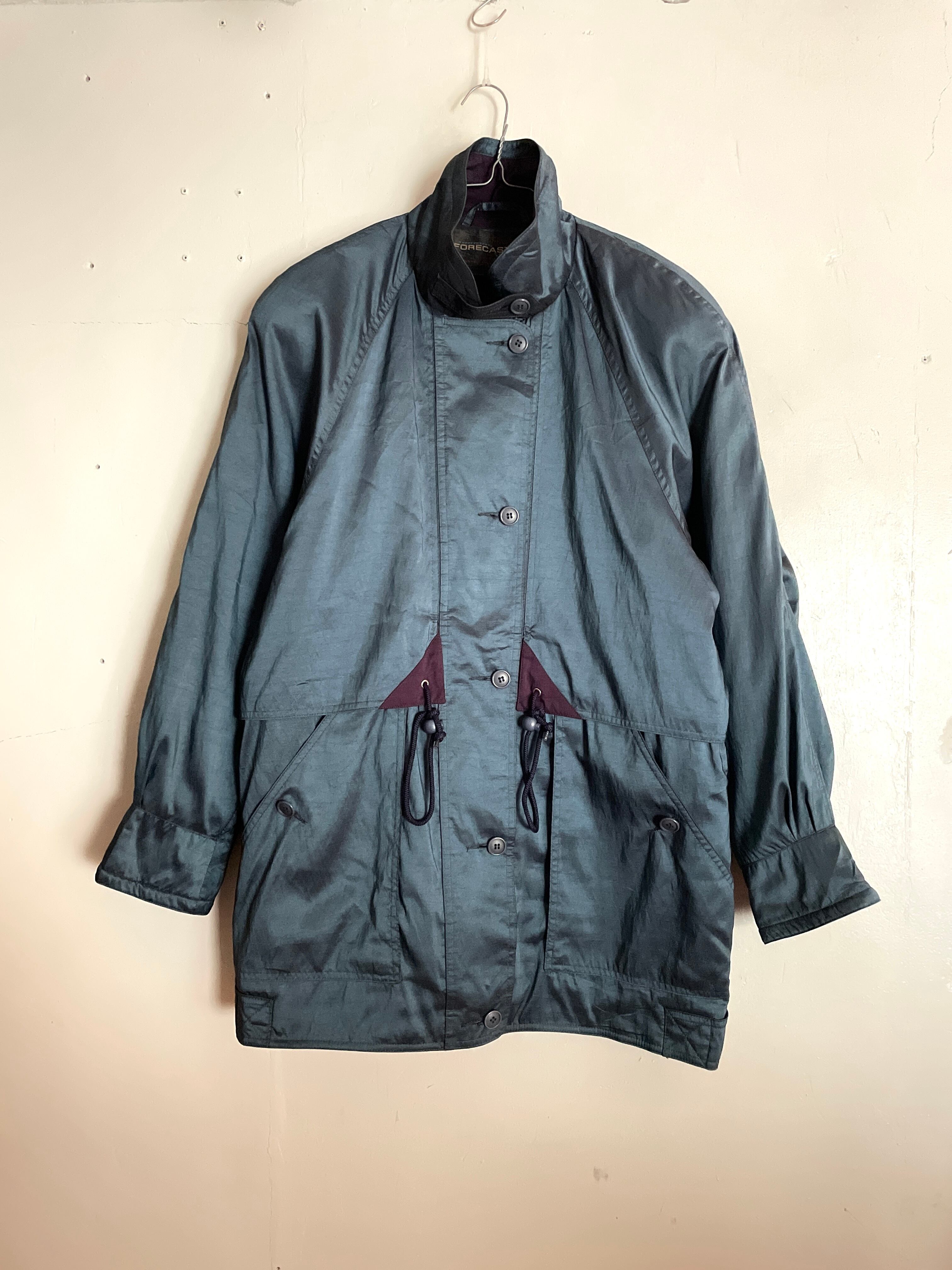 玉虫がかったグリーンのナイロン素材で、やや着丈が長めなデザインジャケット。前開きは比翼仕立てで、チンストラップ付きの高めのネック、ウエスト部分にはドローコードが入っていてシルエットに変化を与えることもできます。中綿入りで軽い着心地、程良くデザインされたお洒落な一着です。本来上下どちらからも開閉可能なダブルジップだったようですが、下側ファスナーのトップが破損しているため上下開閉不可となっています。