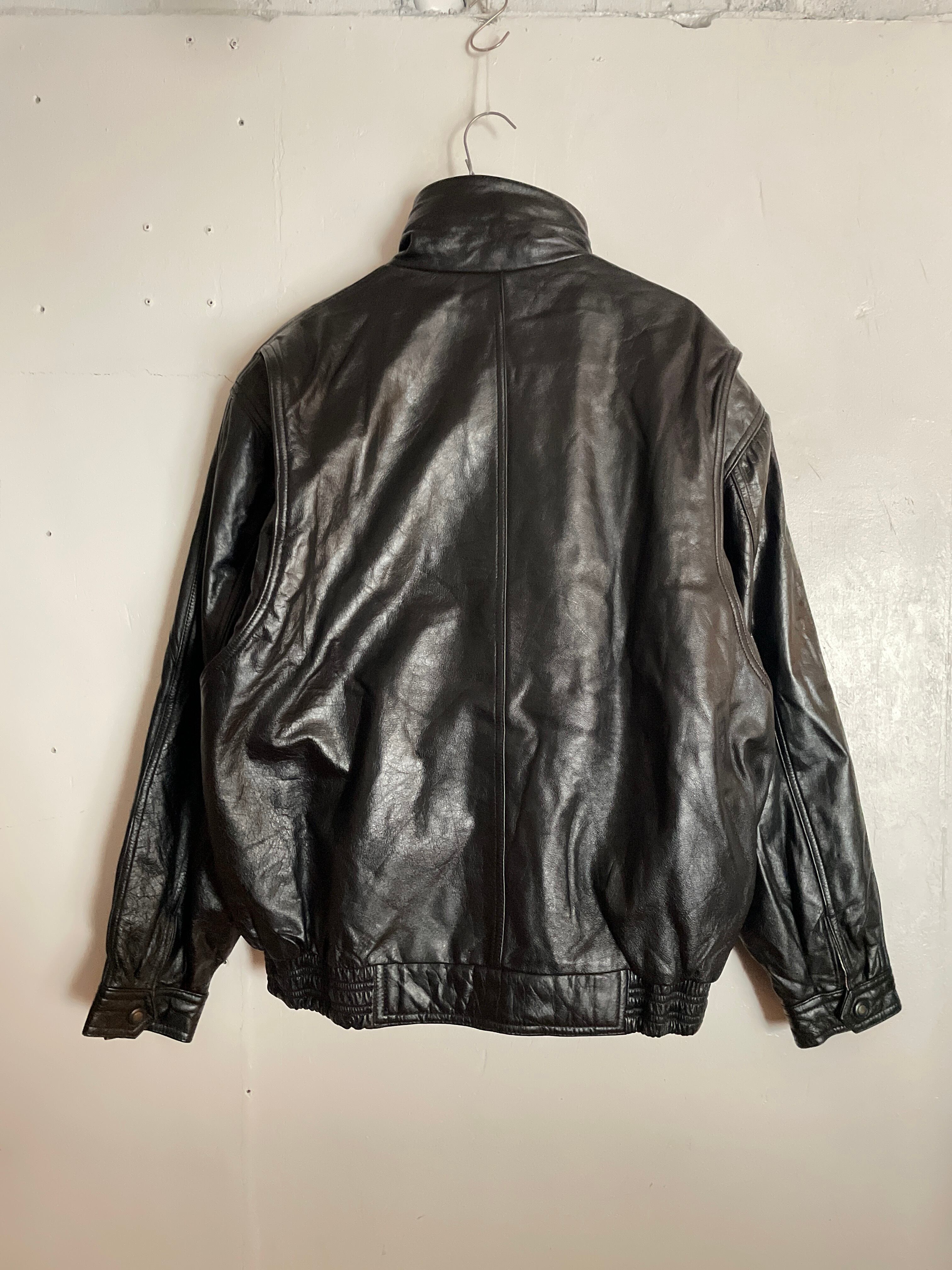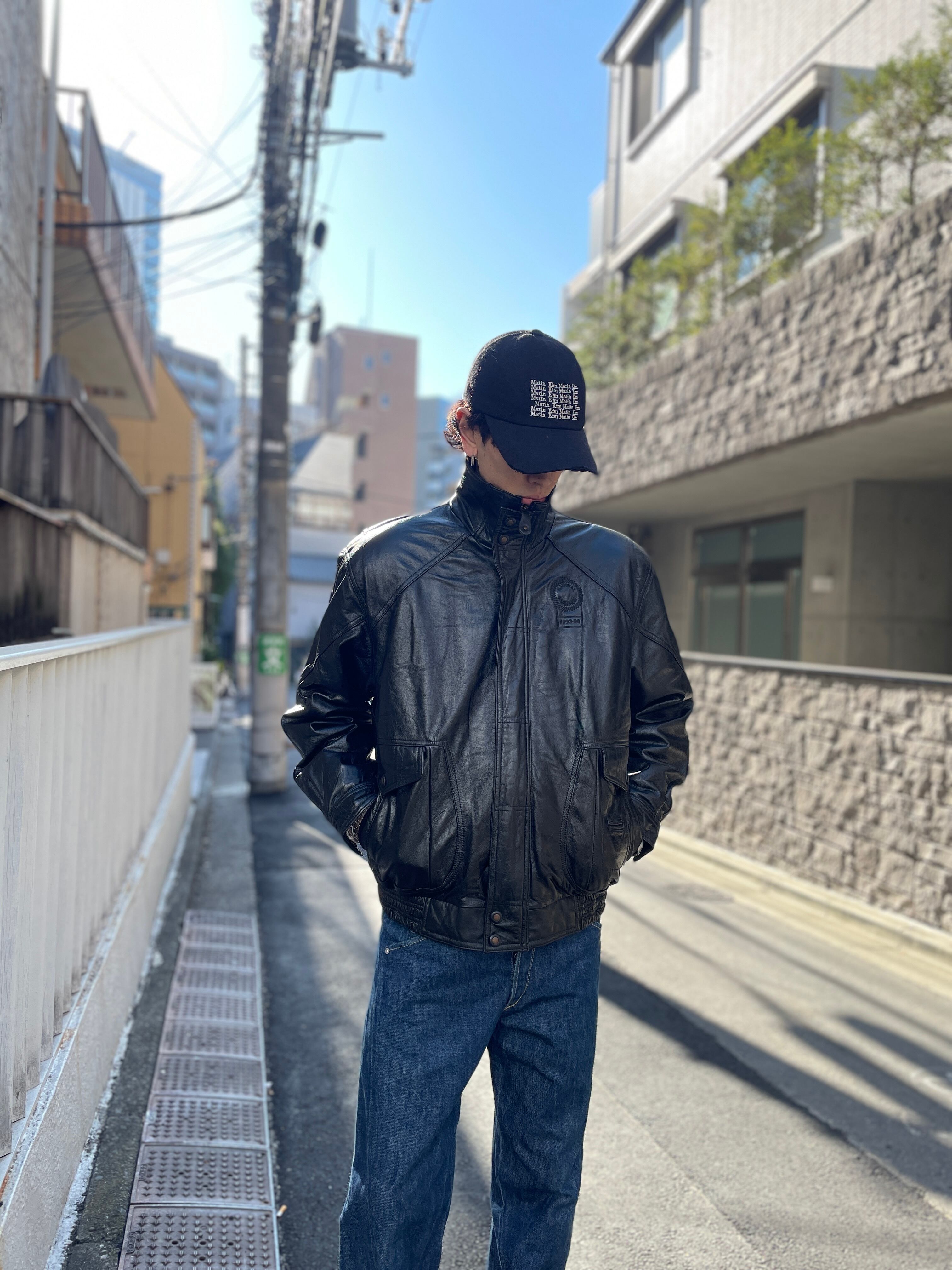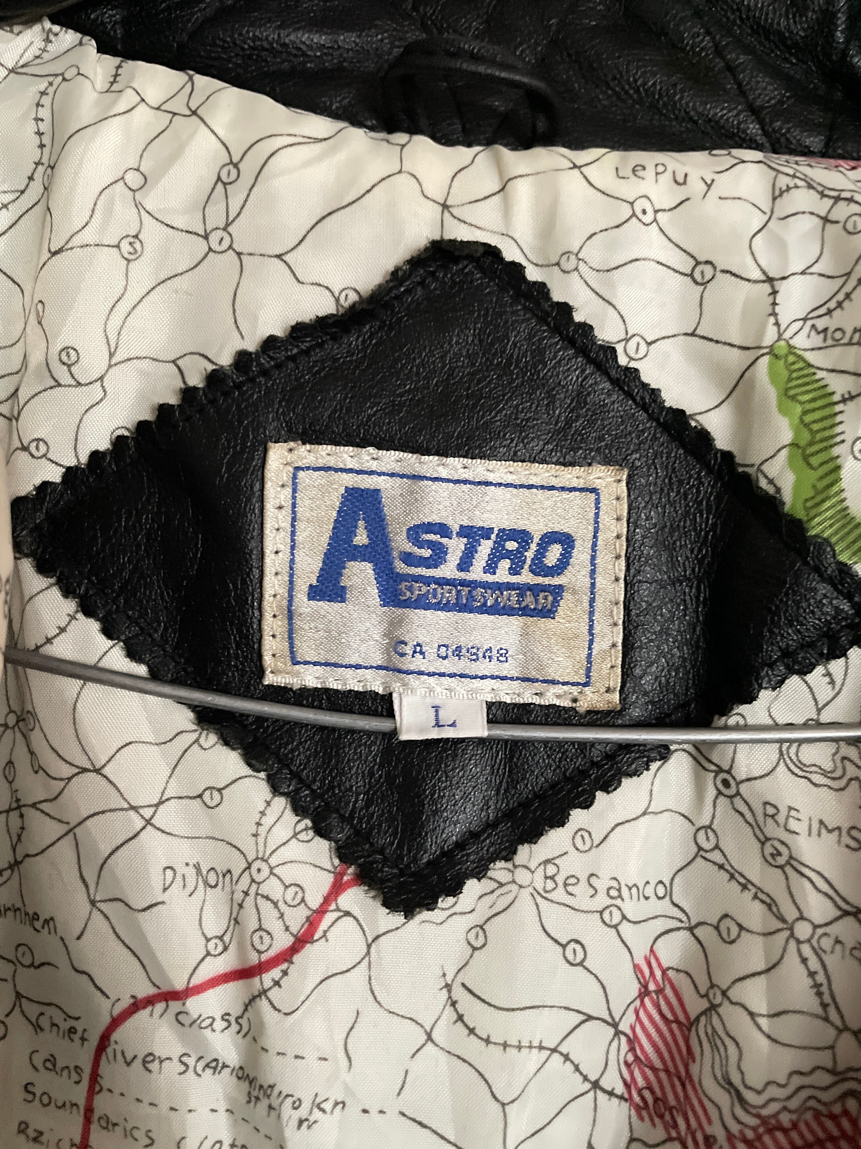 高めの襟で、カーブしたポケット部分の切替えデザインが特徴的なレザージャケット。フラップポケットとサイドポケット、左側のみ小さなコインポケットも付いています。左胸には黒糸で刺繍有り、「NATIONAL CHAMPION」とありますが、何のチャンピオンなんでしょうか?笑 地図柄の裏地もいいアクセントになっています。