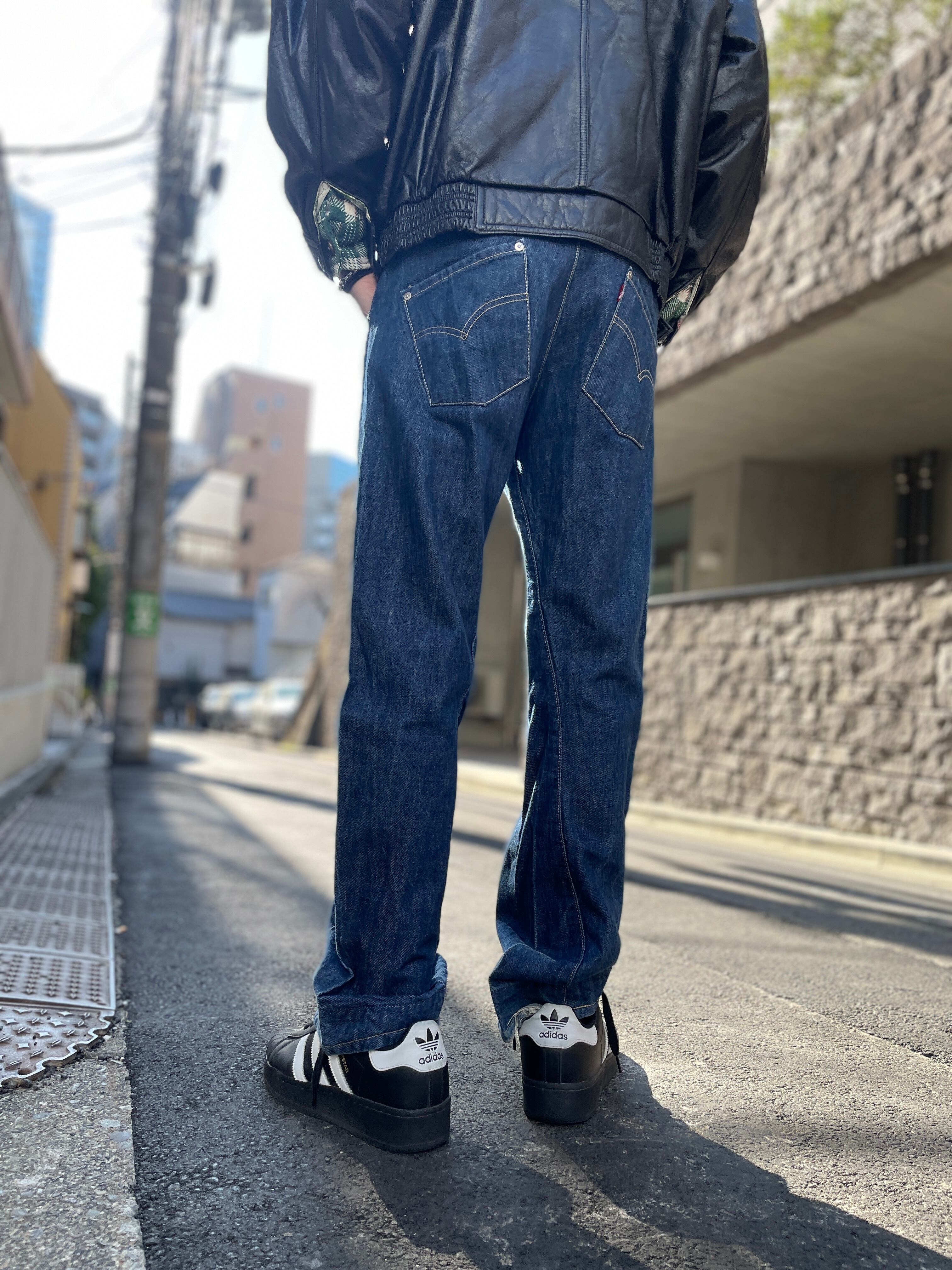 左右のサイドシームが大きく内側に捩れているデザインが特徴的な、リーバイスのエンジニアドジーンズ。リーバイスレッドからインスパイアされたシリーズです。普通のデニムは縫い目や折り目は真っ直ぐですが、このパンツは斜めに縫われているので、より脚にフィットして履き心地に優れたパンツです。裾部分は前の方がやや長かったりと、少し変わったデニムをお探しの方にはおすすめしたい一本です。
