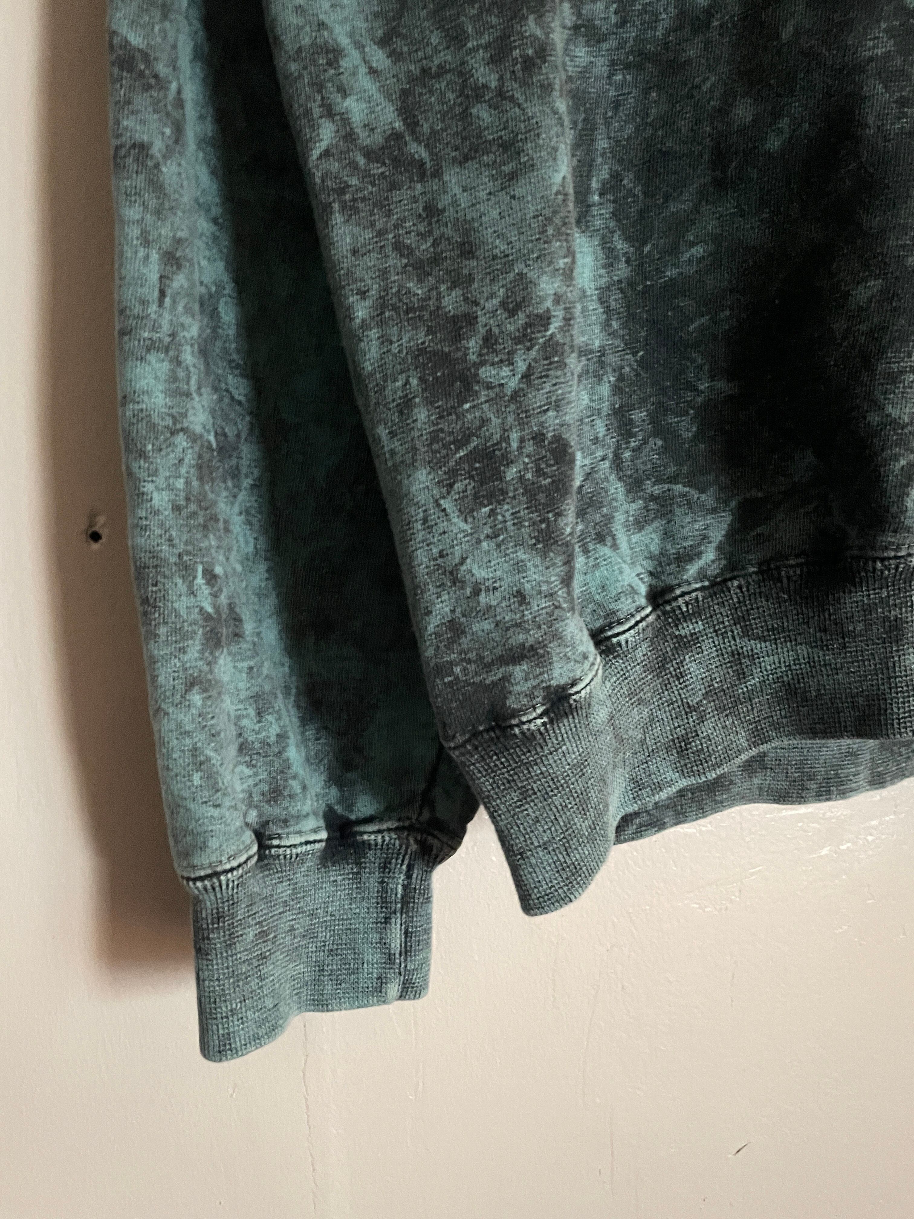 ブリーチ染が施された、雰囲気のあるグリーンとブラックボディに、リアルなカエルがプリントされたスウェット。両面プリントで、それぞれ違ったポーズなのが面白いです笑 真ん中からズレたプリントの位置なども絶妙でセンスが感じられます。ややスレたプリントも雰囲気を感じます。ゆったりと着られるサイズ感で、男女共におすすめしたいお洒落なスウェットです。