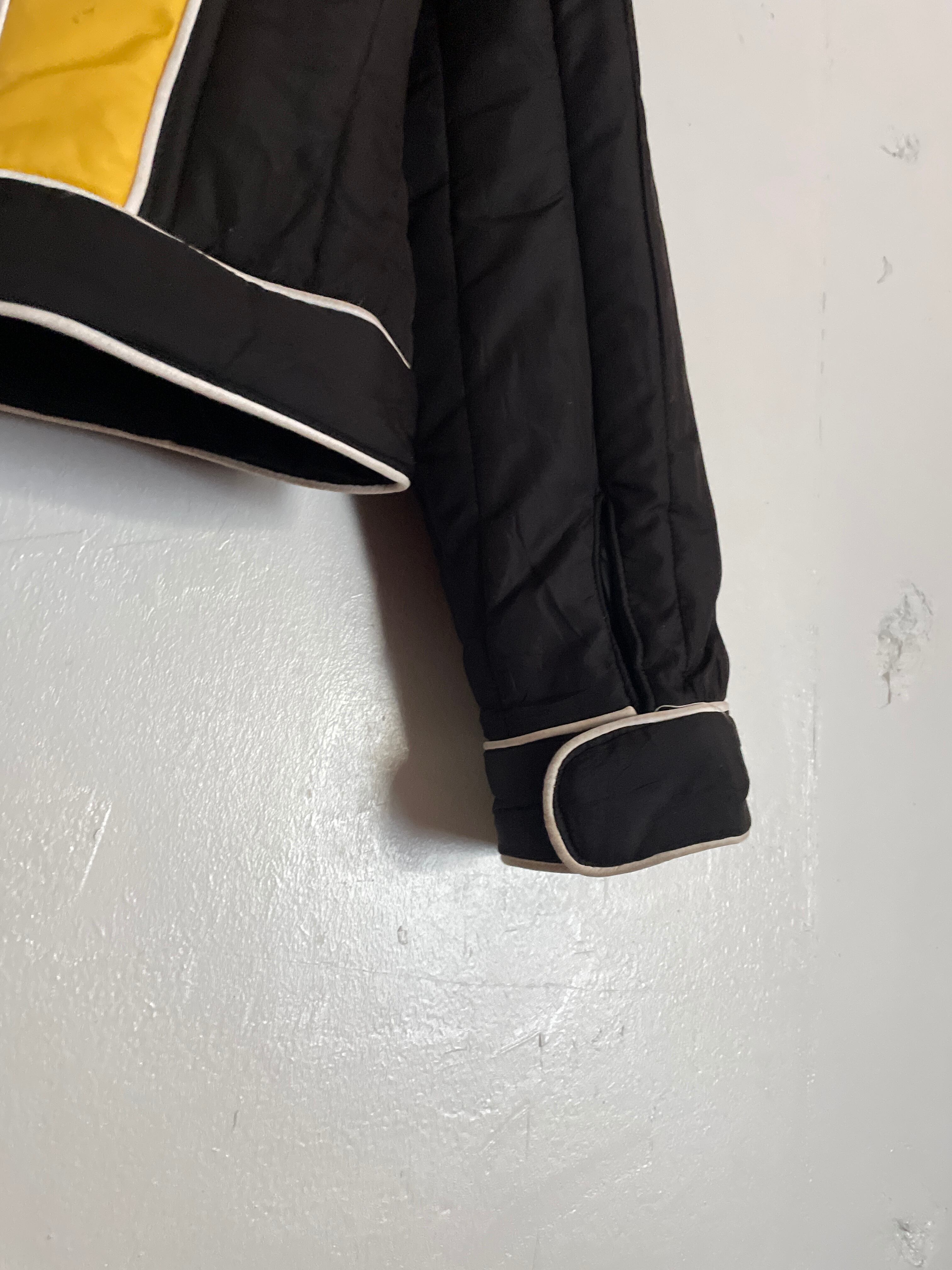 黒に黄色の切替えデザイン、中綿入りで短丈デザインのモーターサイクルジャケット。所々ワッペンも付いて可愛らしいです。とても軽く楽な着心地、無骨なイメージのあるモーターサイクルジャケットですが、こちらはポップな印象でラフに着ていただけます。体に沿うタイトめシルエット。