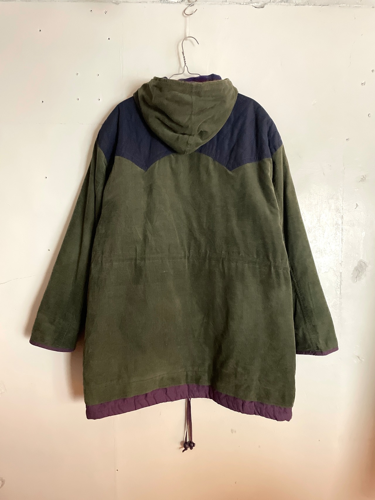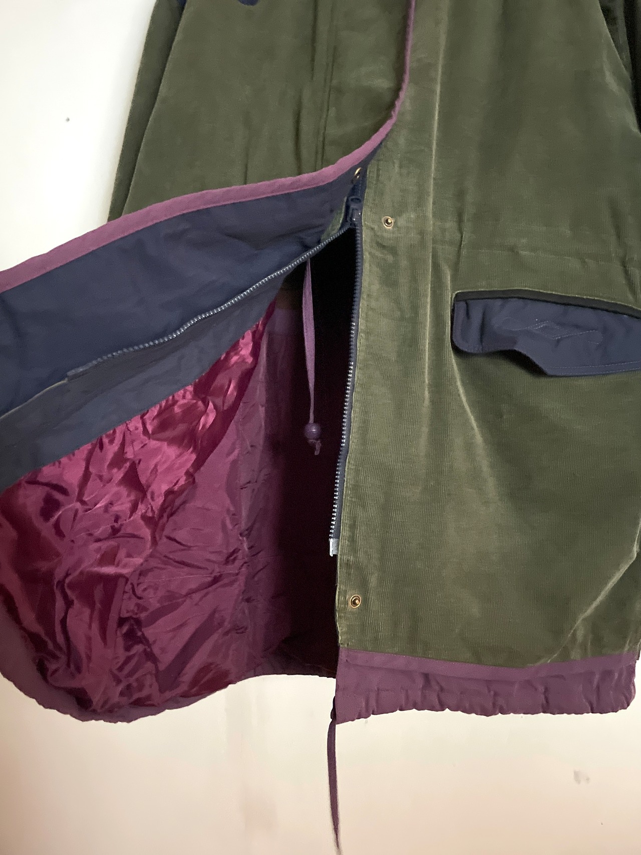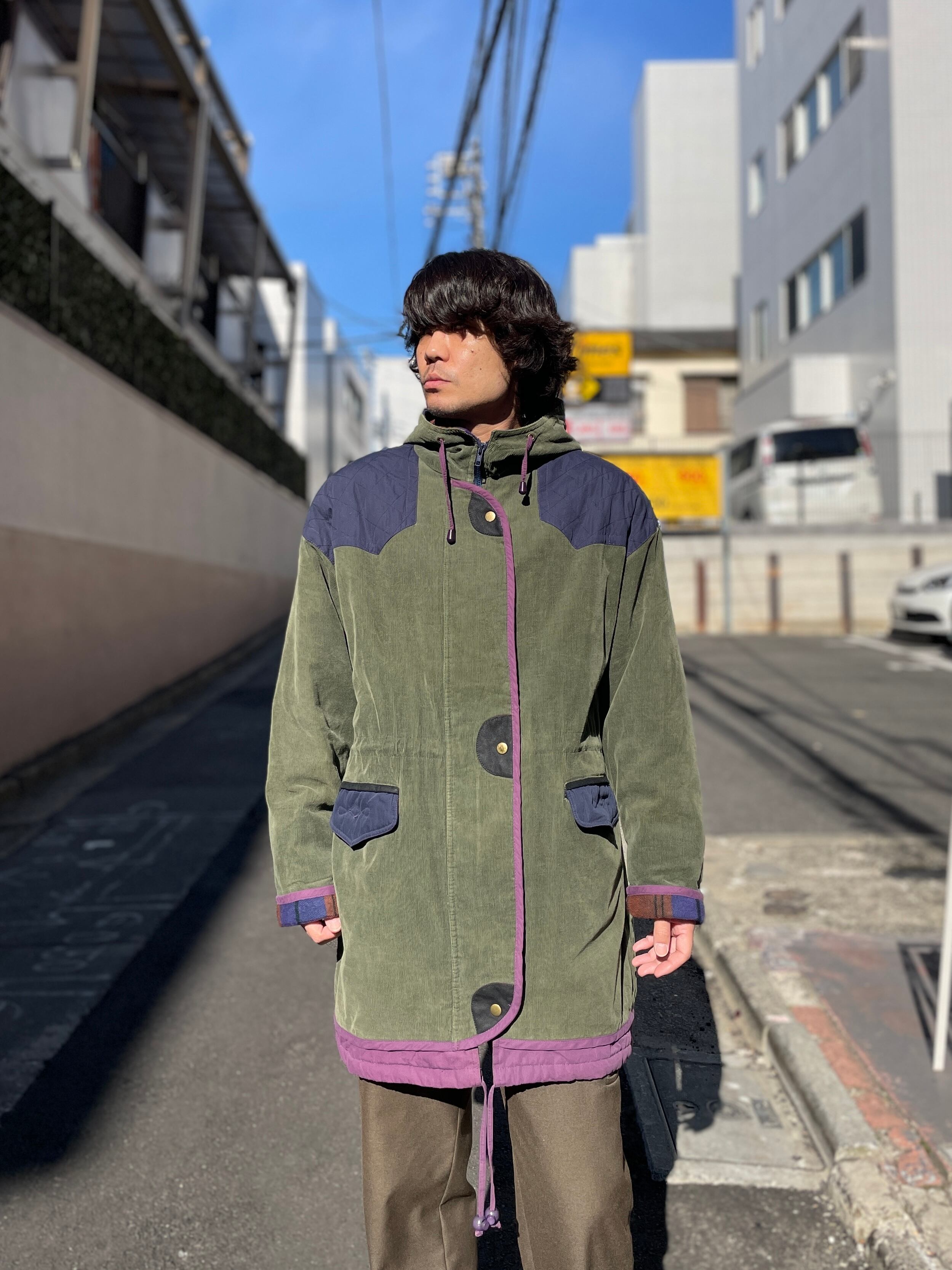 グリーンのコーデュロイ素材で、ネイビーの切替えとパープルの部分使いがお洒落なフード付きコート。若干の中綿入りで弾力があり、軽くて暖かい一着です。ポケットのフラップ部分に刺繍が施されていたり、裏地上部分にはチェックが使われていたりと細かい仕様。袖口を折ることでチェックがチラッと見えて可愛いです。やり過ぎていない気の利いたデザインが個性的なコート。前開きは上下どちらからも開閉可能なダブルジップです。