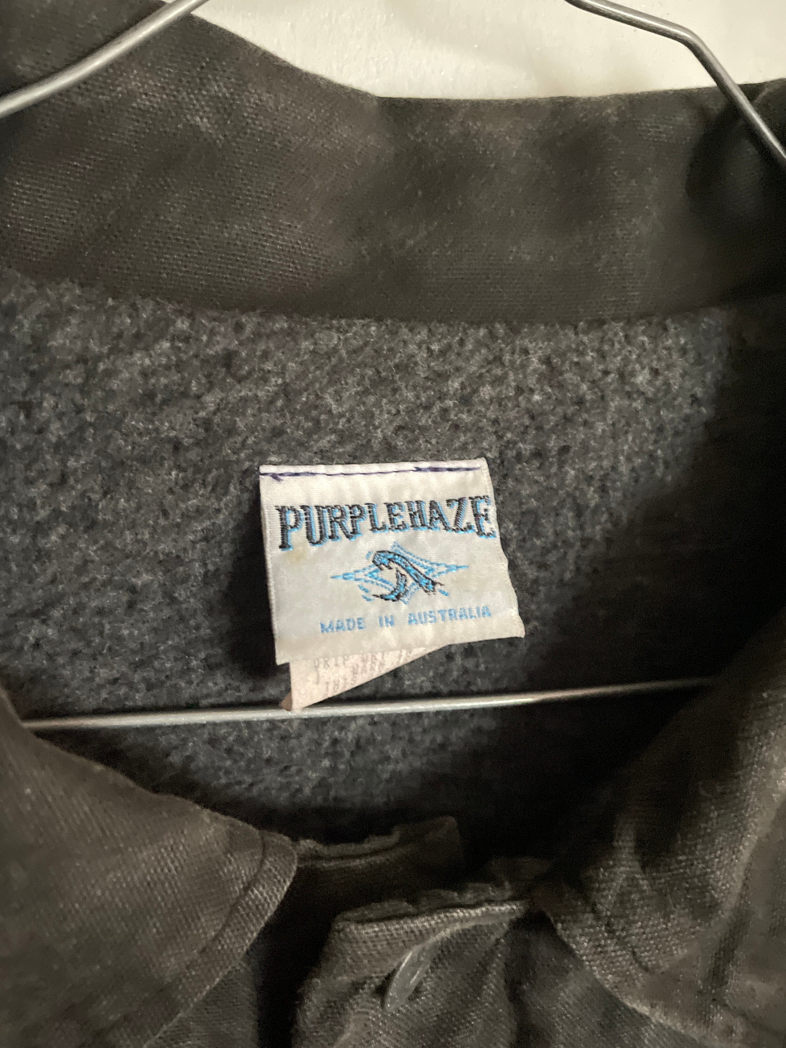 褪せ感のあるグレーカラーでデニムジャケットのようなデザインのコットンジャケット。ウォッシュ加工を施したような独特の色味で、裏地にはコットン・ポリのフリース素材が使われています。サイドポケットに胸のフラップポケット。見た目よりもずっと軽く暖かい、身幅のある着丈短めのシルエット。ブランド名の「PURPLE HAZE」もカッコいいです。