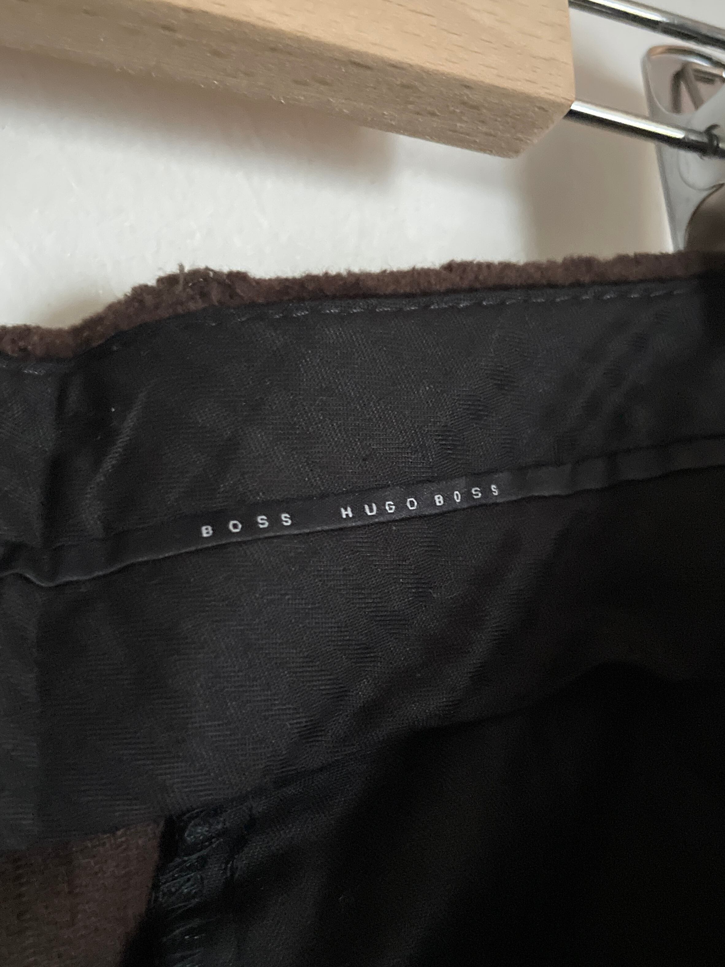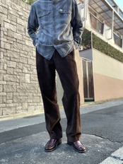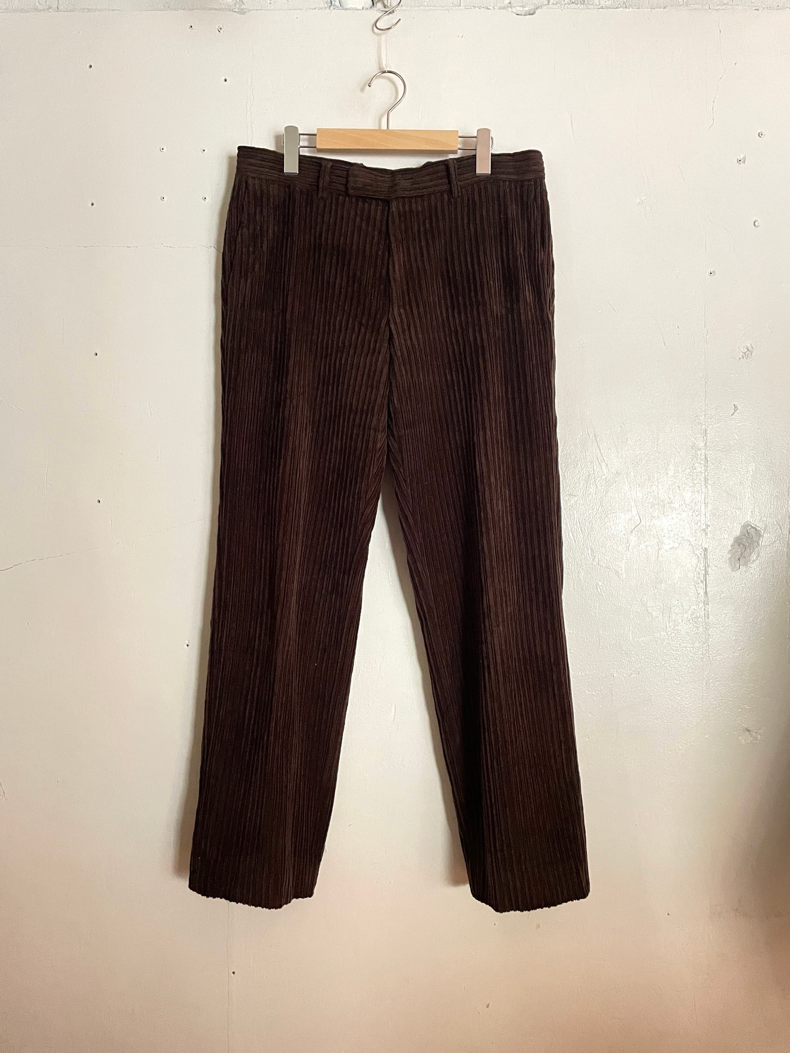 一般的なコーデュロイよりやや太畝のコーデュロイが特徴的な、ヒューゴ・ボスのスラックス。タックは入らず、裾に向かって緩めにテーパードした綺麗なシルエットです。濃いめのブラウンで暖かみのある秋冬を感じられる色合い。素材が潰れていることもなく、コンディションは良好です。